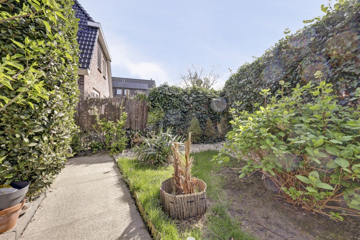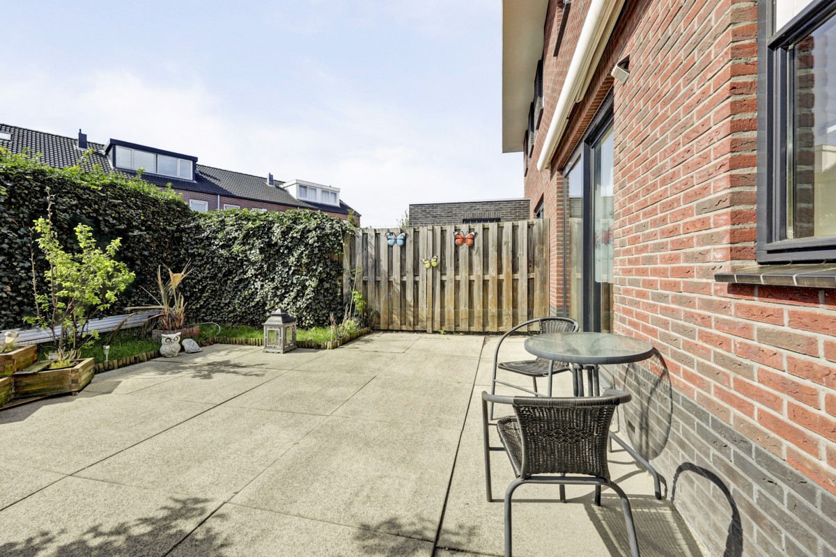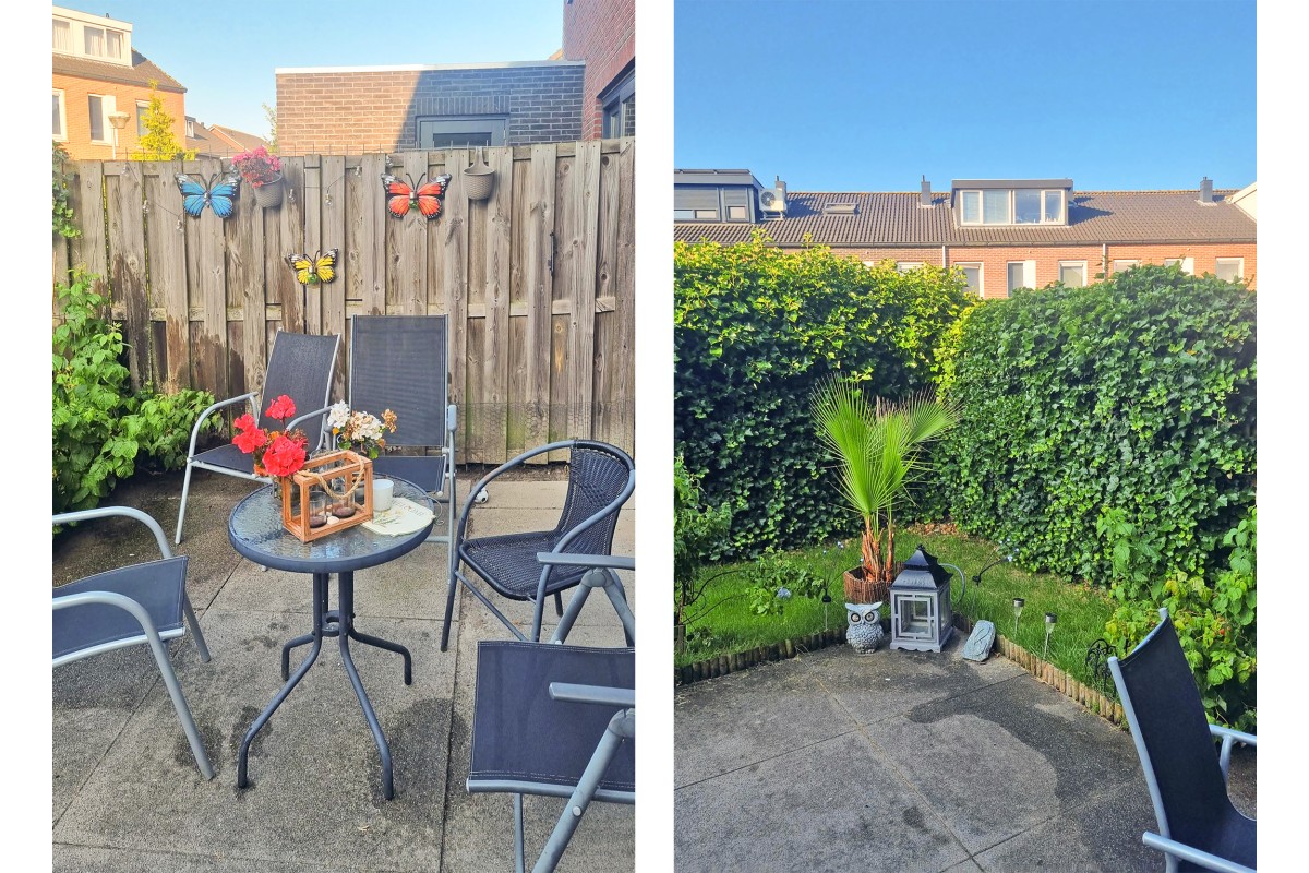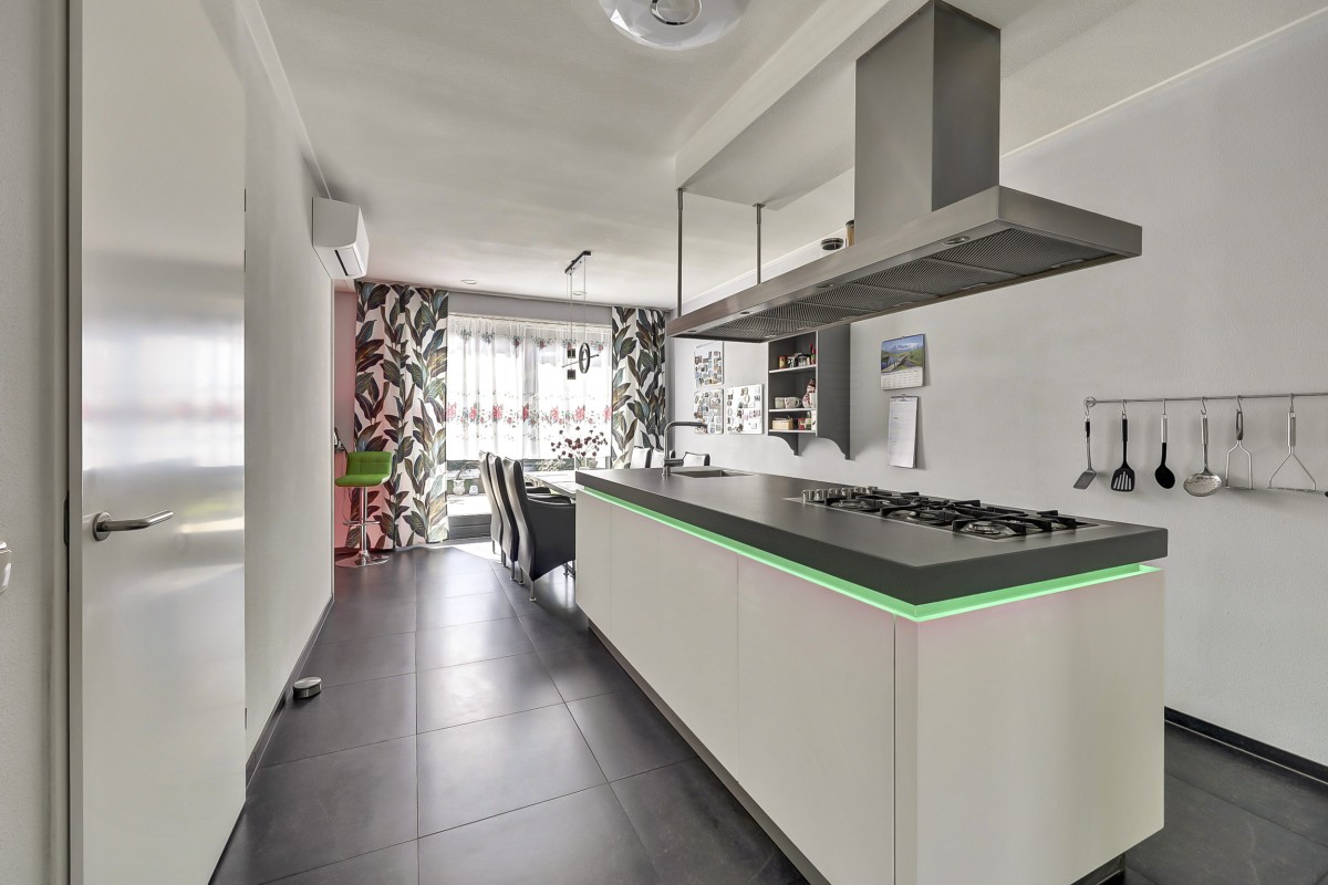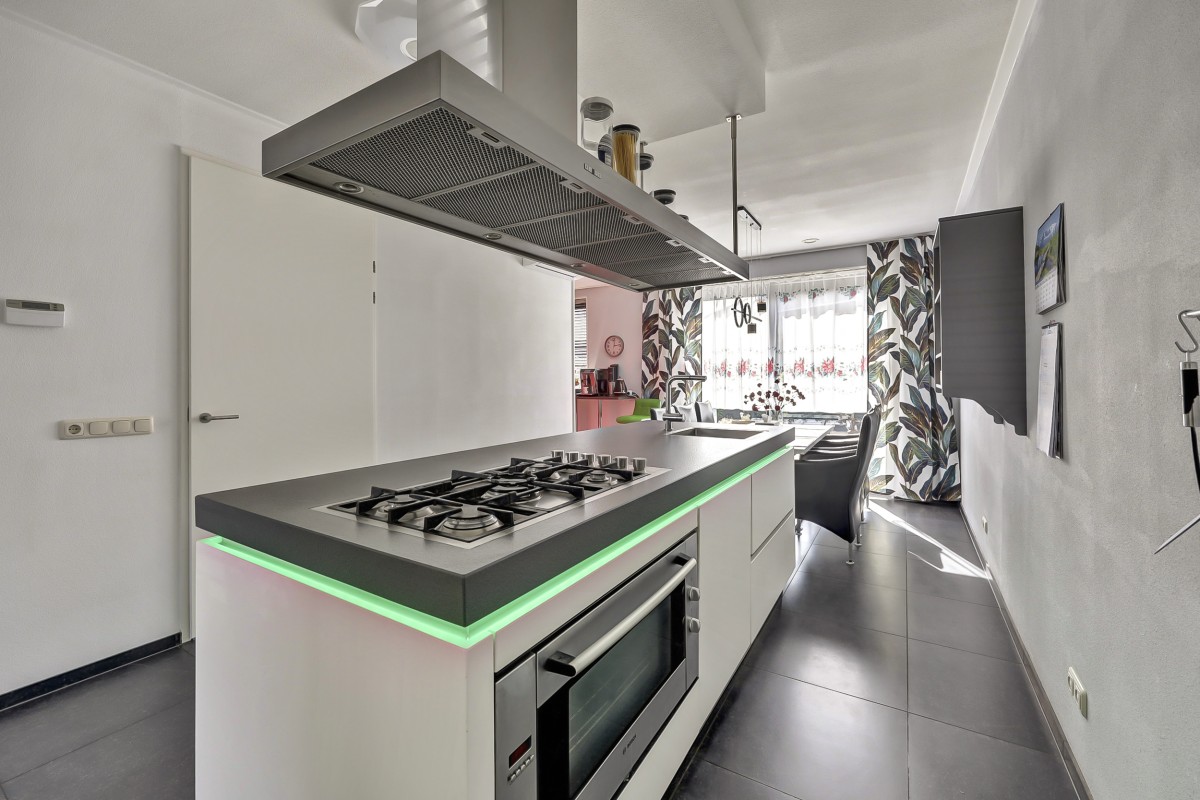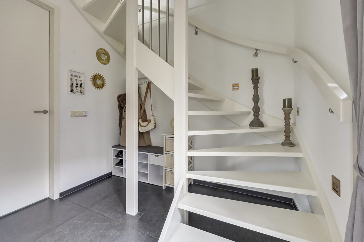 Lees verderCozy eat-in kitchen with luxury fitted kitchen equipped with built-in refrigerator, oven, dishwasher, spacious 5-burner gas hob, and stainless steel extractor hood. Around the corner, a charming coffee bar has been created, along with a built-in wardrobe with sliding doors offering ample storage space. This is also where the central heating boiler (Intergas HR) is located. The attached garage is accessible from the kitchen via an internal door. The spacious garage features a concrete floor with a new coating (2026), a utility sink with hot and cold water connections, a pedestrian door to the garden, and an electrically operated sectional door. The ground floor features a beautiful stone floor with underfloor heating and a low-maintenance wall finish. The beautifully landscaped south-facing garden can be accessed from the kitchen via sliding doors. The garden offers a terrace with an awning, various borders with perennial plants interspersed with grass and decorative gravel.