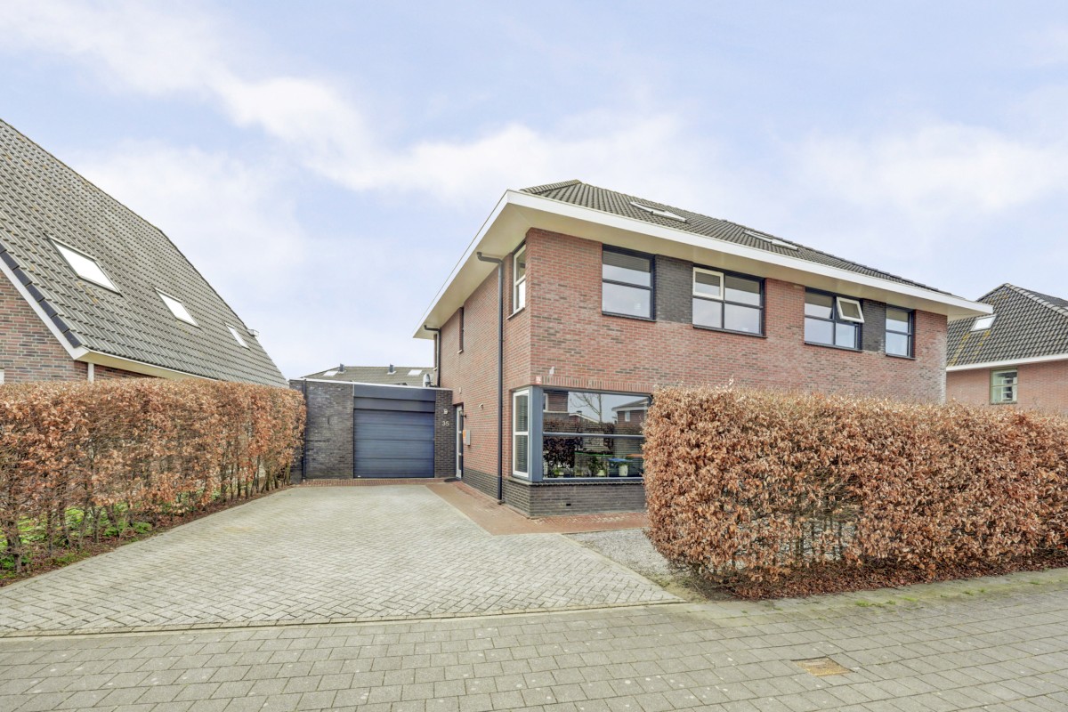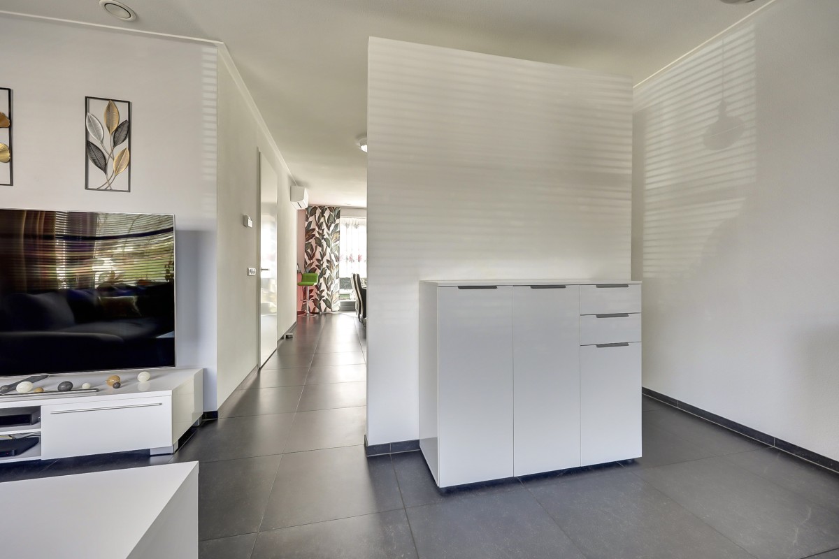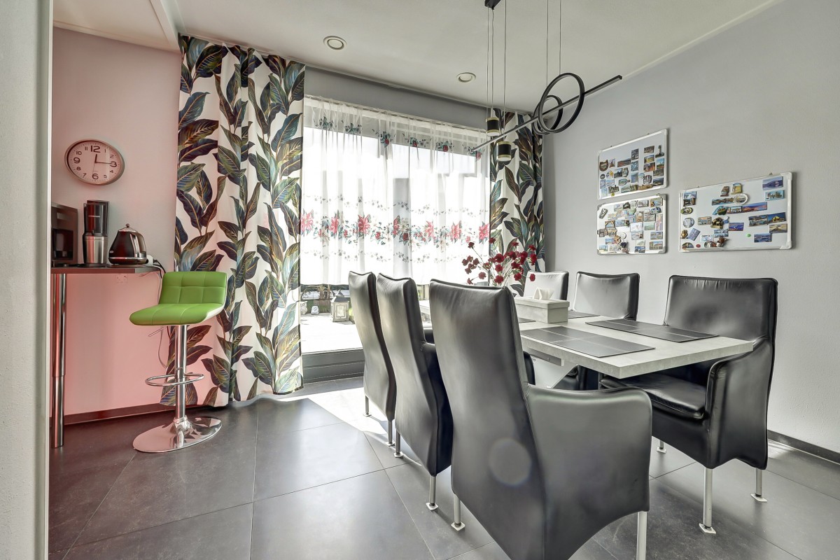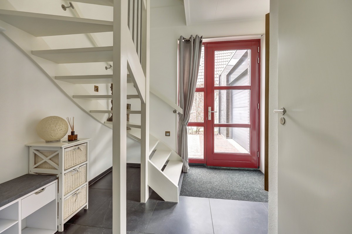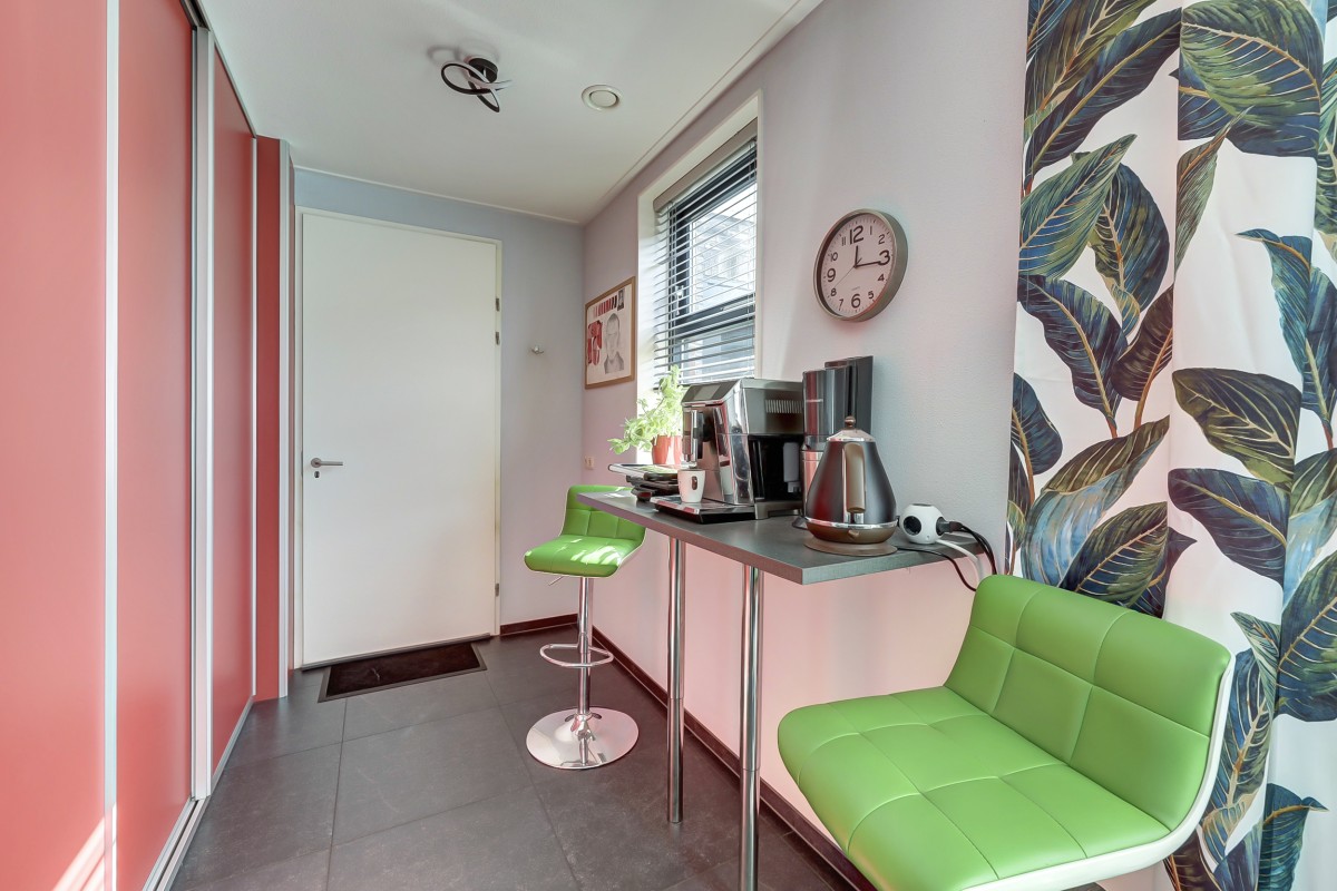 Lees verderCozy eat-in kitchen with luxury fitted kitchen equipped with built-in refrigerator, oven, dishwasher, spacious 5-burner gas hob, and stainless steel extractor hood. Around the corner, a charming coffee bar has been created, along with a built-in wardrobe with sliding doors offering ample storage space. This is also where the central heating boiler (Intergas HR) is located. The attached garage is accessible from the kitchen via an internal door. The spacious garage features a concrete floor with a new coating (2026), a utility sink with hot and cold water connections, a pedestrian door to the garden, and an electrically operated sectional door. The ground floor features a beautiful stone floor with underfloor heating and a low-maintenance wall finish. The beautifully landscaped south-facing garden can be accessed from the kitchen via sliding doors. The garden offers a terrace with an awning, various borders with perennial plants interspersed with grass and decorative gravel.