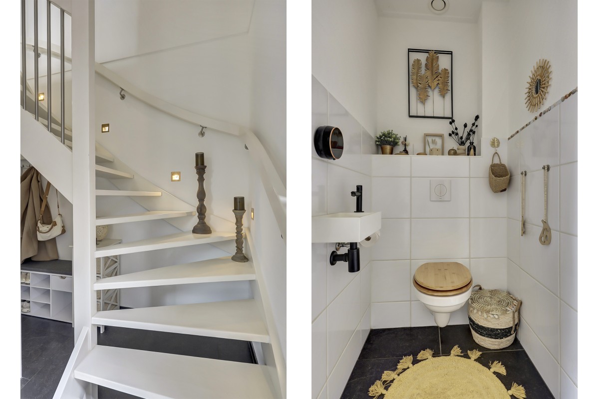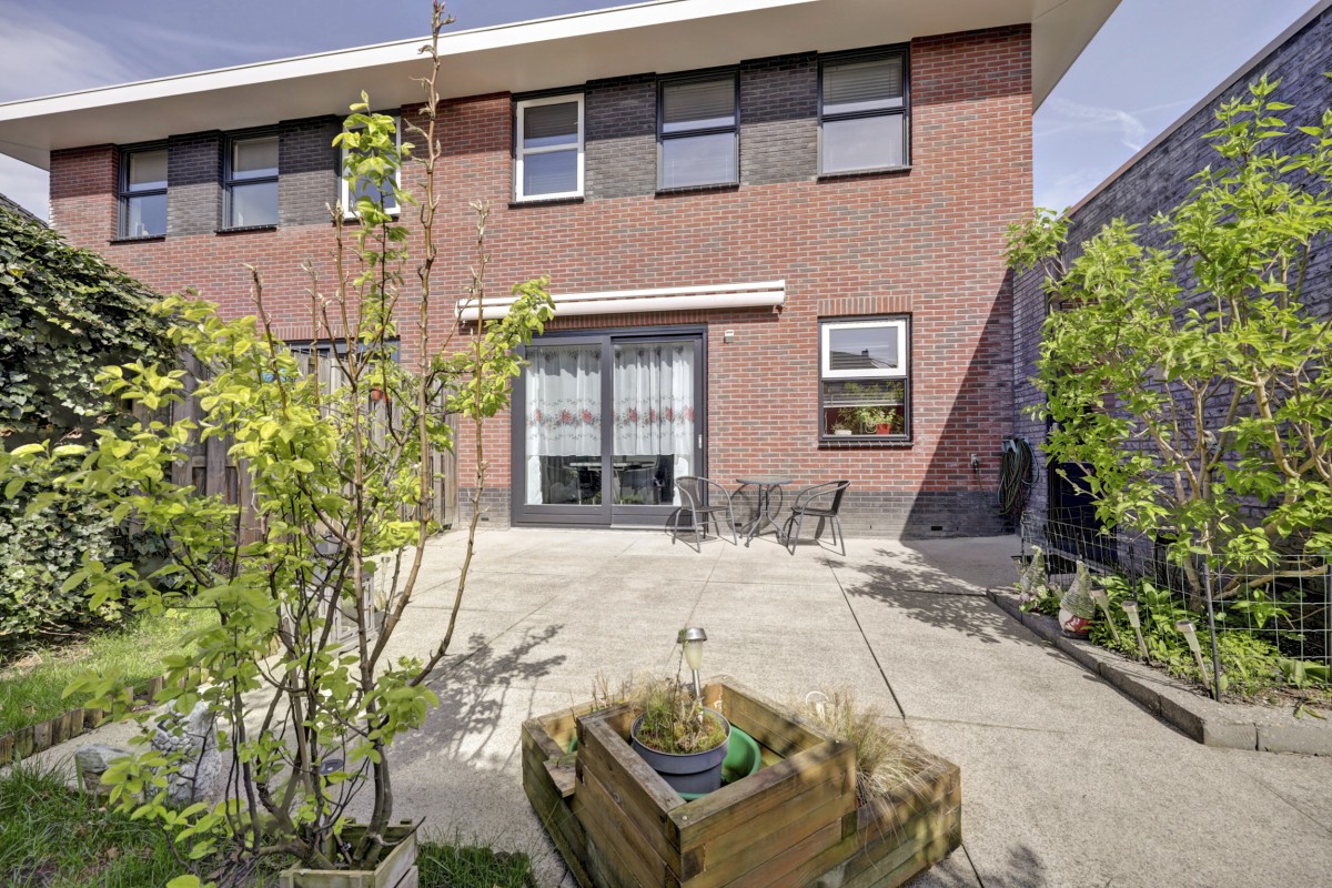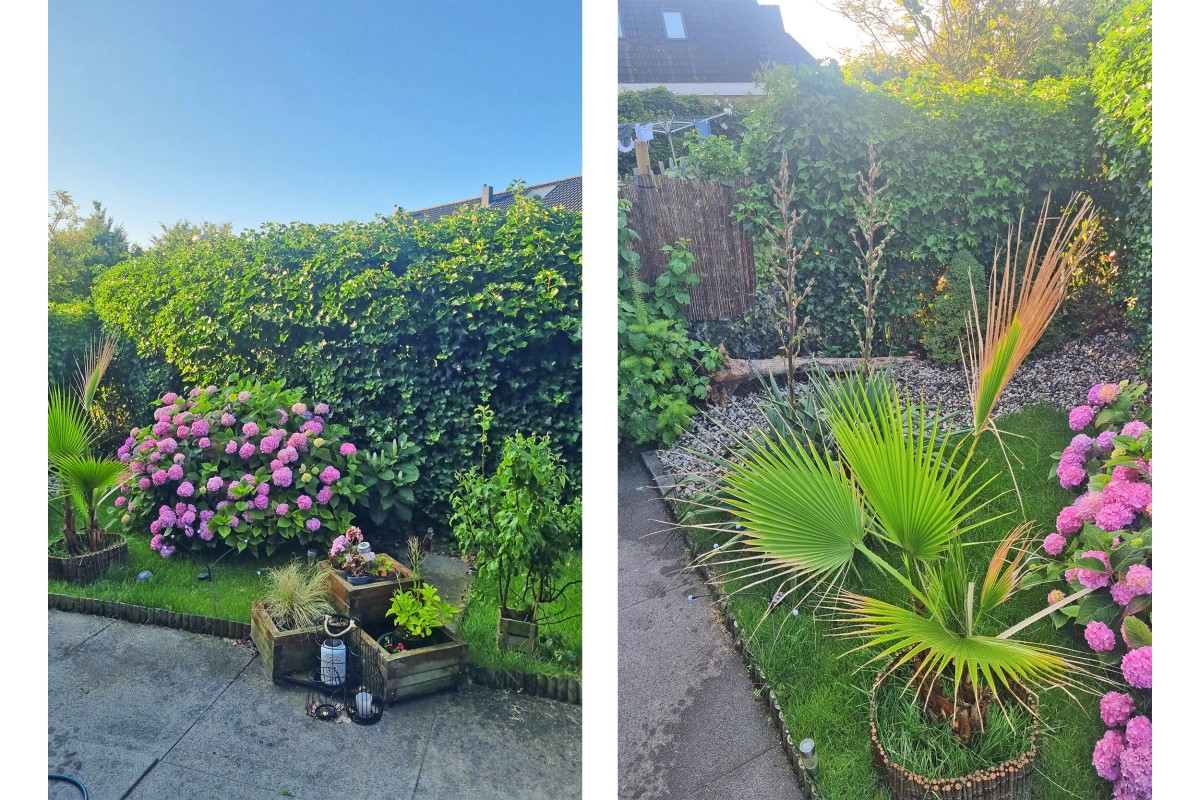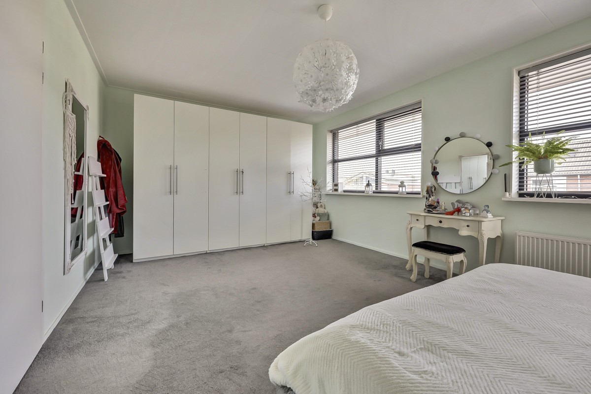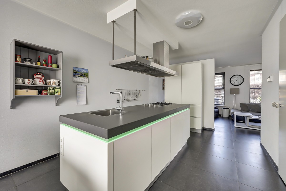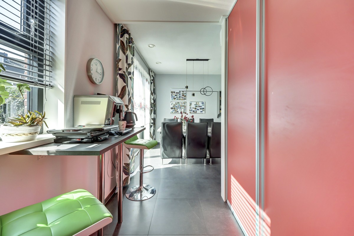 Lees verderCozy eat-in kitchen with luxury fitted kitchen equipped with built-in refrigerator, oven, dishwasher, spacious 5-burner gas hob, and stainless steel extractor hood. Around the corner, a charming coffee bar has been created, along with a built-in wardrobe with sliding doors offering ample storage space. This is also where the central heating boiler (Intergas HR) is located. The attached garage is accessible from the kitchen via an internal door. The spacious garage features a concrete floor with a new coating (2026), a utility sink with hot and cold water connections, a pedestrian door to the garden, and an electrically operated sectional door. The ground floor features a beautiful stone floor with underfloor heating and a low-maintenance wall finish. The beautifully landscaped south-facing garden can be accessed from the kitchen via sliding doors. The garden offers a terrace with an awning, various borders with perennial plants interspersed with grass and decorative gravel.