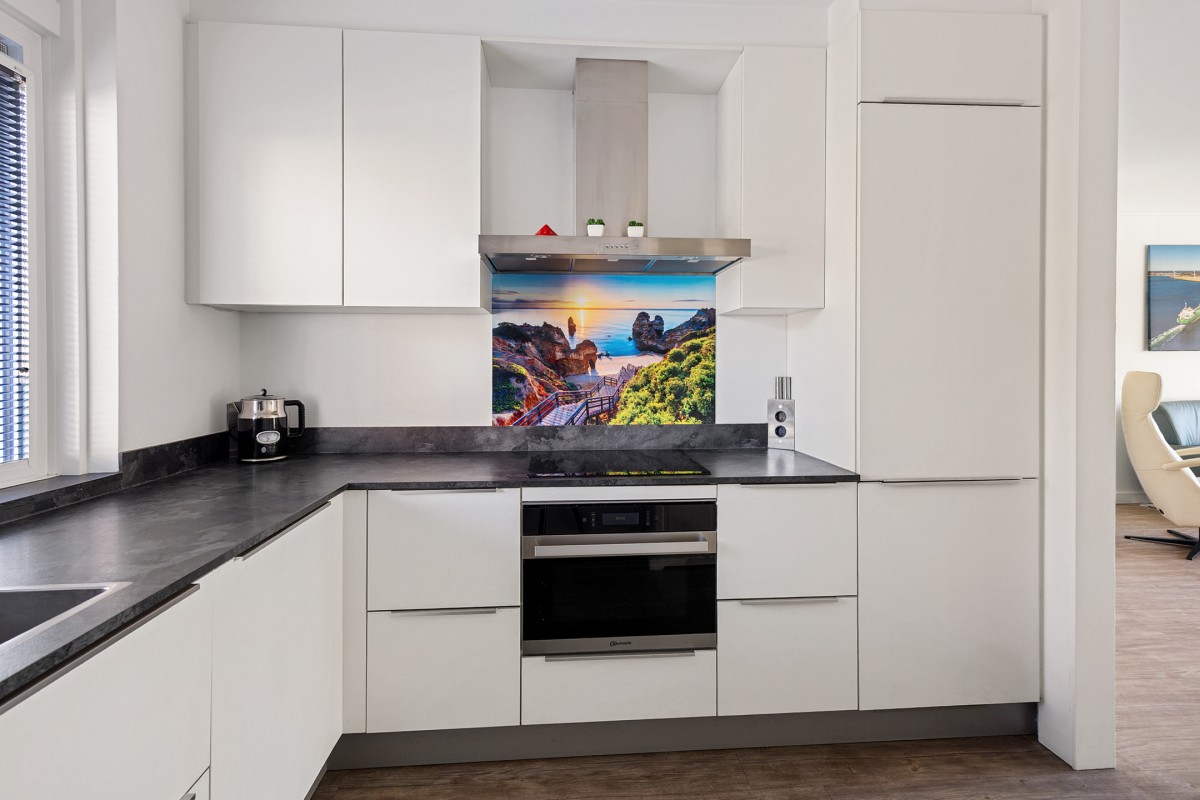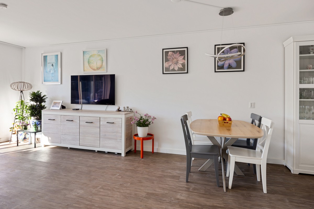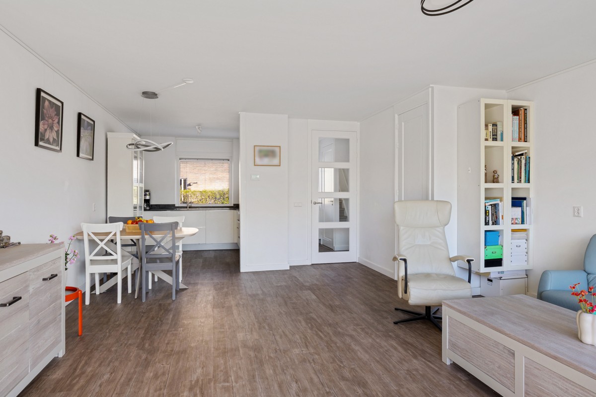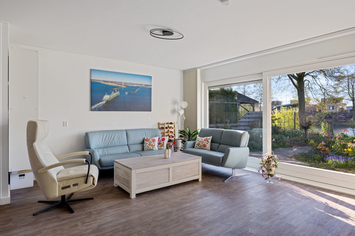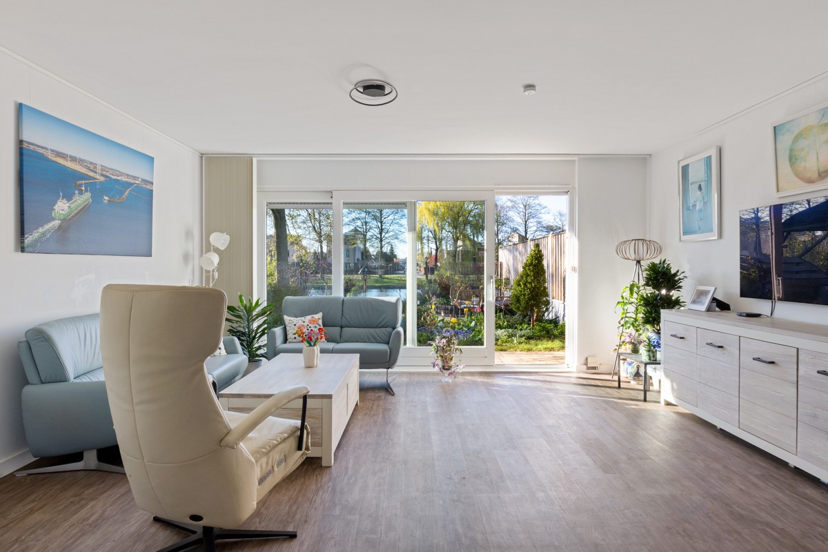 A lovely, spacious living room with a beautiful view of the green garden, where natural light streams in and a sense of tranquility prevails. The living room offers ample space for a comfortable seating area and a generous dining table, ideal for social gatherings. Through the wide wooden sliding doors, you effortlessly walk into the backyard, with a beautiful view of the Brede Havendiep canal.