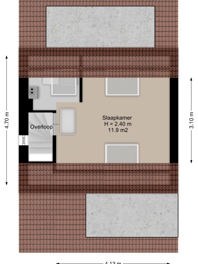 The bedroom at the front has a synthetic dormer window with a moving window, specially designed to easily move large pieces of furniture up or down.