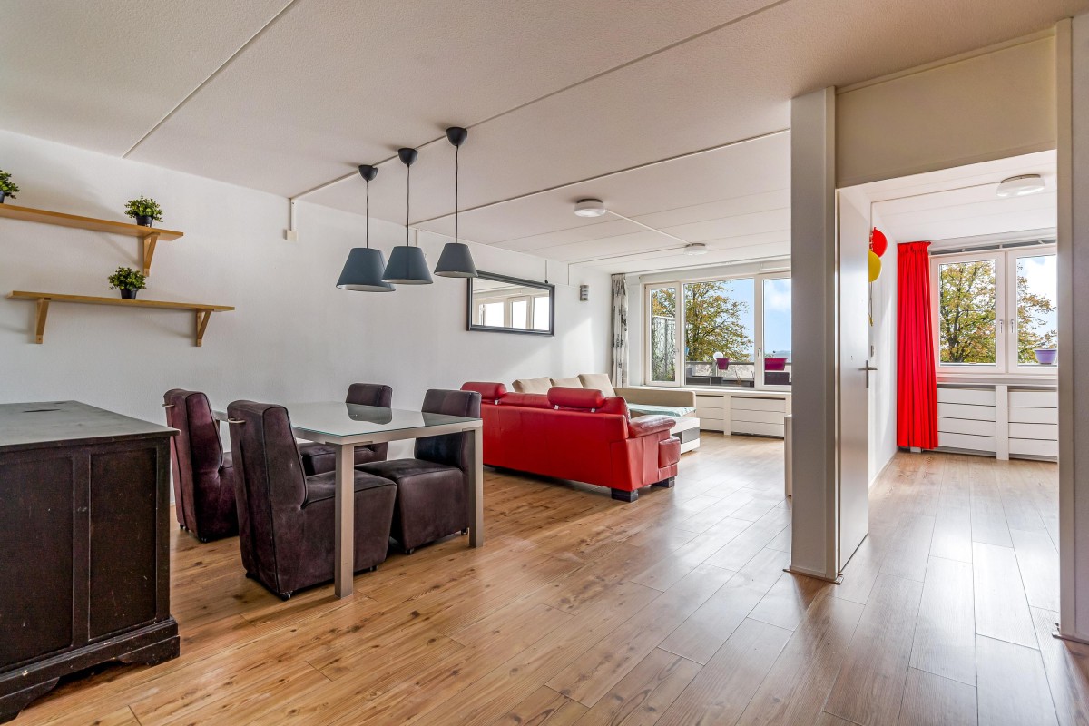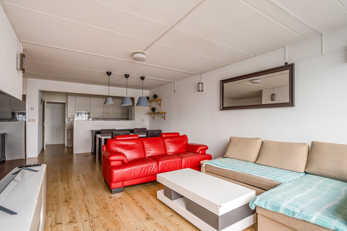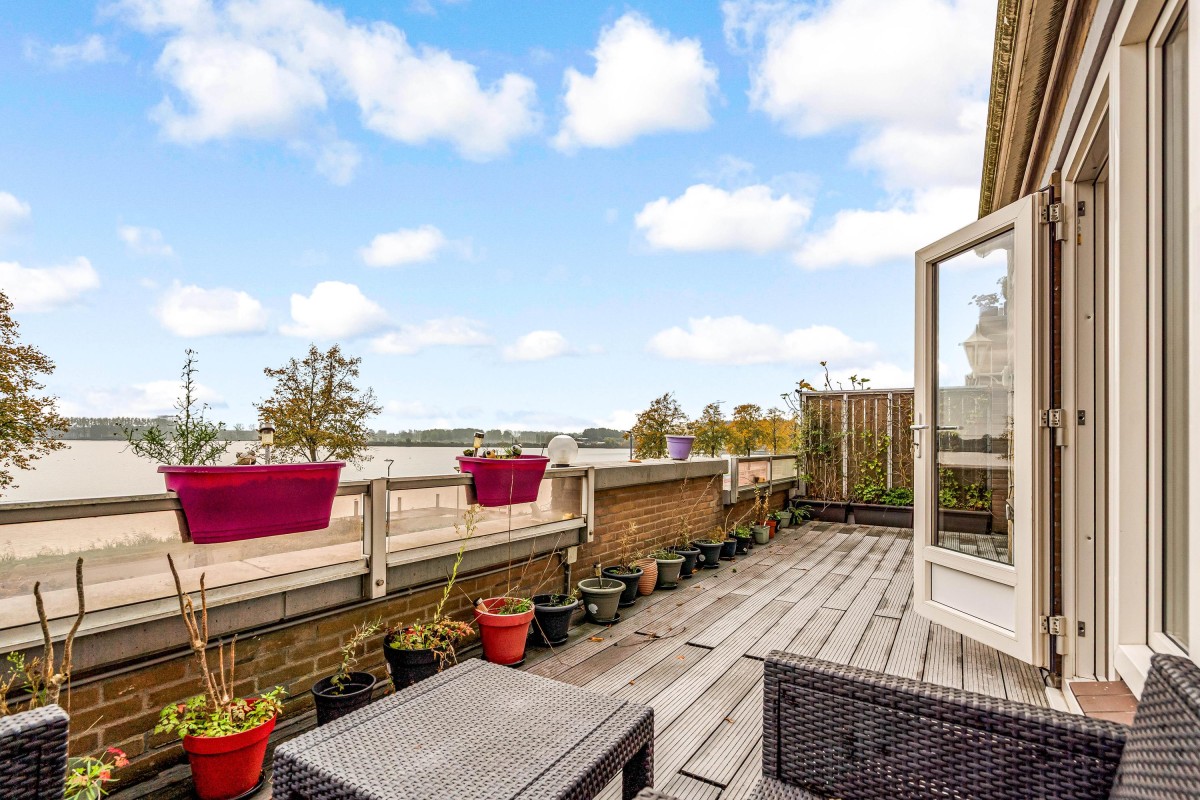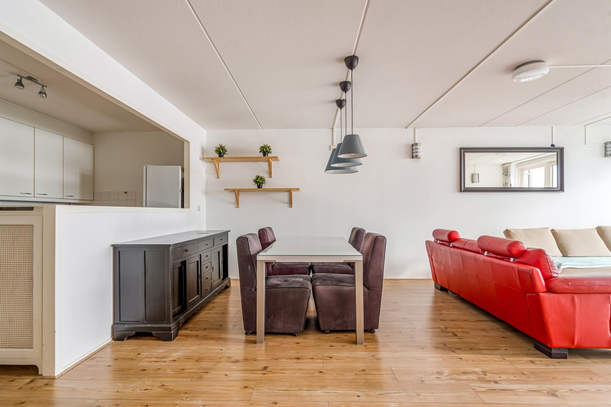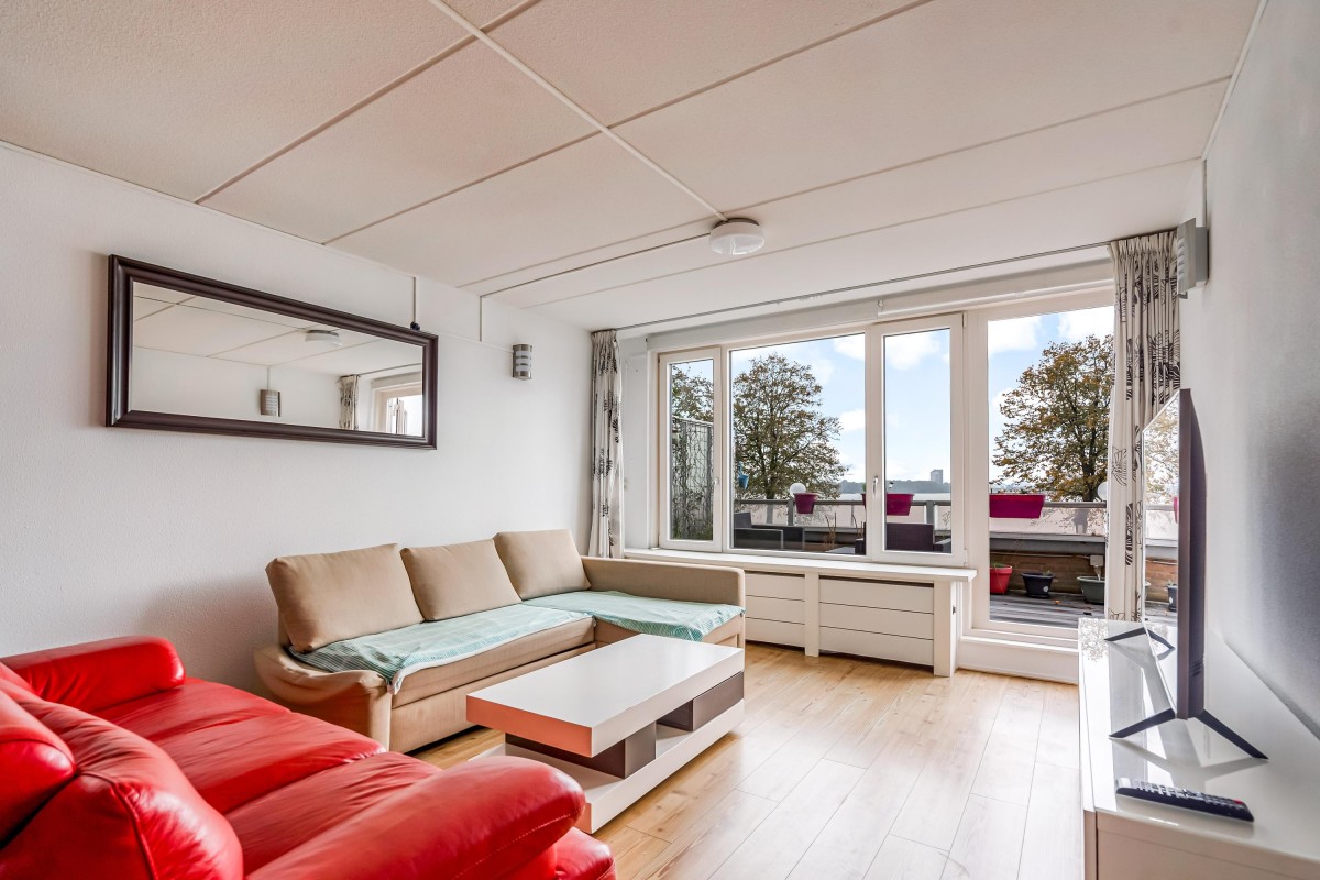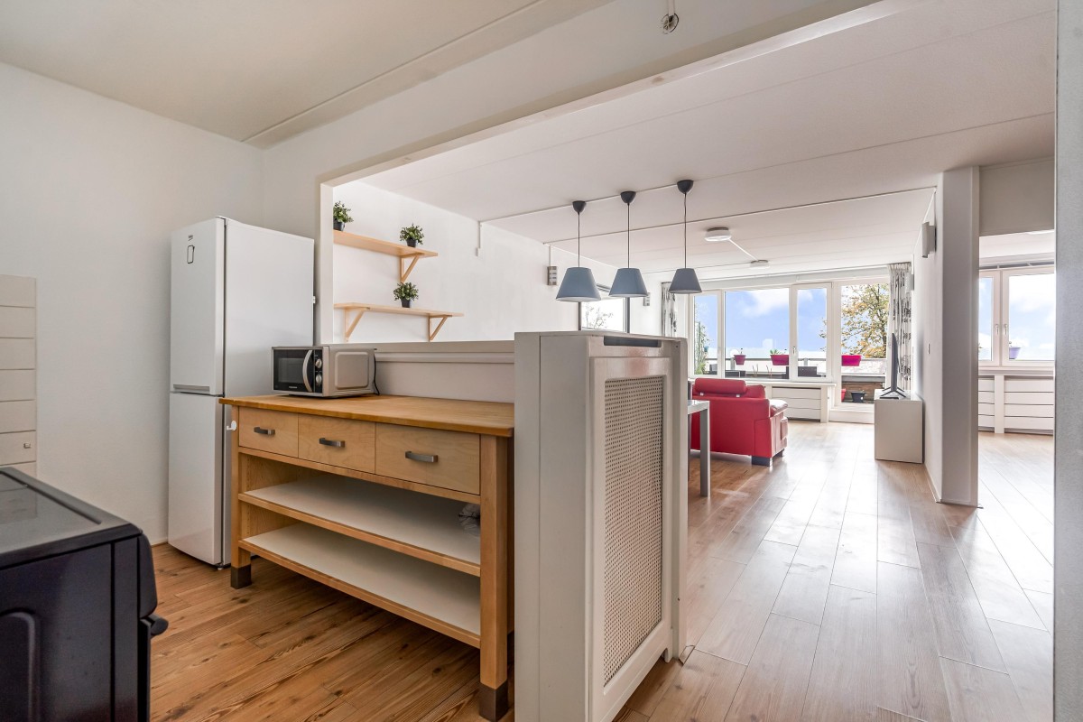 The bright living room offers a beautiful view over the water and has access to the spacious rooftop terrace. The window frames have been replaced with low-maintenance PVC frames. From the living room, you can step out onto the southeast-facing rooftop terrace, with views of the boulevard, Weerwater, and the skyline of Almere – a perfect spot to relax.