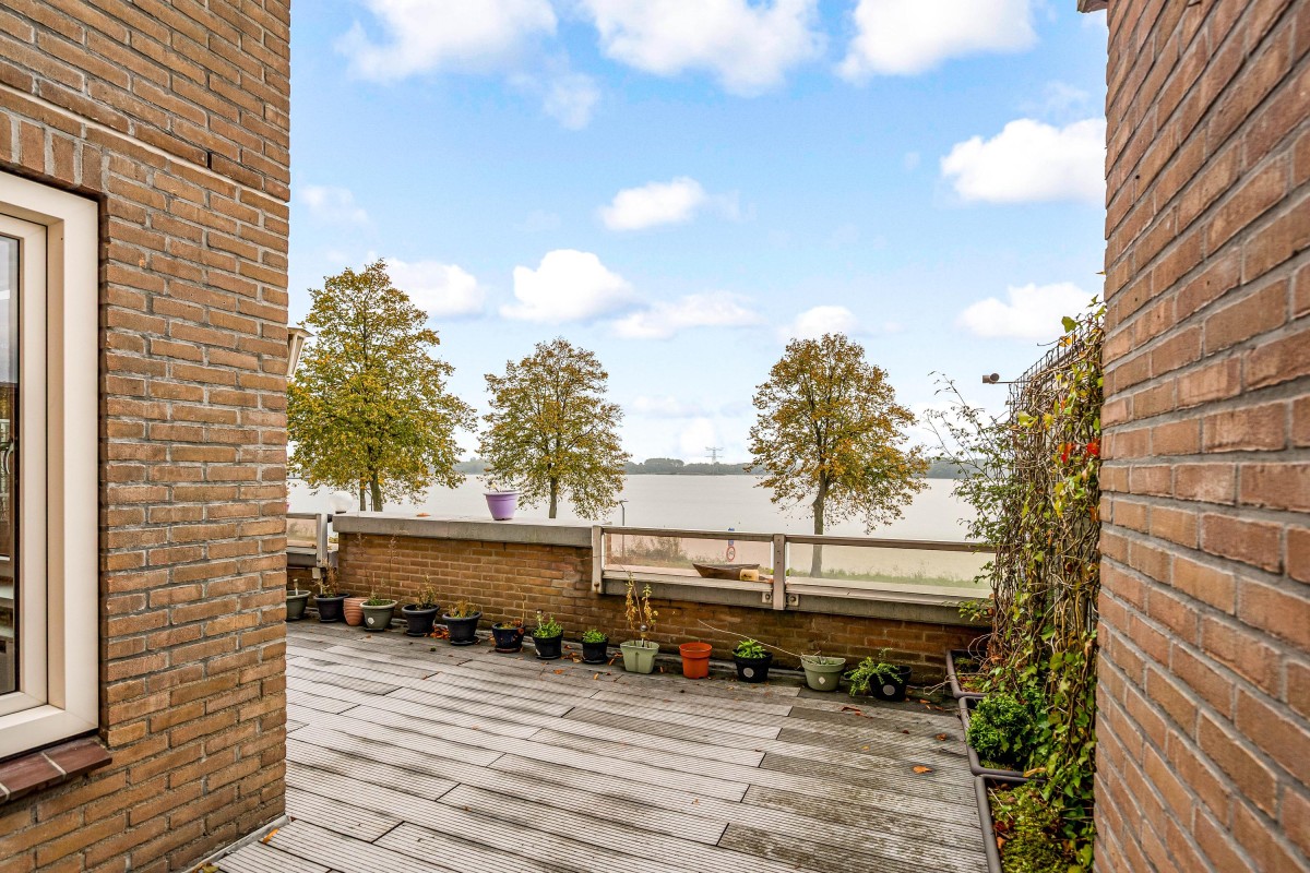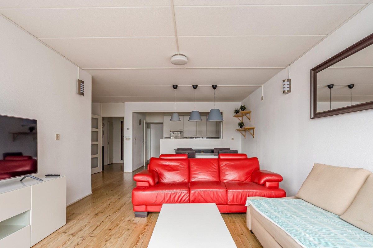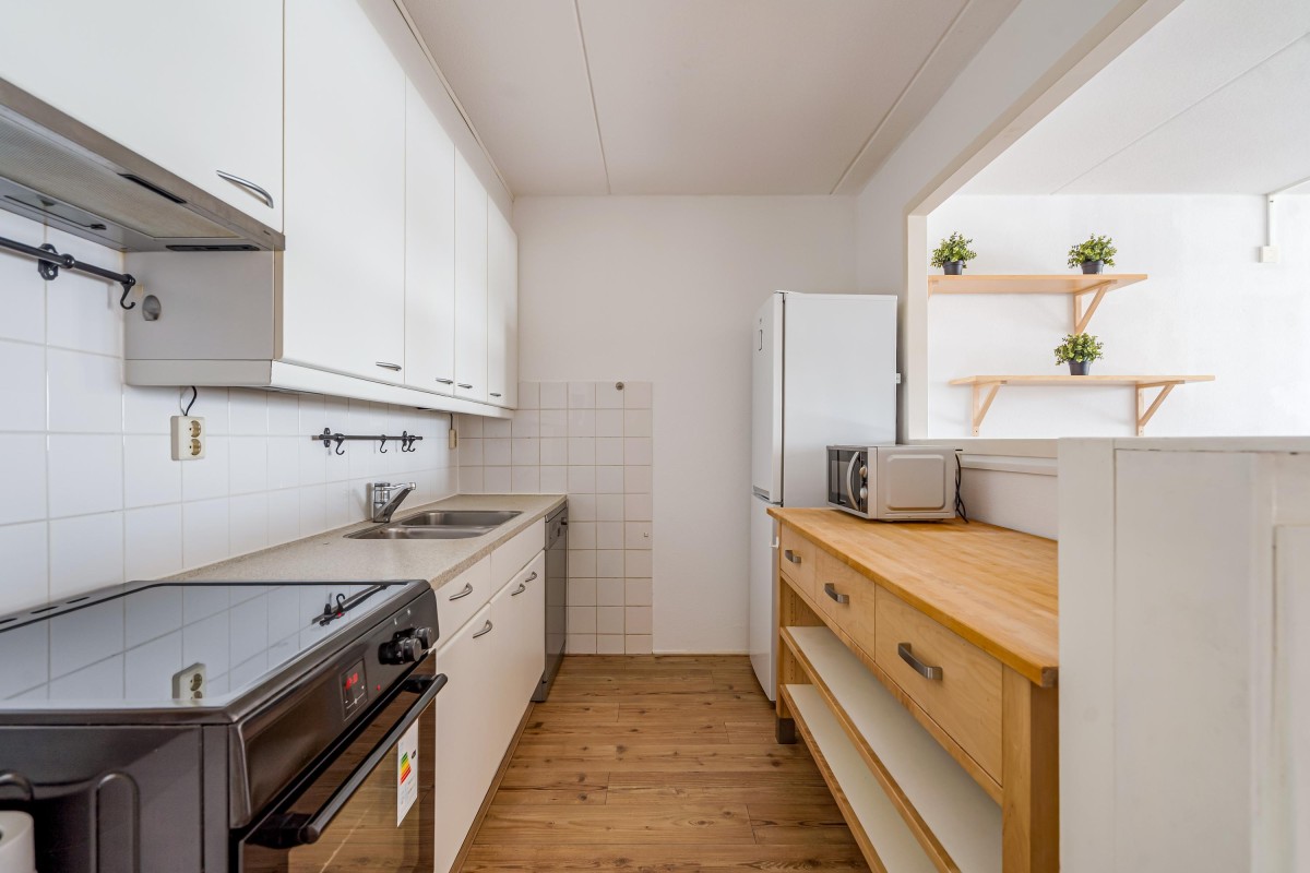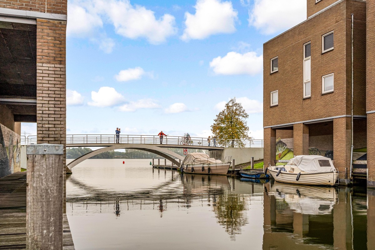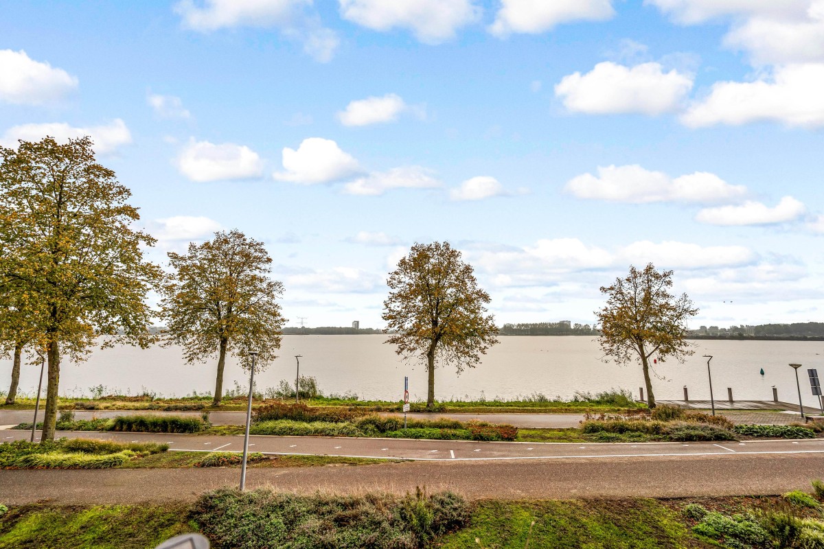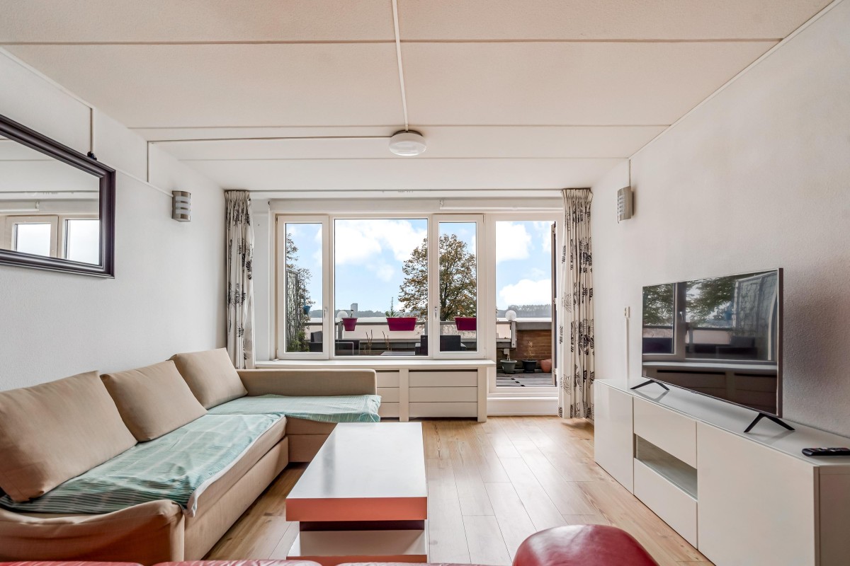 The bright living room offers a beautiful view over the water and has access to the spacious rooftop terrace. The window frames have been replaced with low-maintenance PVC frames. From the living room, you can step out onto the southeast-facing rooftop terrace, with views of the boulevard, Weerwater, and the skyline of Almere – a perfect spot to relax.