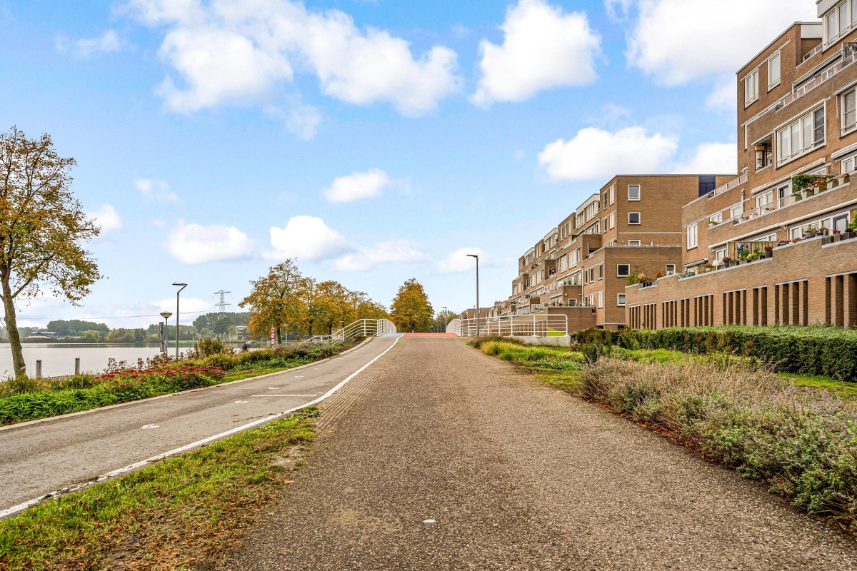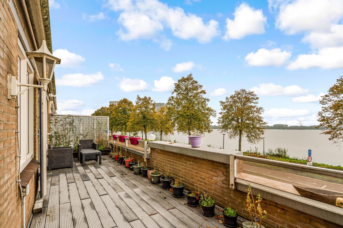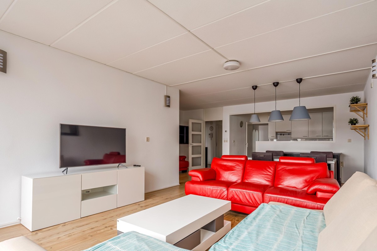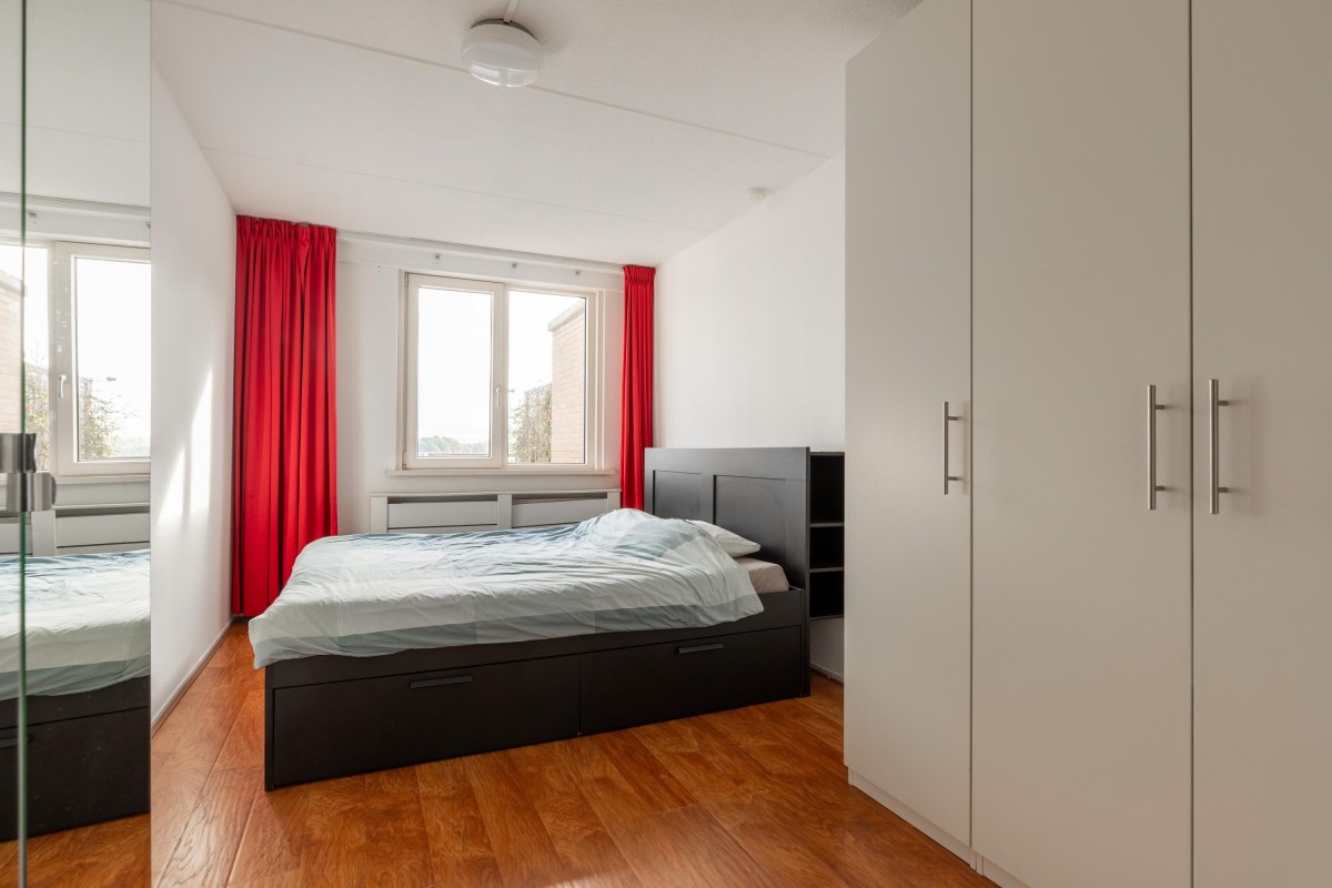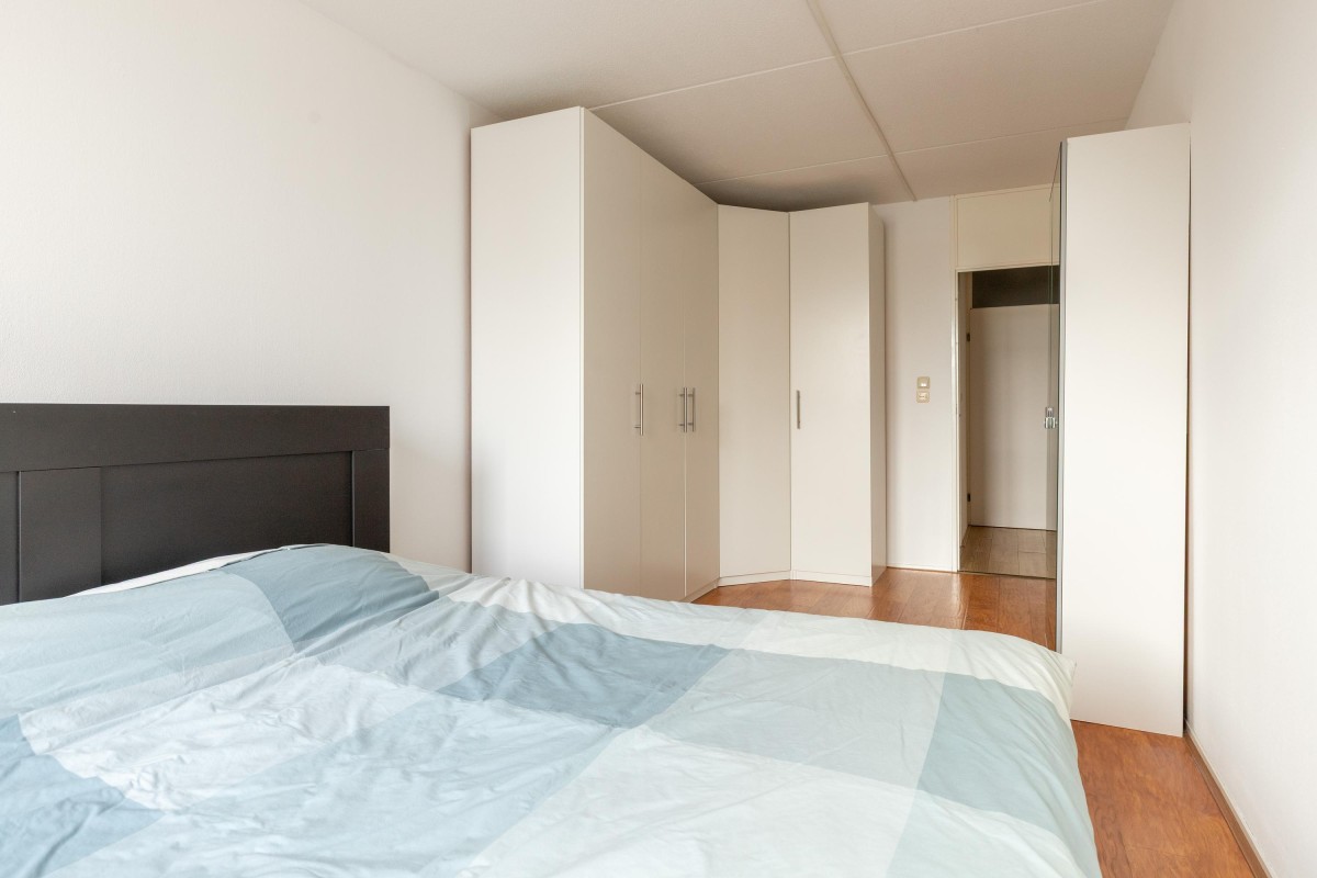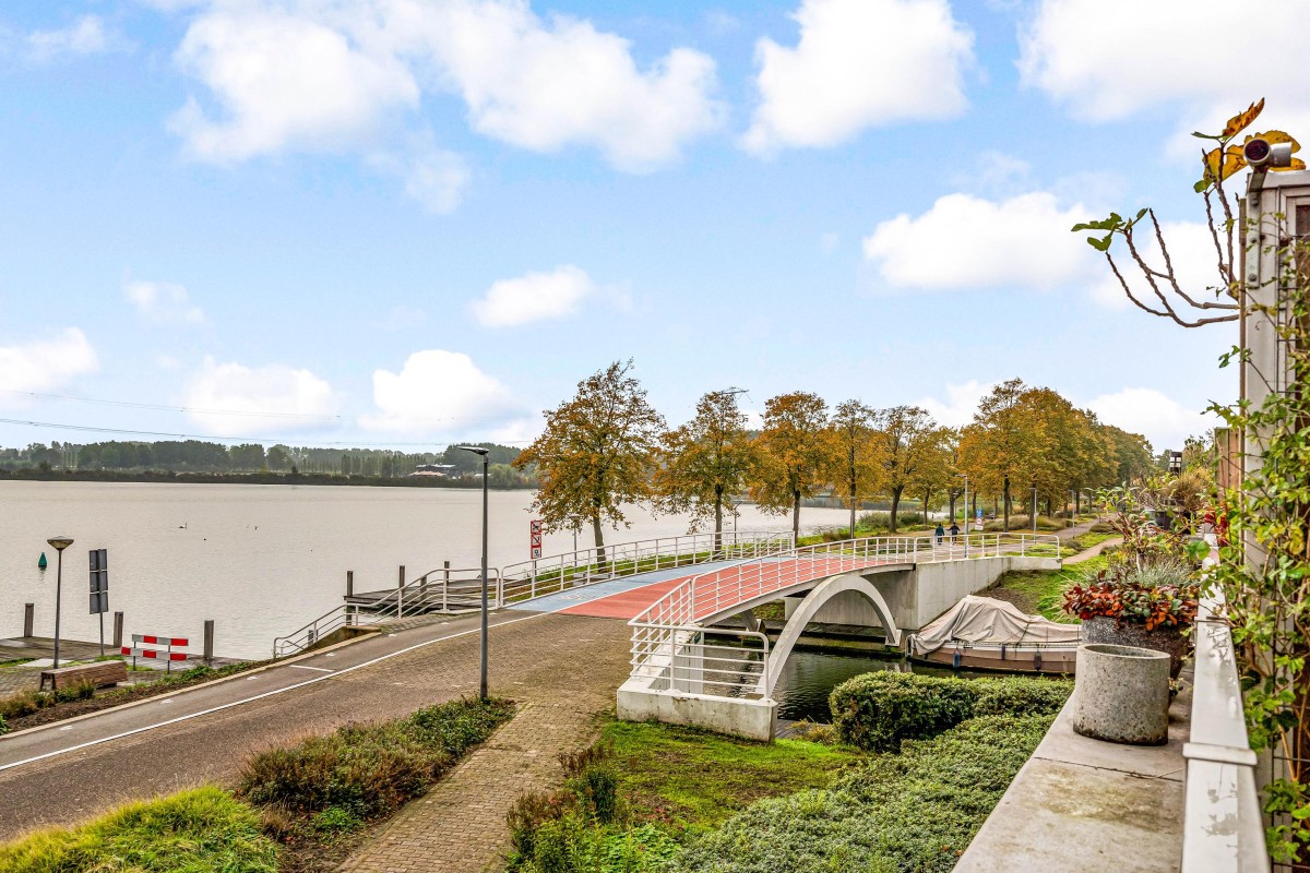 The bright living room offers a beautiful view over the water and has access to the spacious rooftop terrace. The window frames have been replaced with low-maintenance PVC frames. From the living room, you can step out onto the southeast-facing rooftop terrace, with views of the boulevard, Weerwater, and the skyline of Almere – a perfect spot to relax.