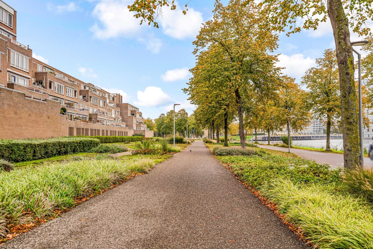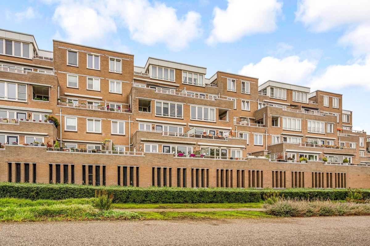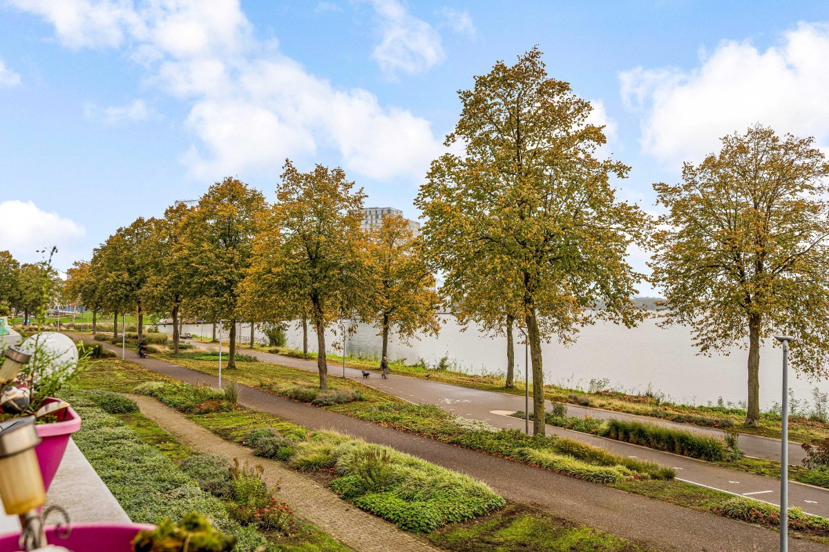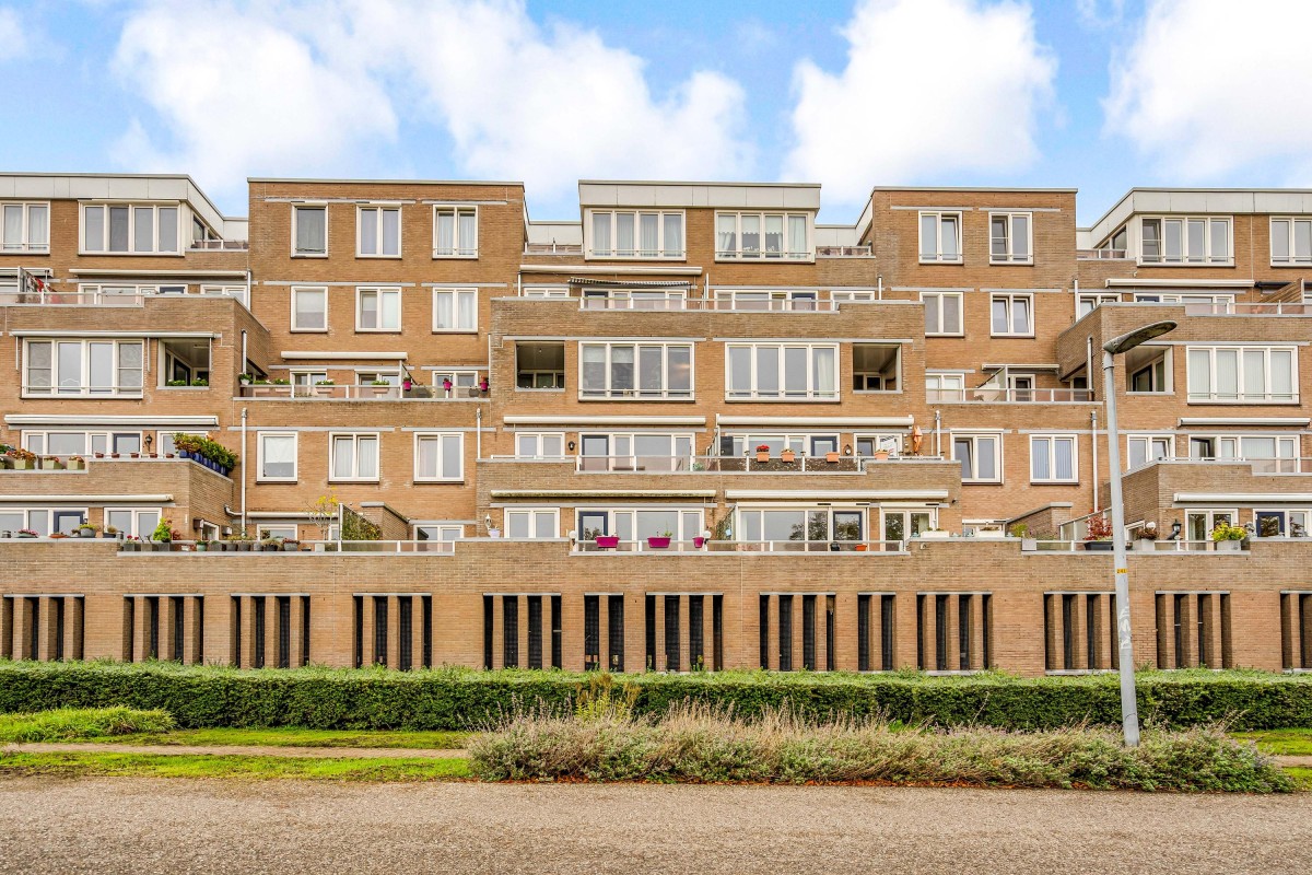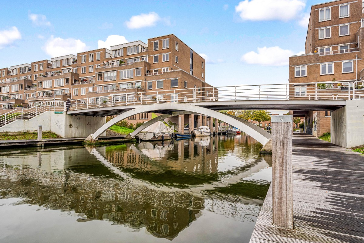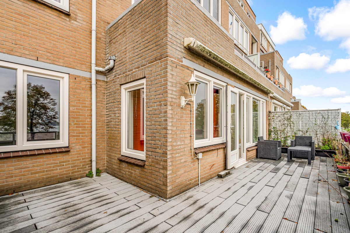 The bright living room offers a beautiful view over the water and has access to the spacious rooftop terrace. The window frames have been replaced with low-maintenance PVC frames. From the living room, you can step out onto the southeast-facing rooftop terrace, with views of the boulevard, Weerwater, and the skyline of Almere – a perfect spot to relax.