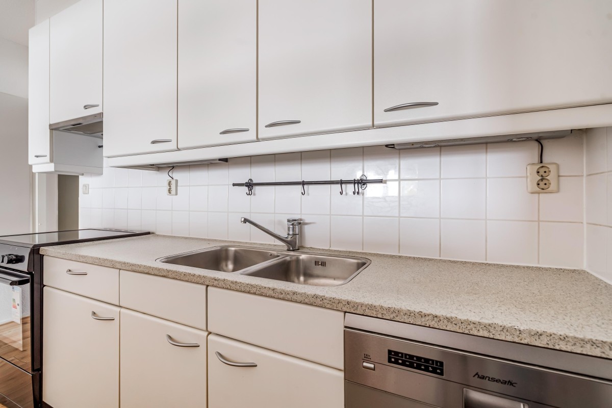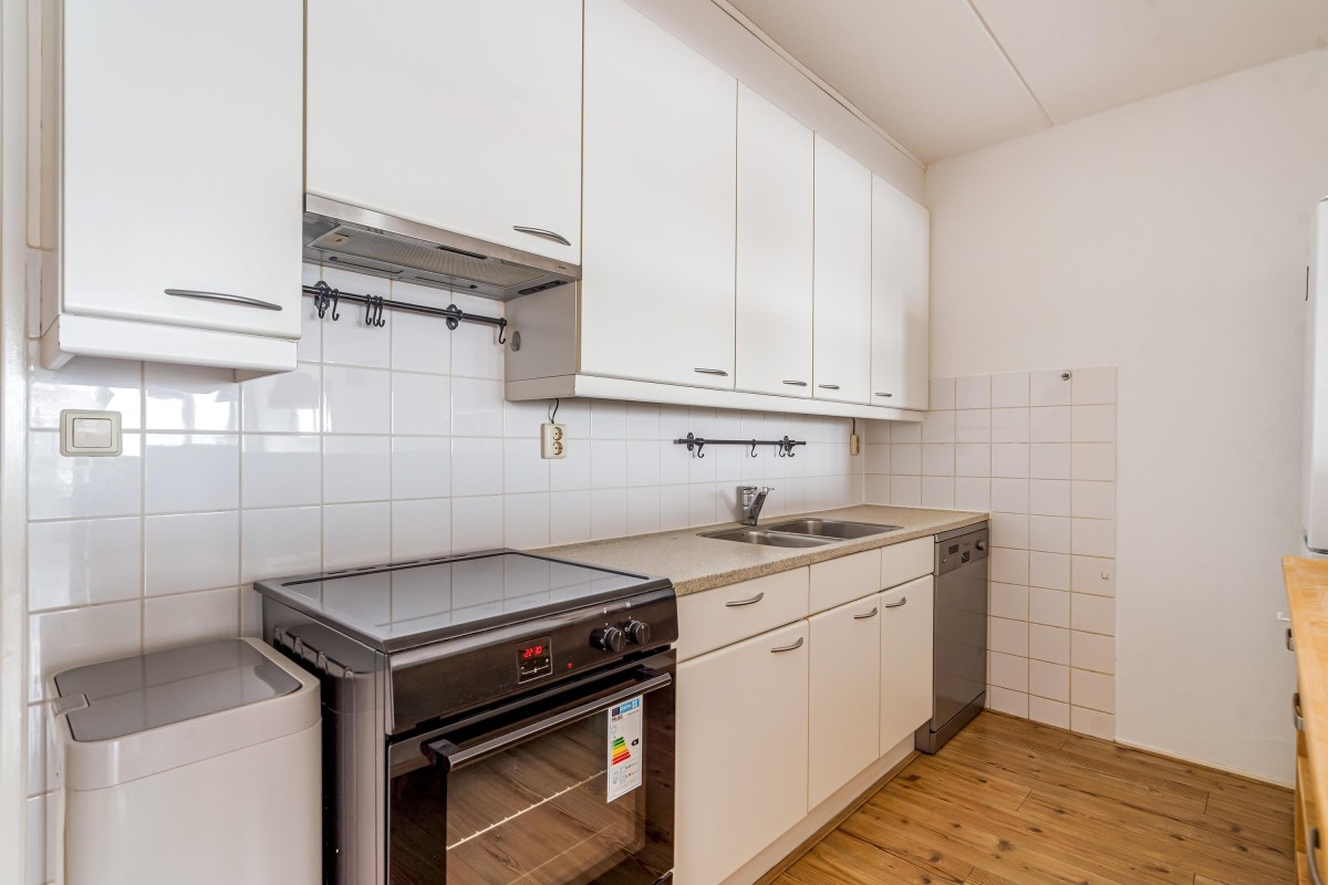 The semi-open kitchen still retains its original layout from the time the building was constructed. Behind the kitchen, there is a storage room. The kitchen is fully functional but can, of course, be replaced to suit your personal taste.