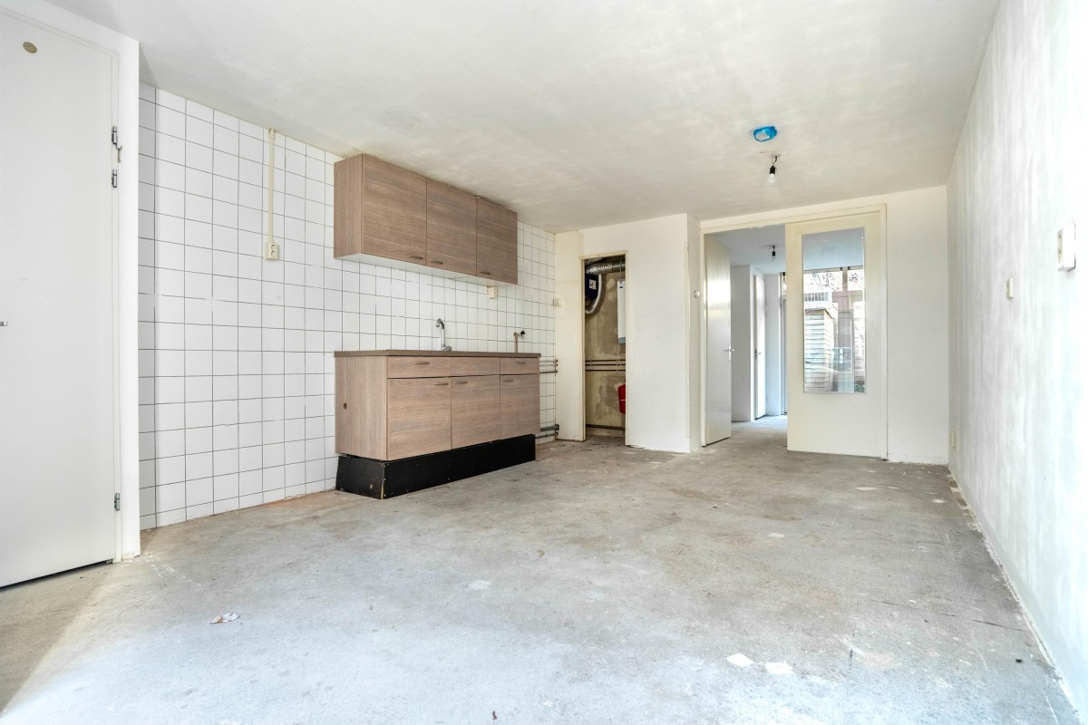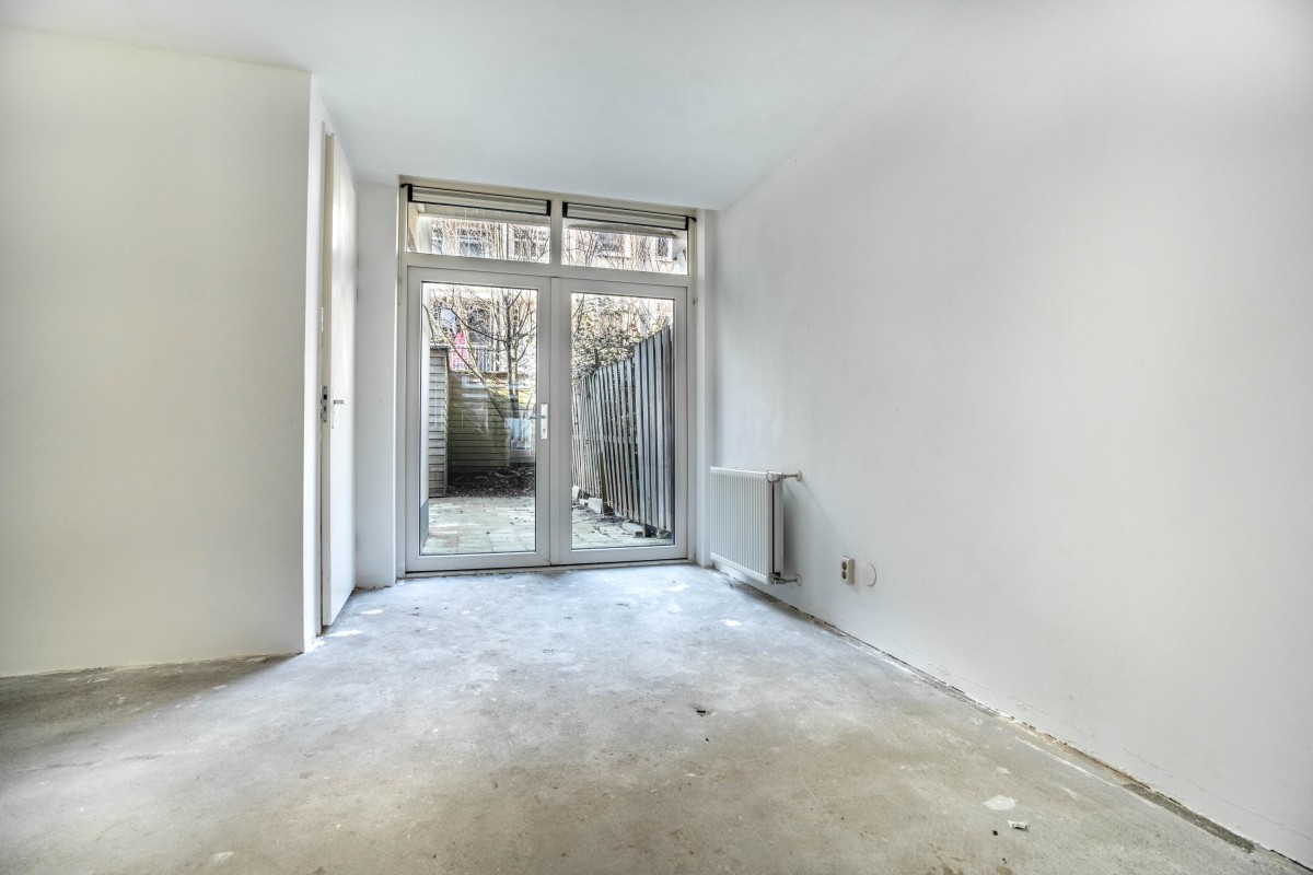 Lees verderAt the quiet rear of the property is the spacious bedroom, accessible from the living room. From the bedroom, you can step directly into the generous northwest-facing garden through the back door.