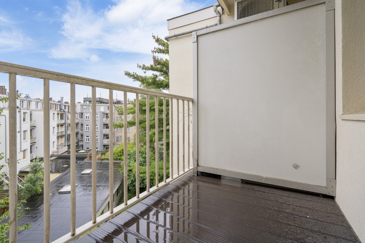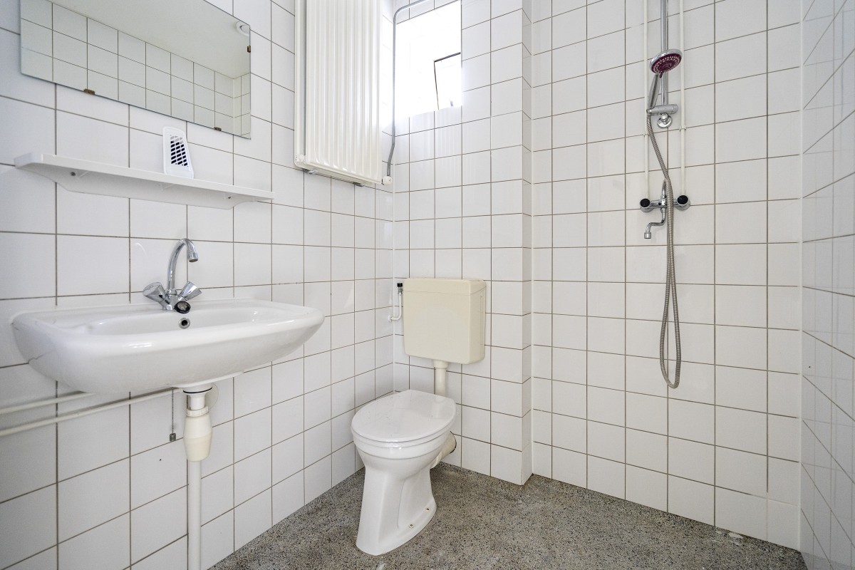 At the rear of the apartment is the bedroom. A small hallway leads to the bathroom, which is equipped with a shower, toilet, and washbasin. The adjacent storage cupboard contains the central heating boiler (Intergas, built in 2014) and mechanical ventilation unit. The south-facing balcony, accessible via the hallway, is a perfect spot to enjoy the afternoon sun.