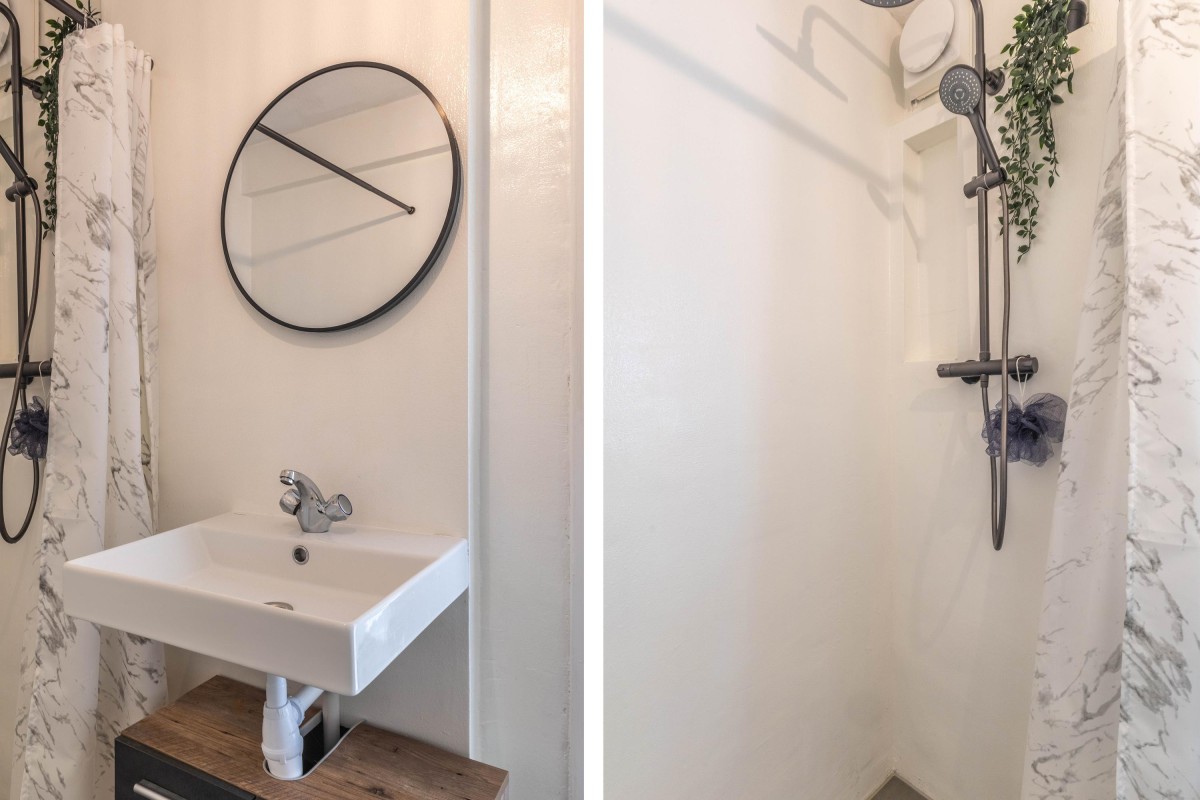 The neat bathroom is located at the end of the hallway, and there is a separate toilet as well. The apartment also features two internal storage rooms, perfect for creating a walk-in closet or extra storage space.