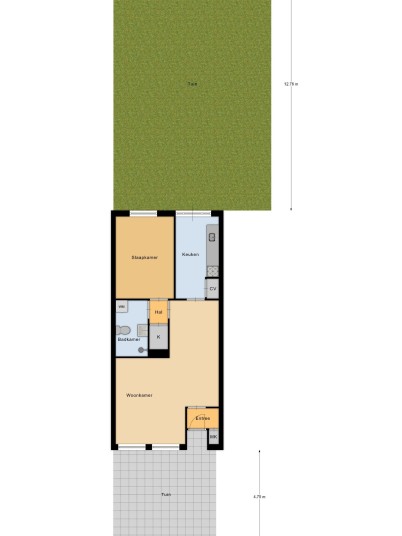 Walking towards the rear, you enter a small hallway that provides access to storage space, the bathroom (equipped with a shower, washbasin, toilet, and washing machine connection), and the bedroom, which is situated at the rear of the apartment. The kitchen is also located at the rear and provides access to the spacious east-facing garden of approximately 100 m².
