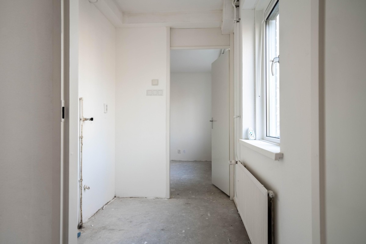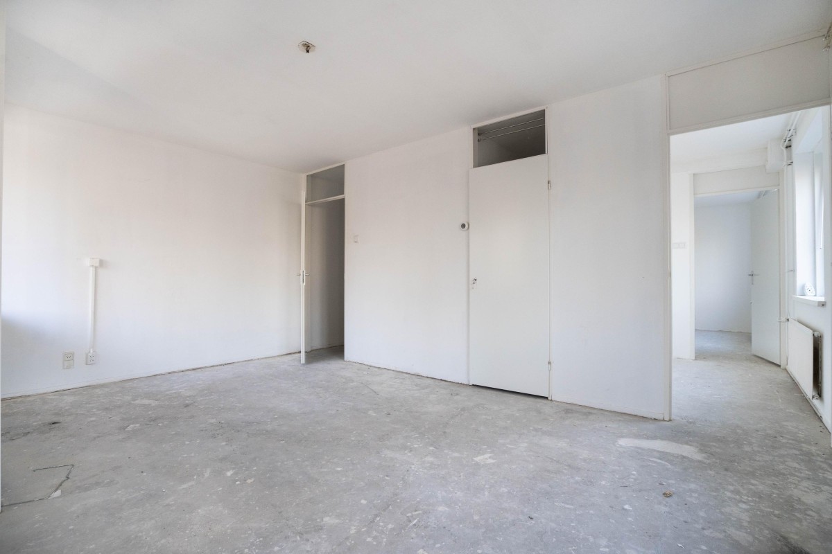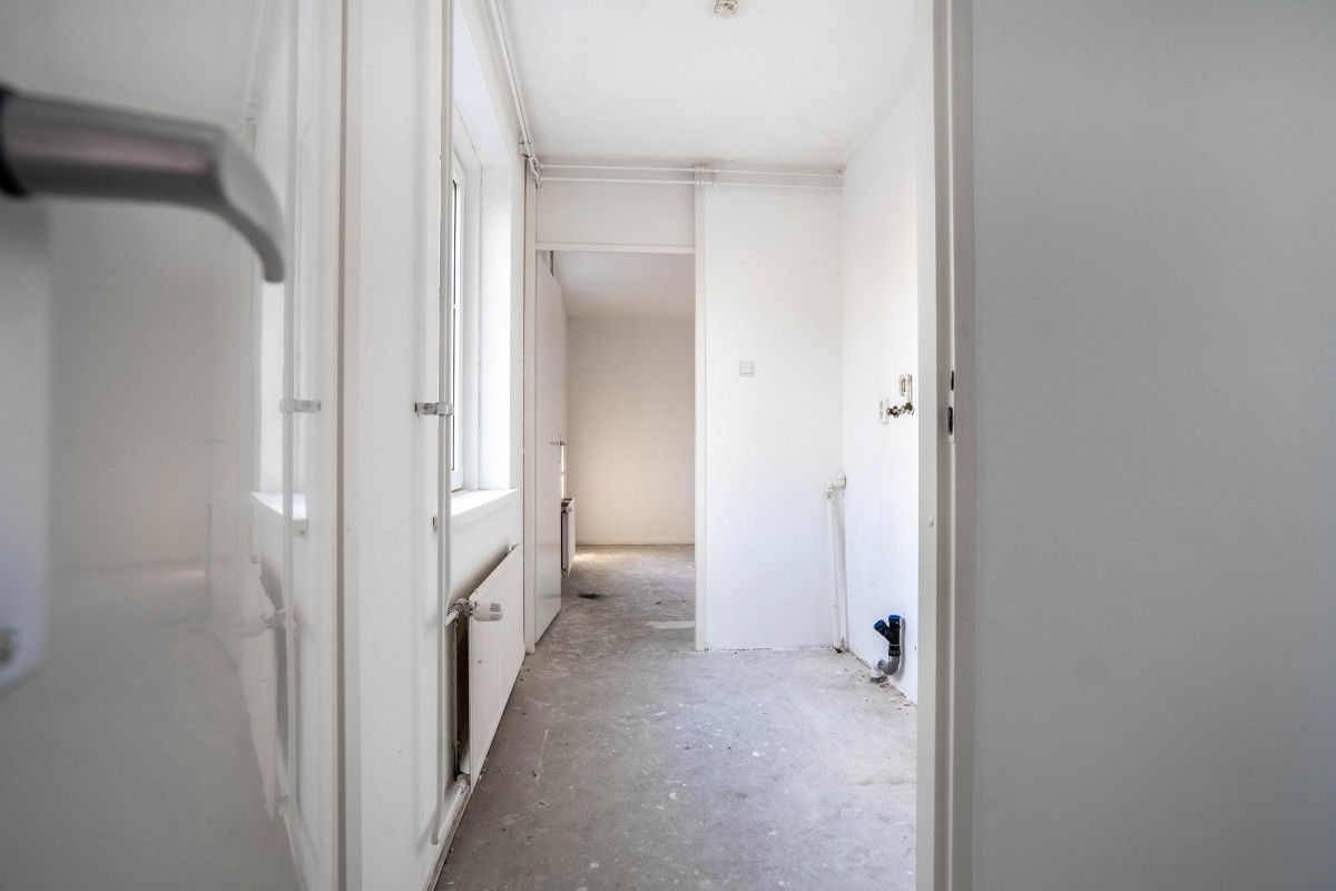 The kitchen is still in its basic state, allowing you to arrange it completely according to your own preferences. The bedroom is located on the other side of the apartment and also has storage space, where the central heating boiler (Intergas, built in 2018) is installed.