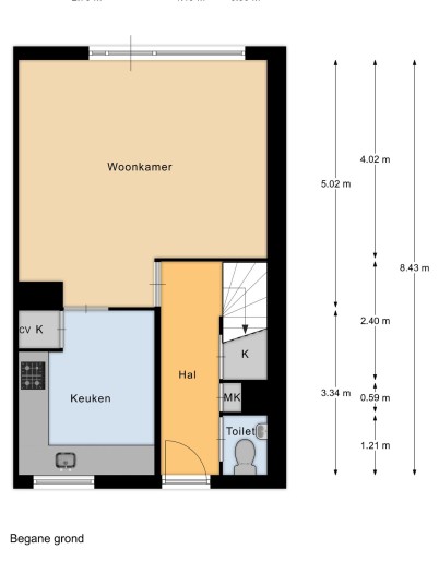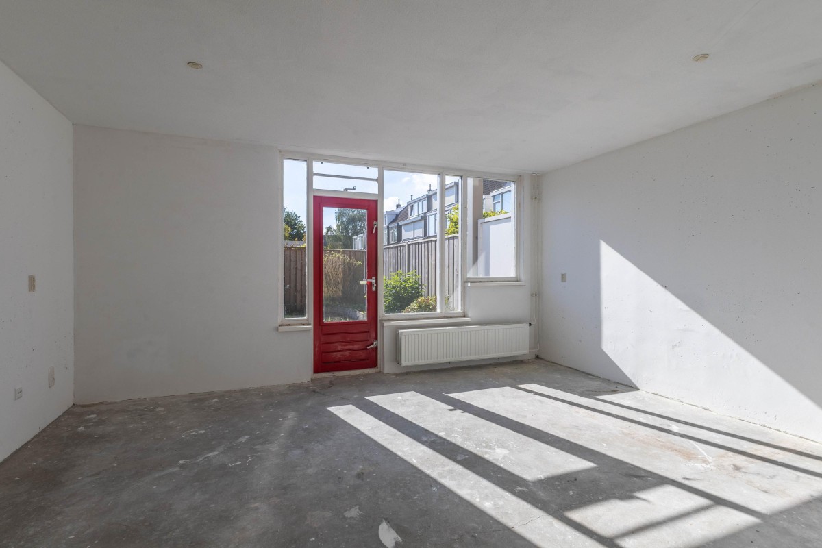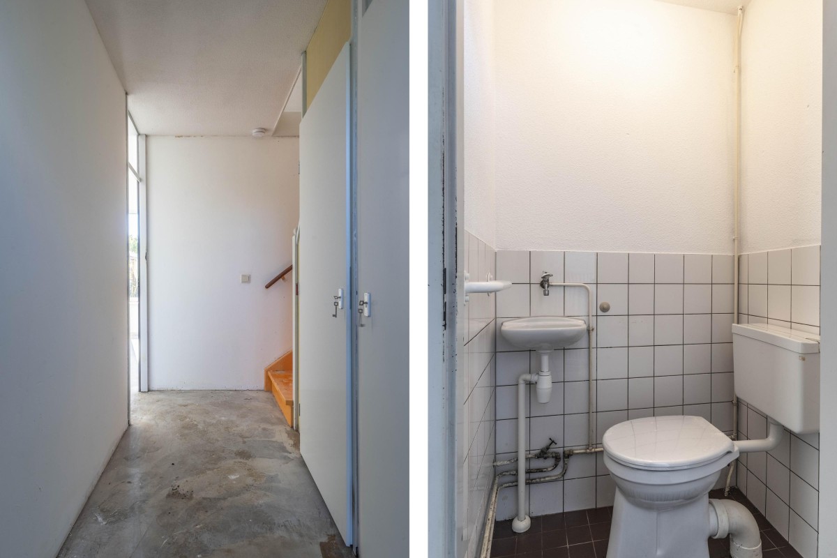 You can reach the front door of the house via the spacious front garden. Upon entering, you find the hallway, which gives access to the separate toilet with sink, the meter cupboard, the storage cupboard under the stairs, and the staircase to the first floor. From the hallway, you enter the bright and spacious living room with large windows at the rear.