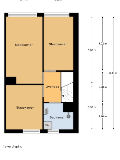 On the first floor, the landing provides access to all rooms. At the front, you’ll find the bathroom, equipped with a shower, washbasin, and a connection for the washing machine. The first bedroom is also located at the front. At the rear are two more spacious bedrooms, both with plenty of natural light.