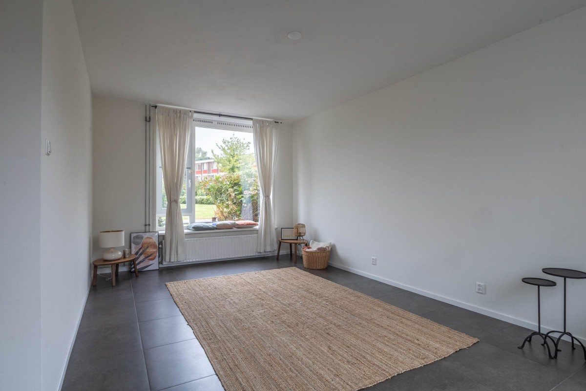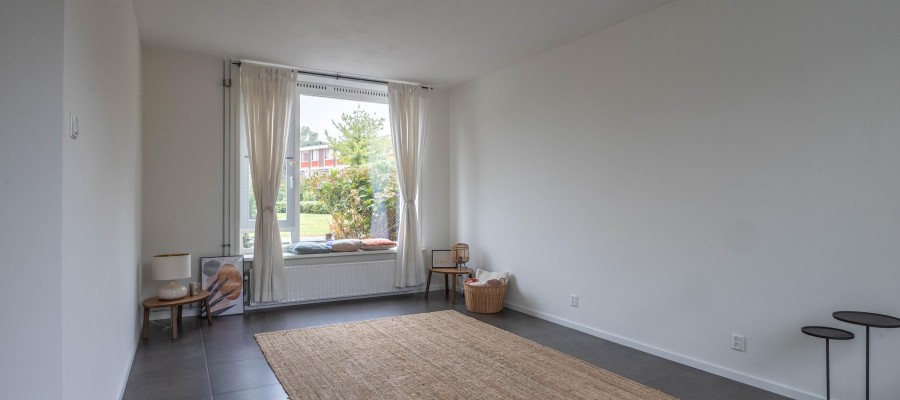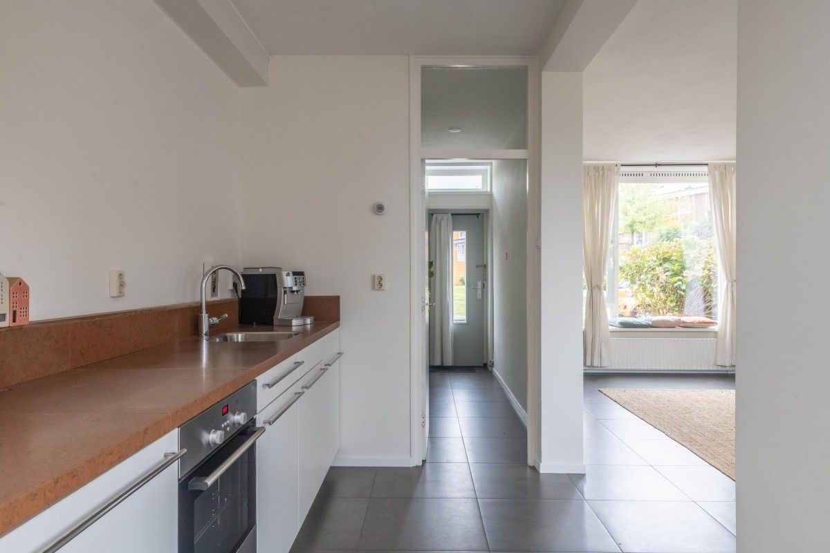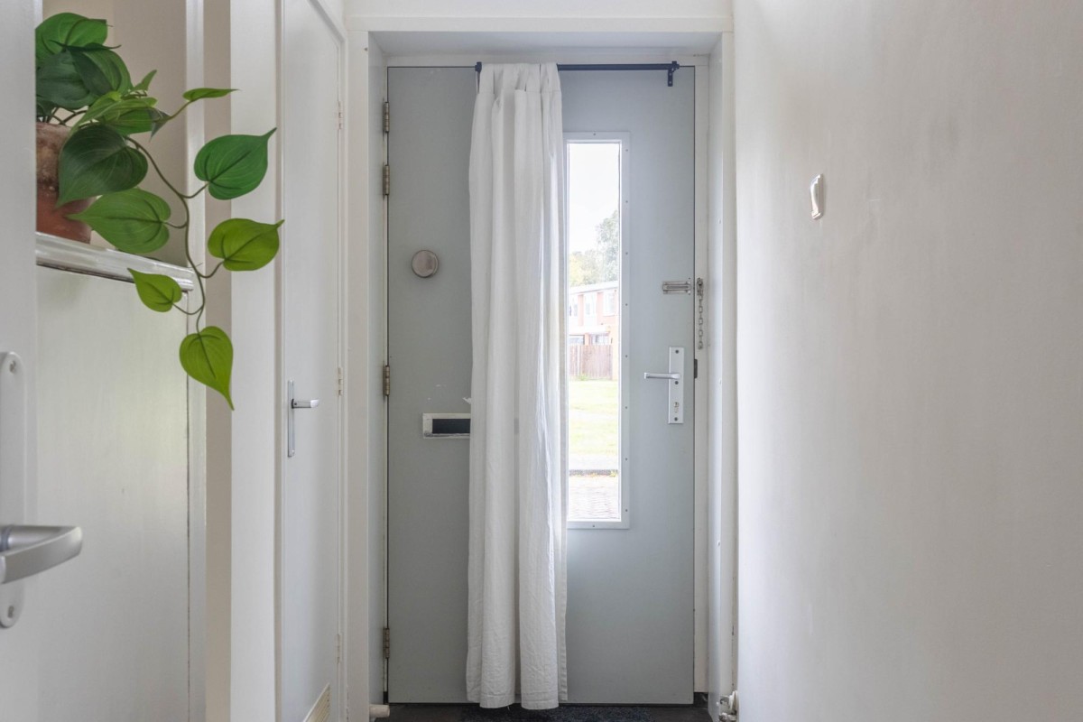 Through the spacious and green Willem Mulierhof, you reach the entrance of the house. In front of the property is a beautifully landscaped front garden of approximately 10 m². Upon entering, you step into the hall, which provides access to the separate toilet, two practical storage cupboards, the meter cupboard, and the living room with open kitchen.