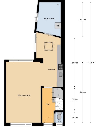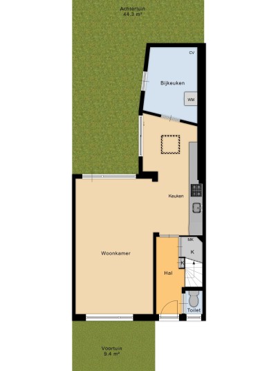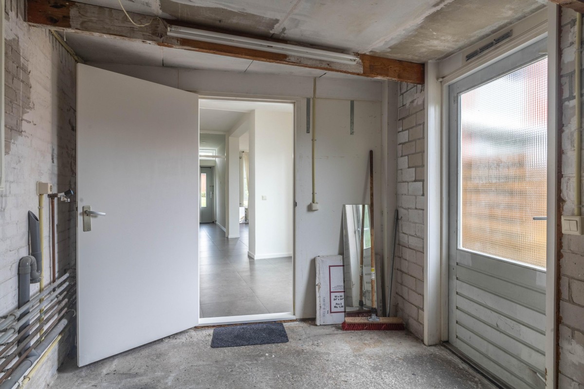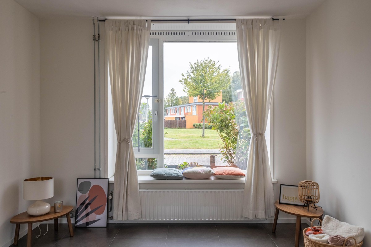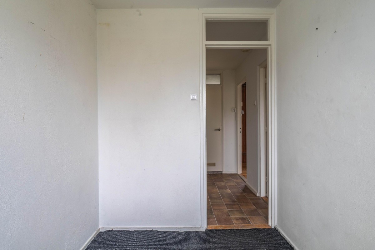Through the spacious and green Willem Mulierhof, you reach the entrance of the house. In front of the property is a beautifully landscaped front garden of approximately 10 m². Upon entering, you step into the hall, which provides access to the separate toilet, two practical storage cupboards, the meter cupboard, and the living room with open kitchen.