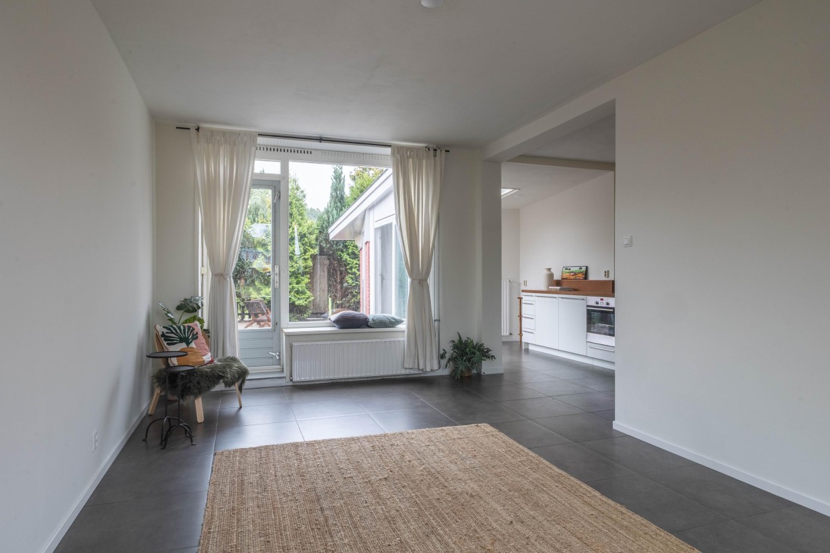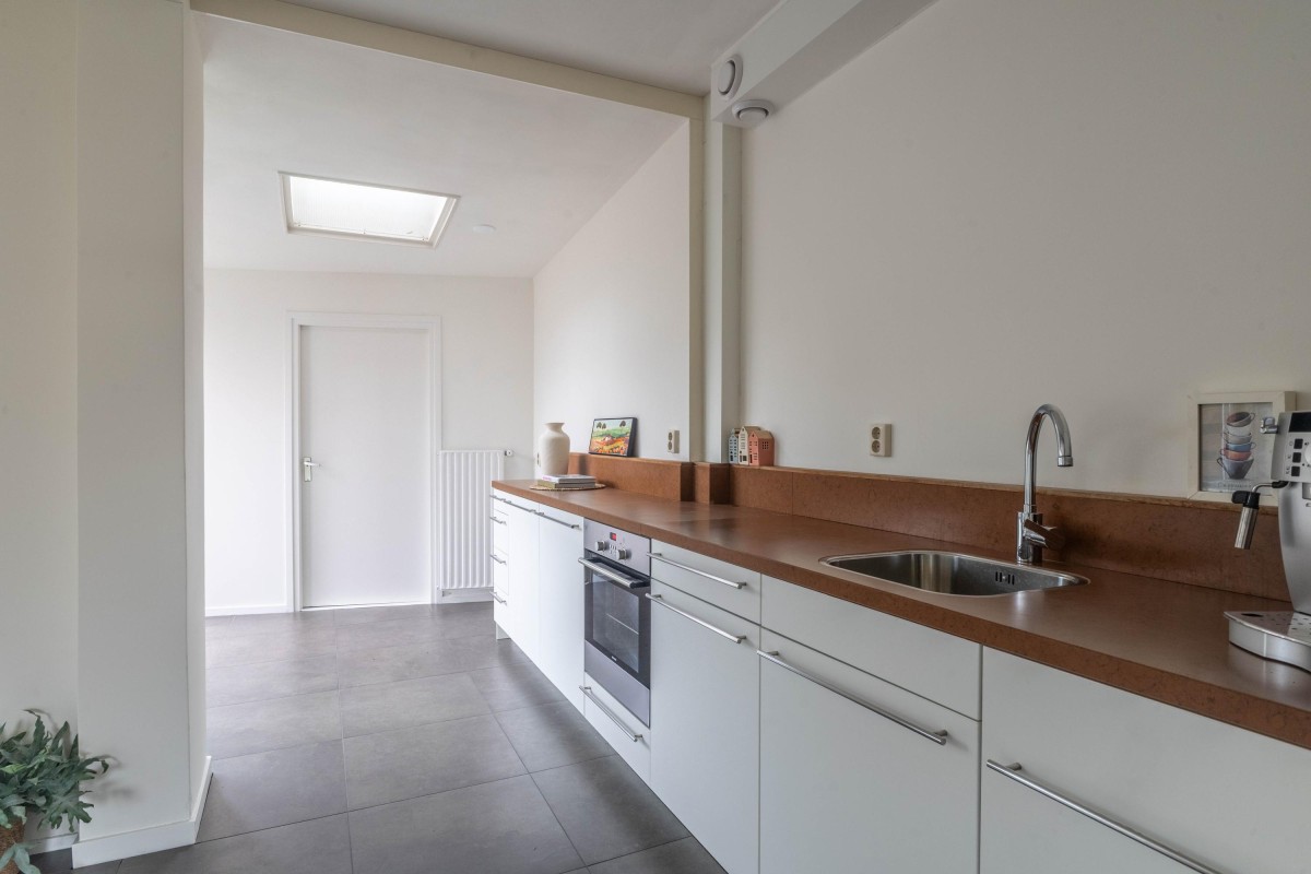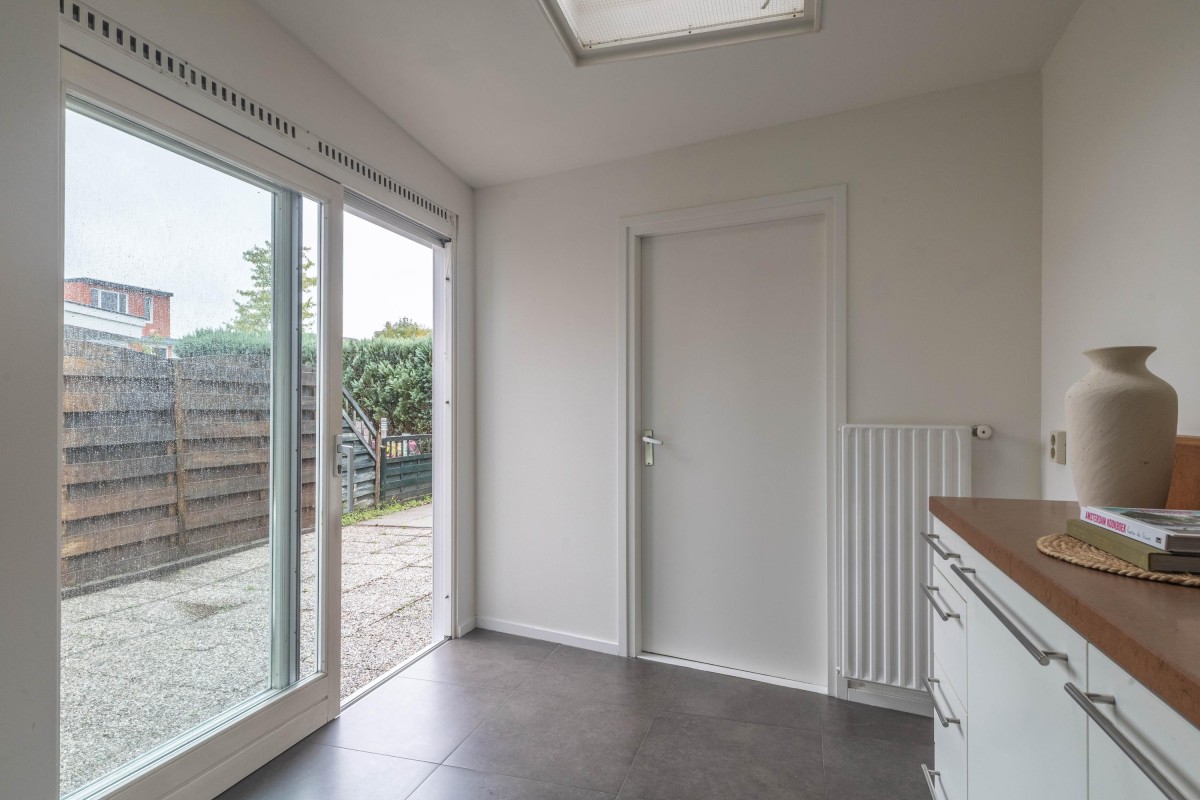 The open kitchen is sleekly designed and equipped with all modern conveniences. As the kitchen directly adjoins the living room, a spacious and open layout is created. From both the living room and kitchen, you have access to the sunny backyard. Thanks to the extension, additional living space has been created, ideal for a dining or work area.