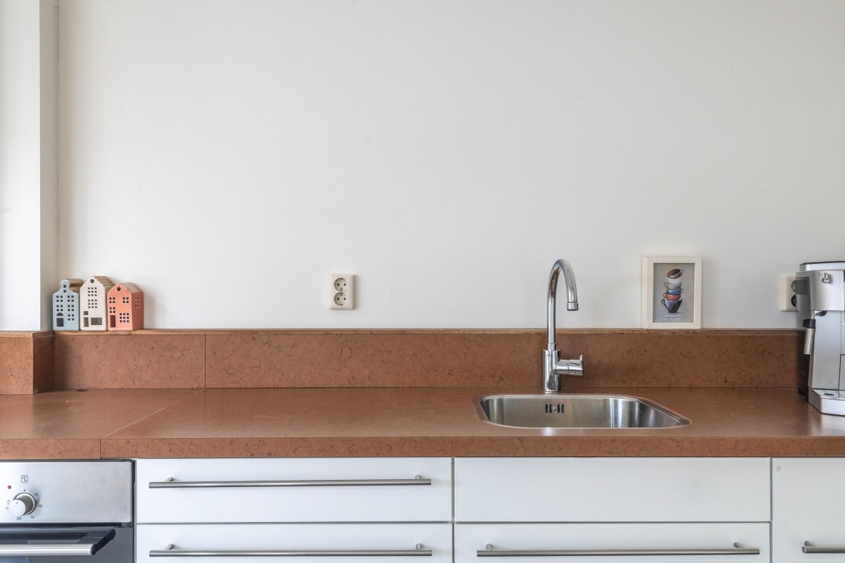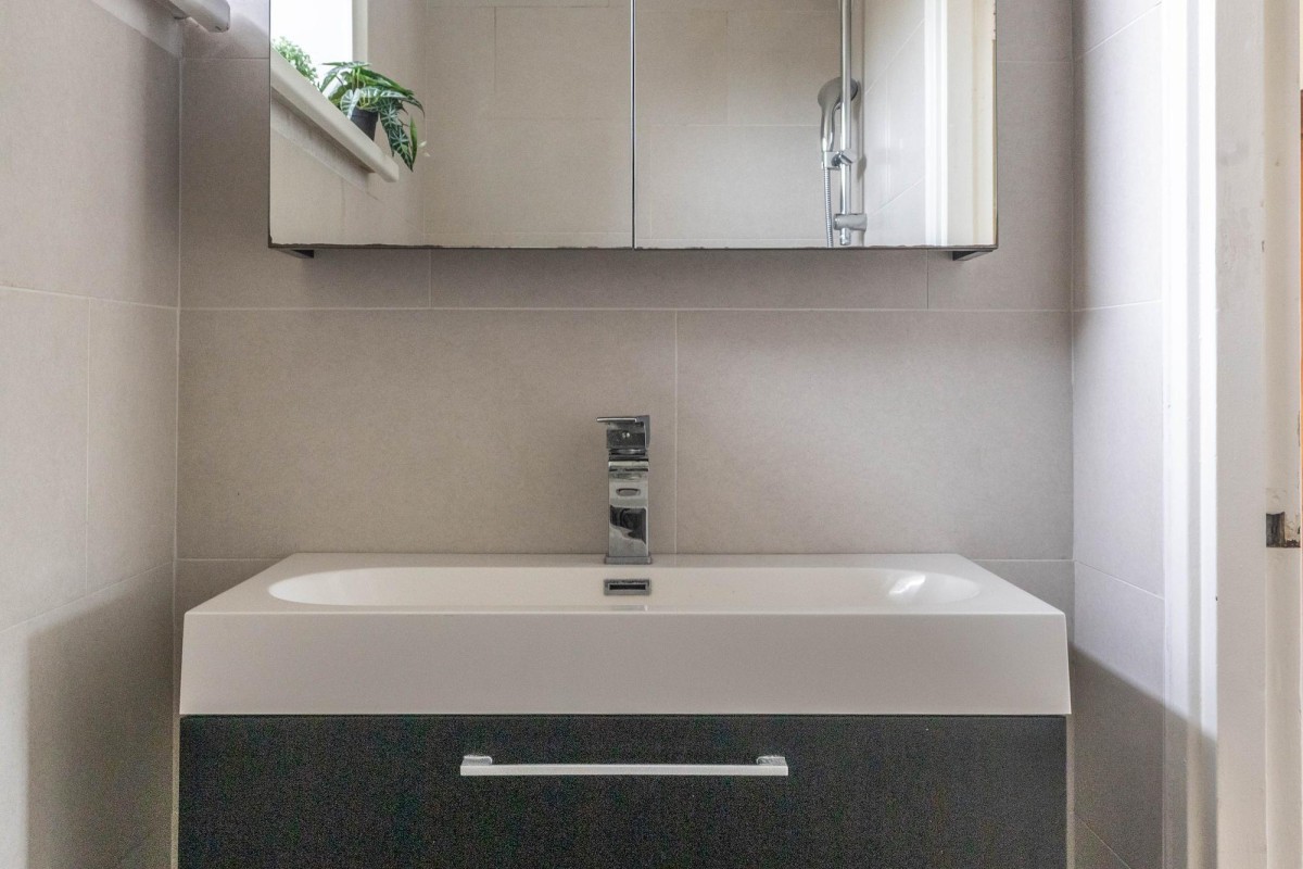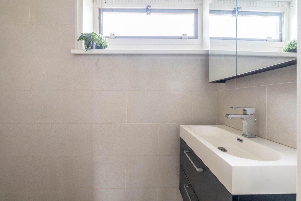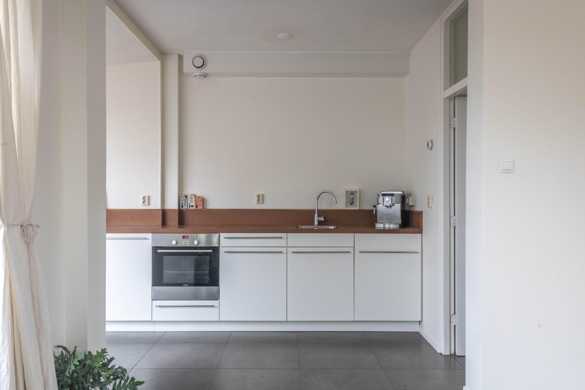 The open kitchen is sleekly designed and equipped with all modern conveniences. As the kitchen directly adjoins the living room, a spacious and open layout is created. From both the living room and kitchen, you have access to the sunny backyard. Thanks to the extension, additional living space has been created, ideal for a dining or work area.