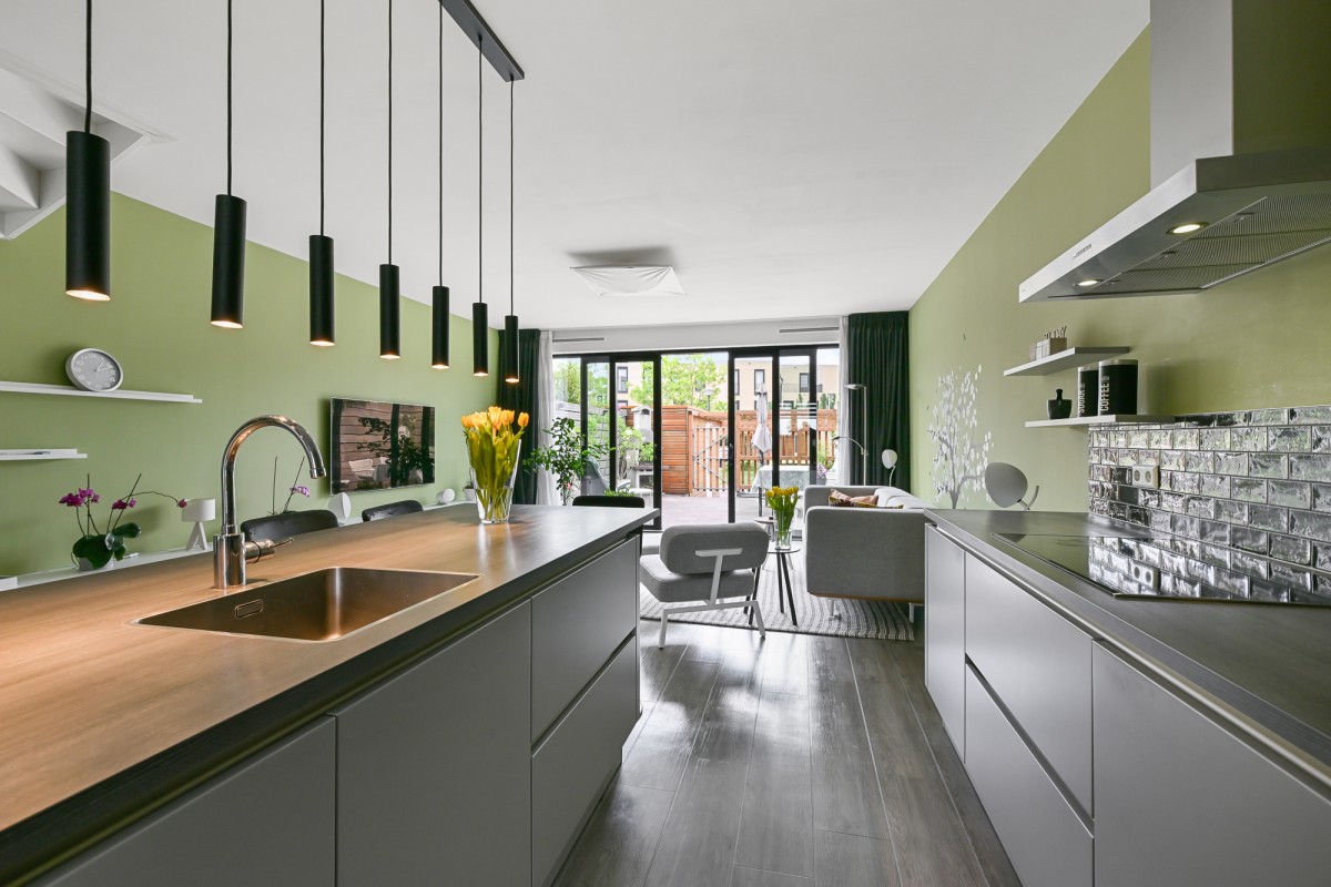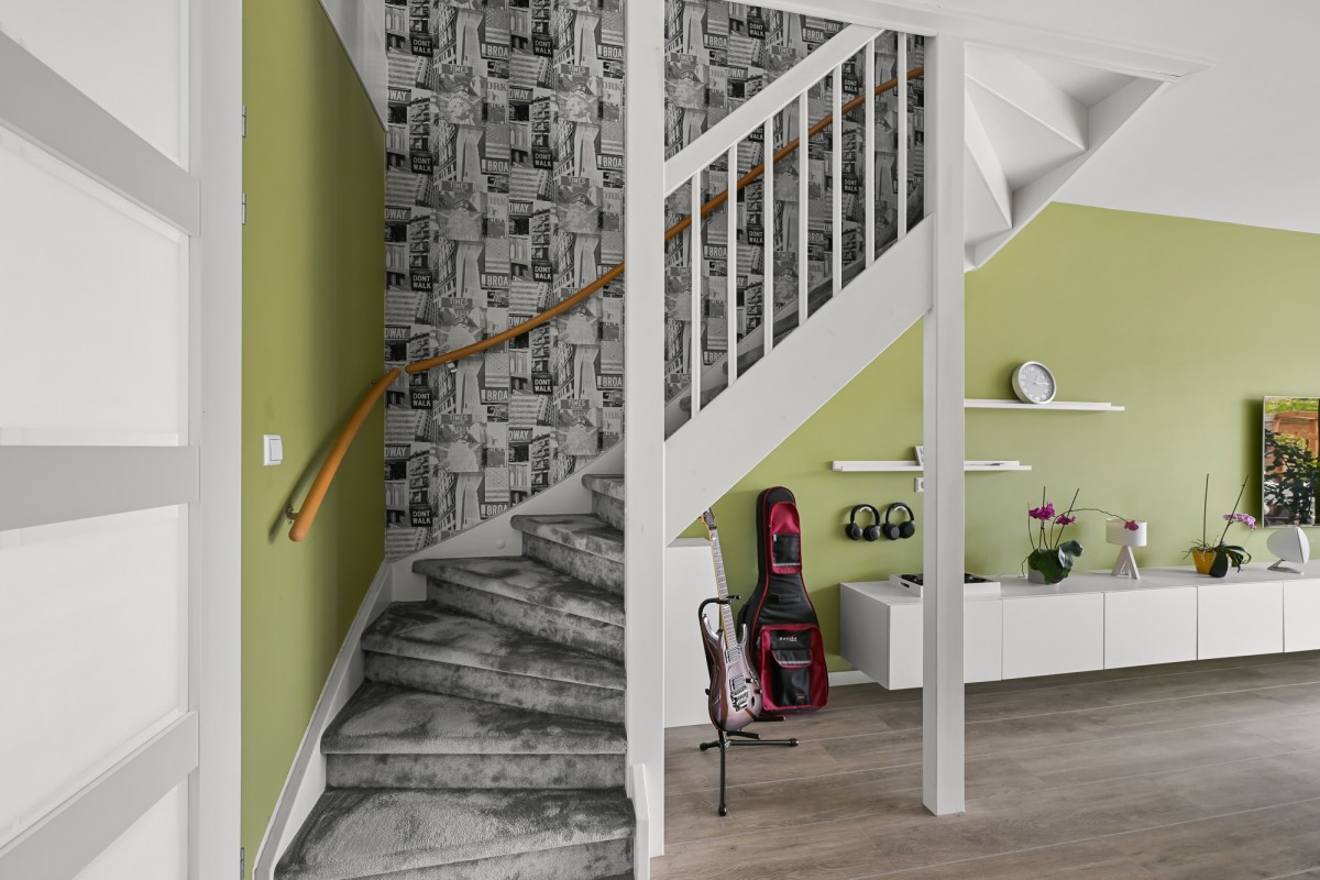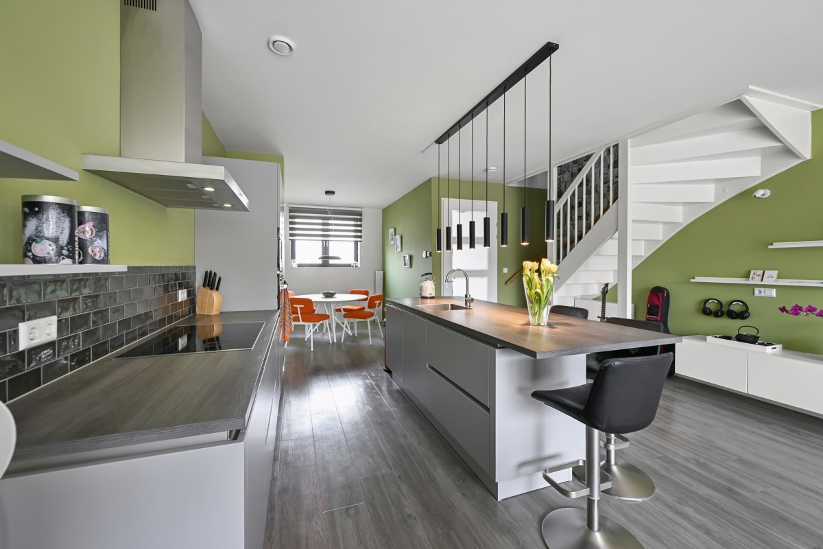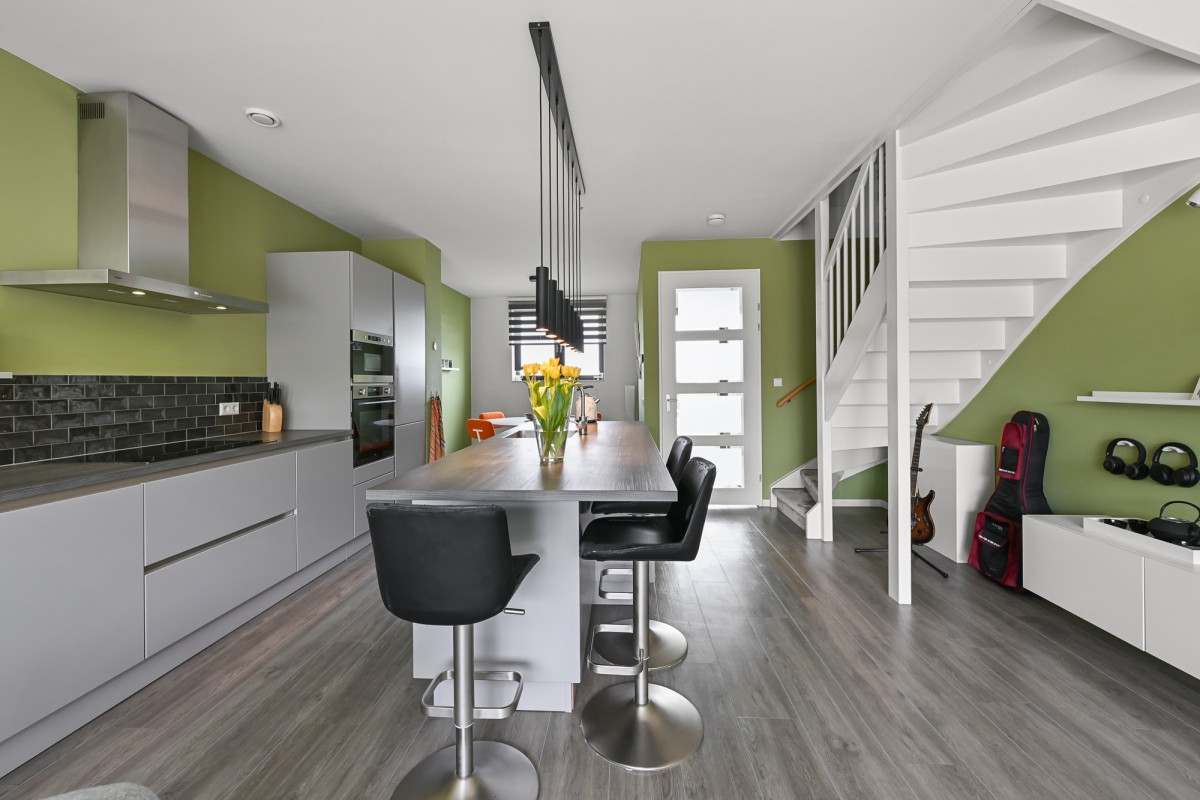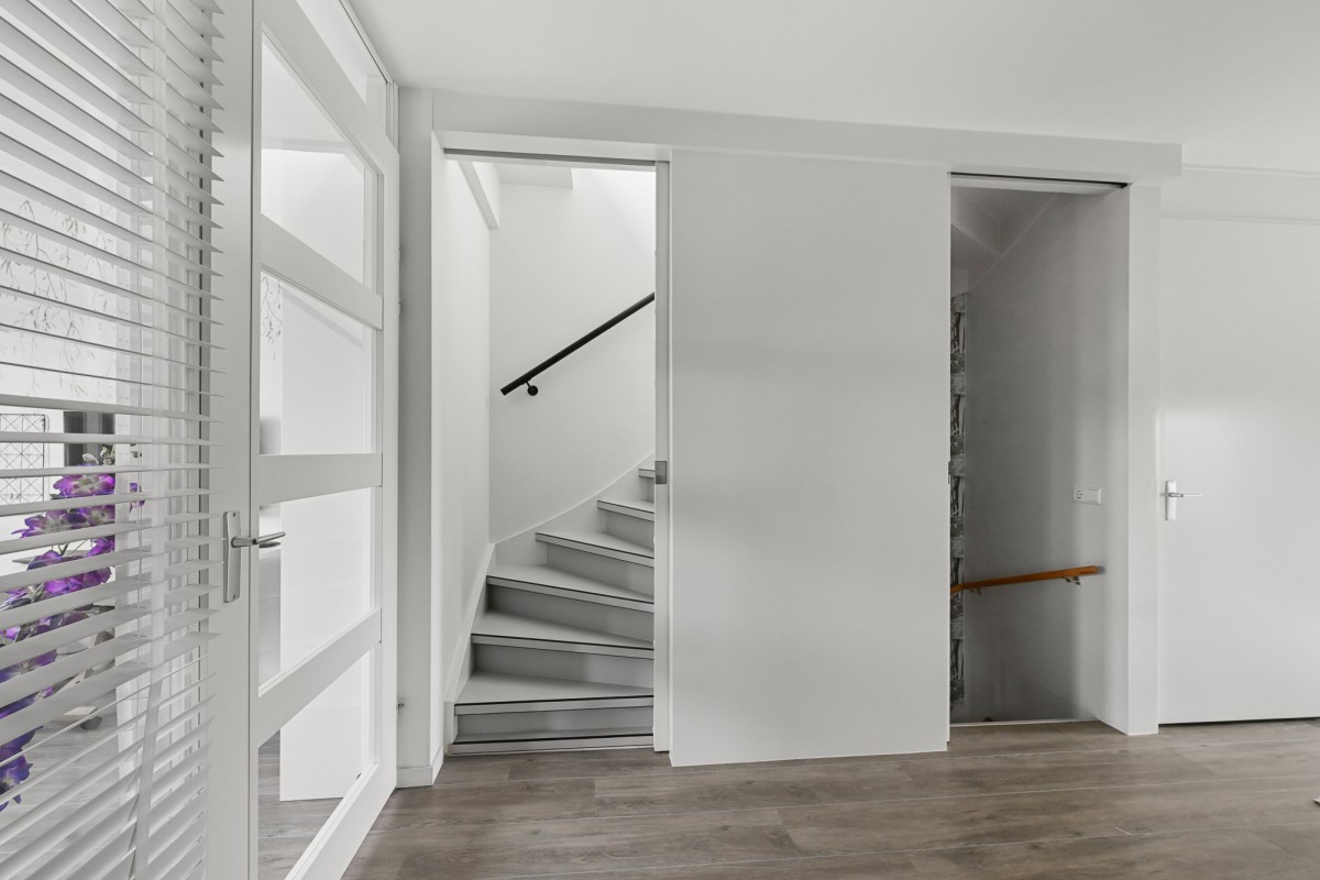 The living room is at the rear of the house and spans the full width. Thanks to the large windows and sliding doors, plenty of daylight enters, creating a pleasant and bright living area. The sliding doors provide direct access to the sunny garden facing southwest, where you can enjoy the sun until evening. The garden has a practical rear entrance and a private parking space, adding extra convenience. The entire ground floor features a stylish and low-maintenance PVC floor.