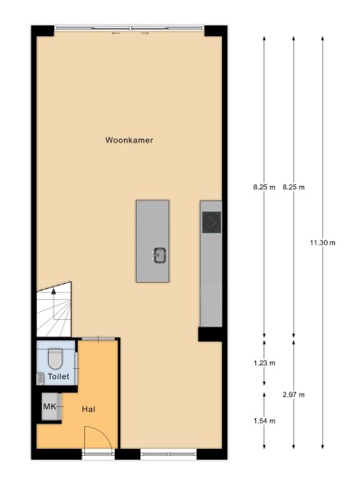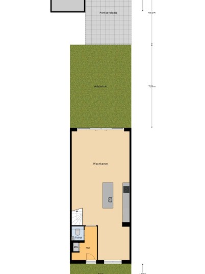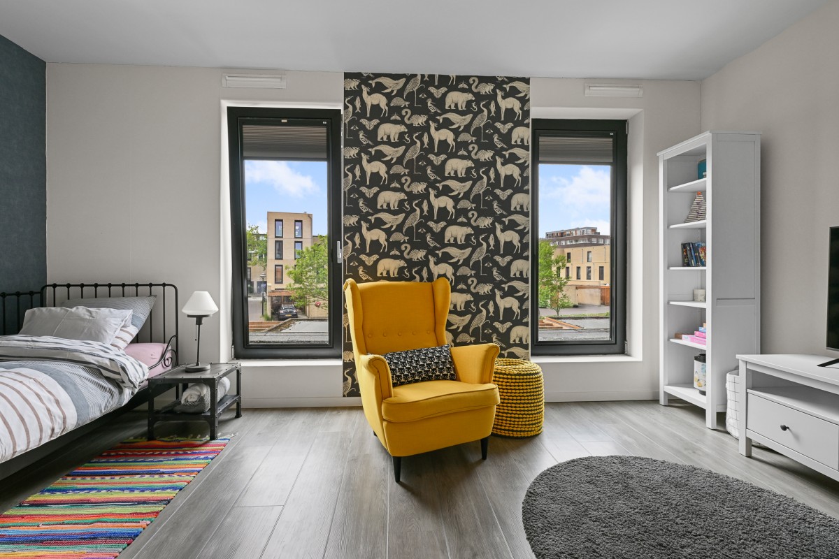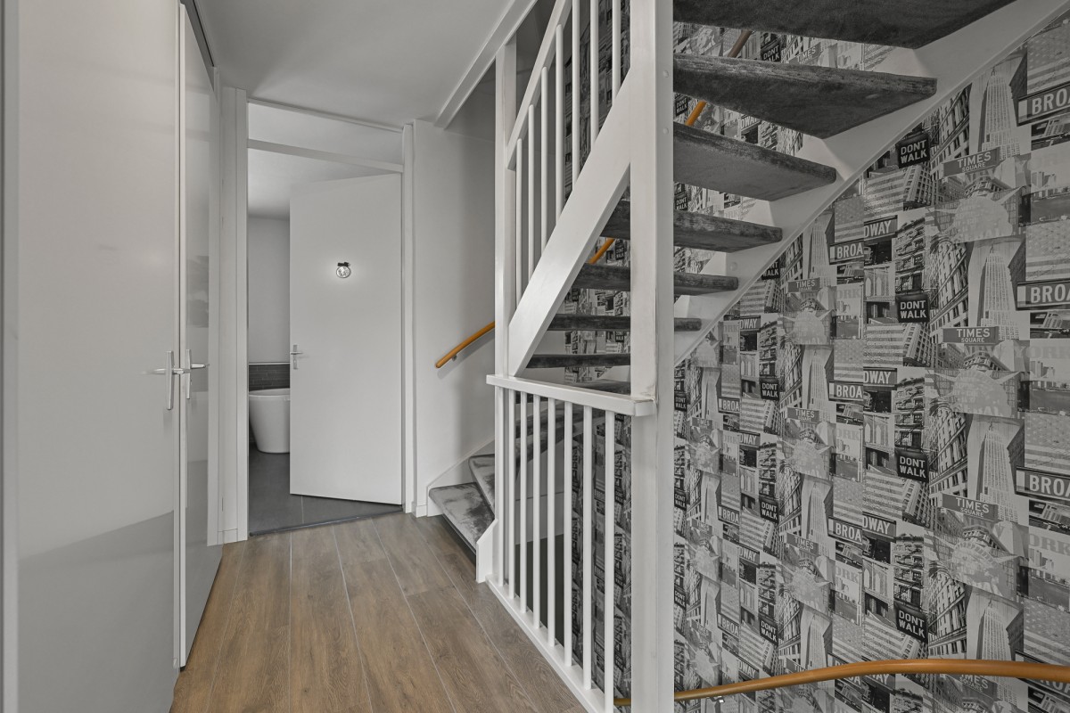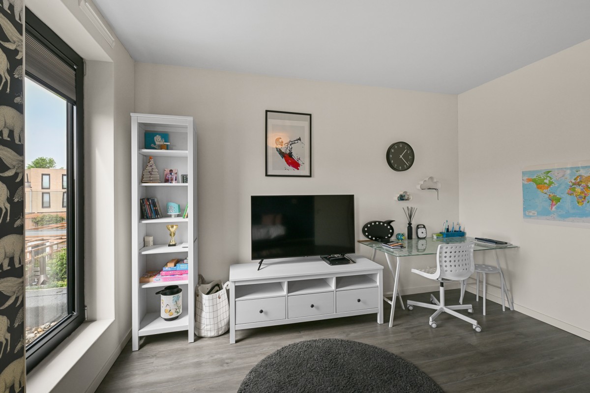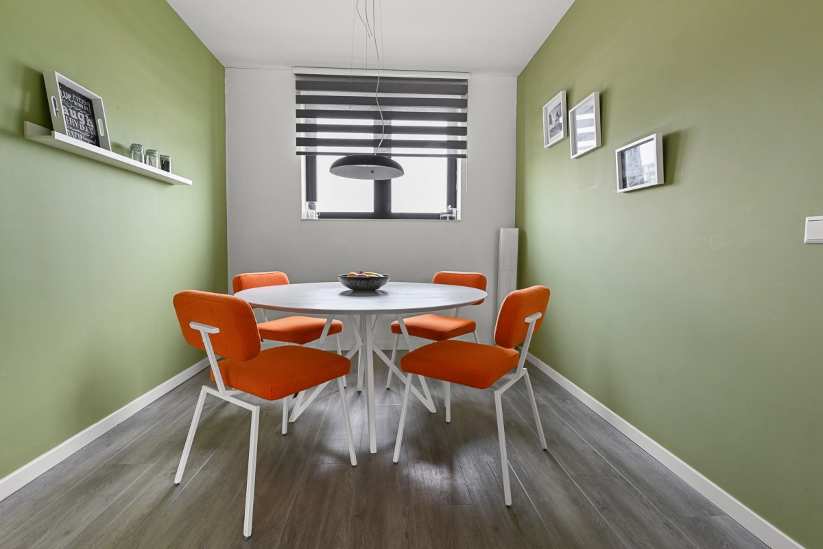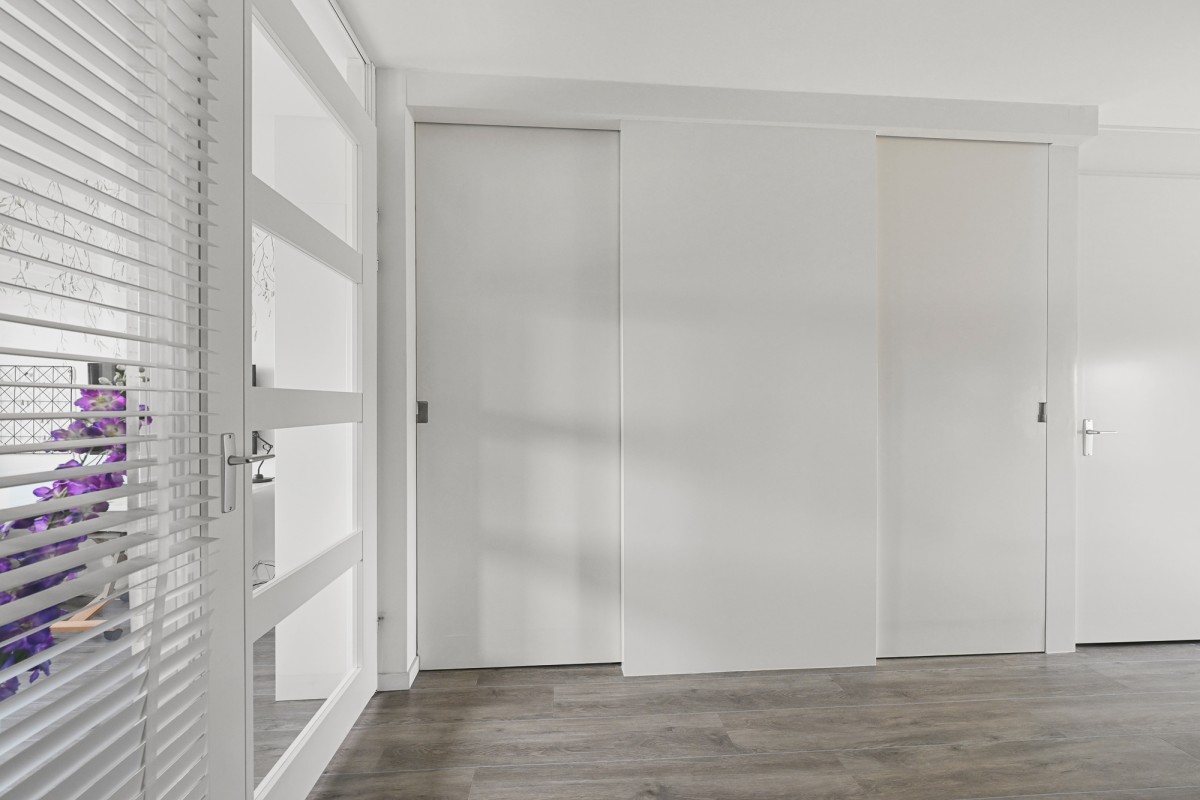 The living room is at the rear of the house and spans the full width. Thanks to the large windows and sliding doors, plenty of daylight enters, creating a pleasant and bright living area. The sliding doors provide direct access to the sunny garden facing southwest, where you can enjoy the sun until evening. The garden has a practical rear entrance and a private parking space, adding extra convenience. The entire ground floor features a stylish and low-maintenance PVC floor.
