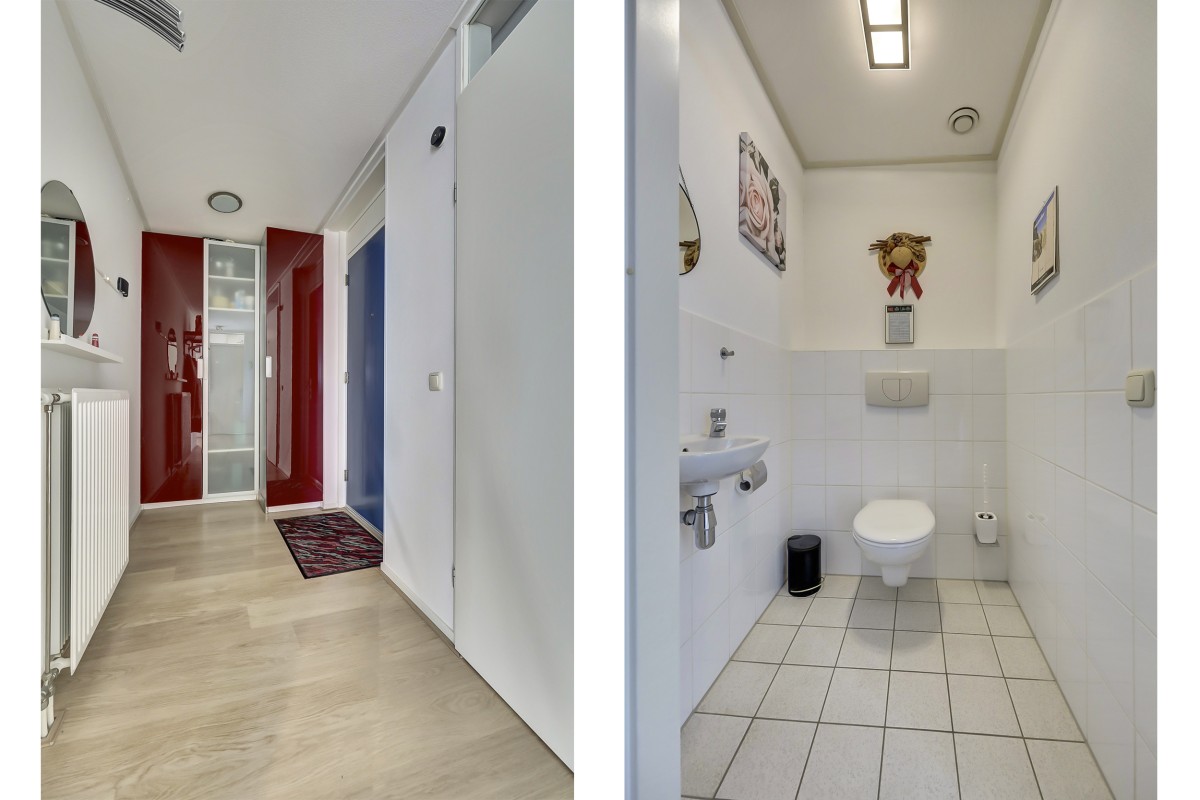 Lees verderDe toiletruimte is voorzien van een hangcloset met handwasbakje.