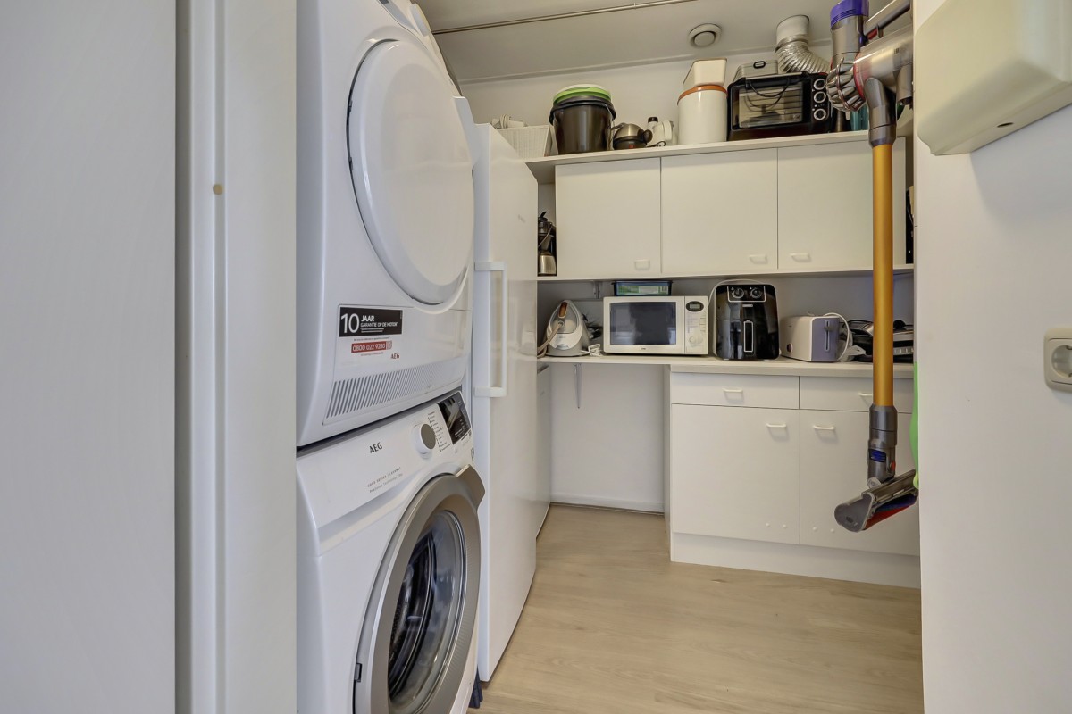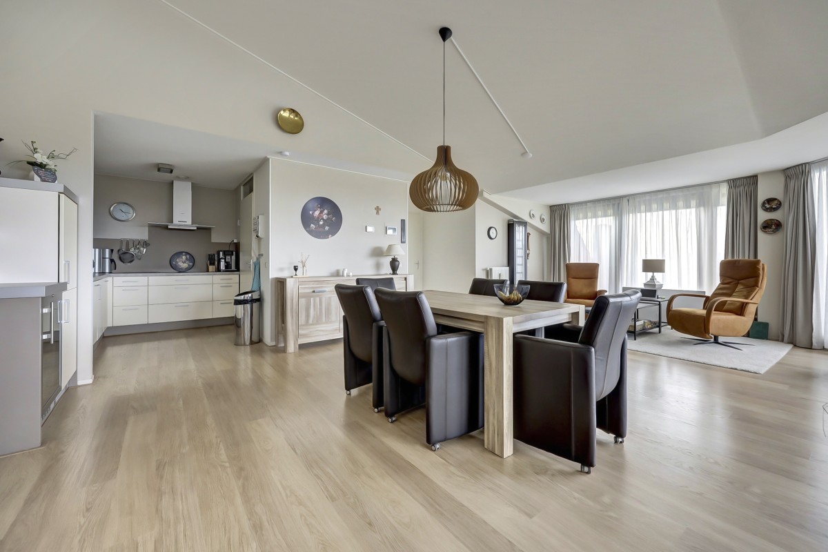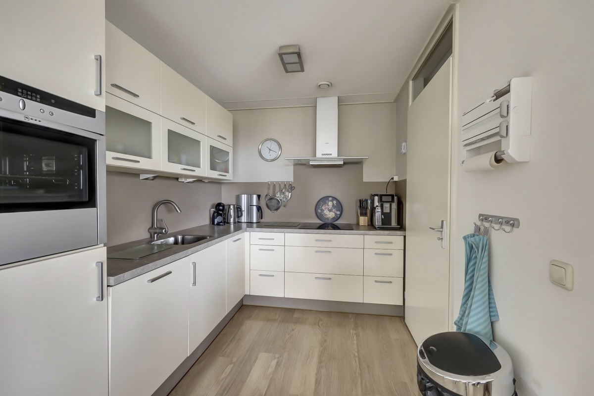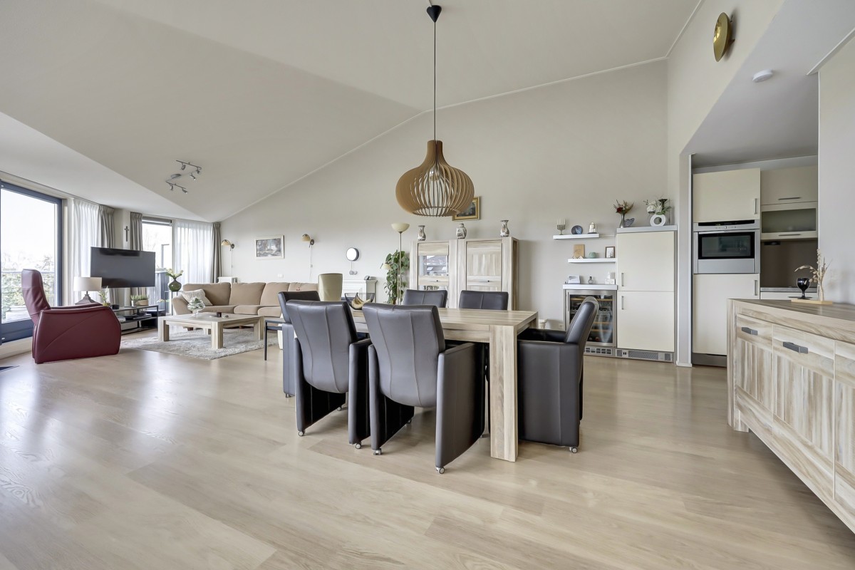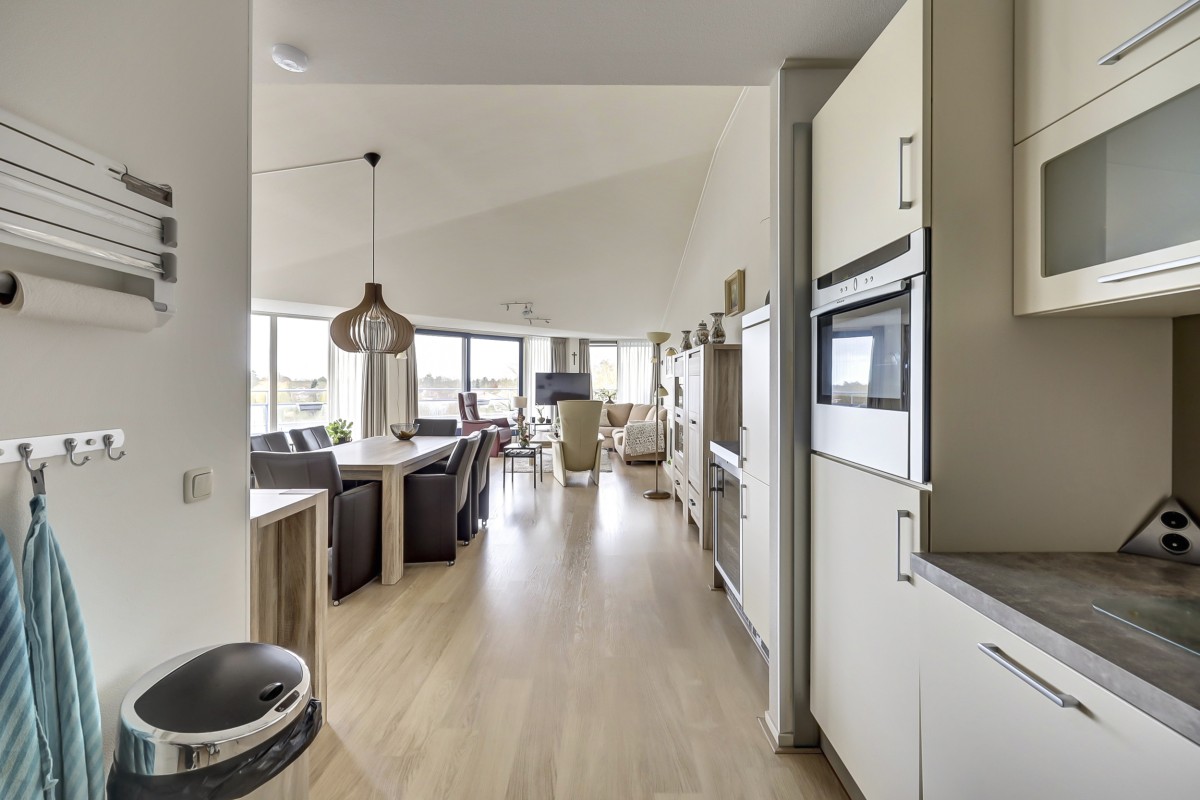De woonkamer kent vele pluspunten: de grote glaspartij welke een prachtig uitzicht biedt, het hoge plafond waardoor de kamer extra ruim aandoet en de twee schuifpuien met toegang tot het royale dakterras. Aansluitend aan de woonkamer bevindt zich de keuken welke in een hoek is opgesteld. De keuken is voorzien van een koelkast, een heteluchtoven (Neff), vaatwasser (Miele), wijnklimaatkast (Liebherr) en kookplaat met recirculatie afzuigkap. De keuken biedt tevens veel berg- en werkruimte. Aangrenzend is de bijkeuken gelegen voorzien van de wasmachineaansluiting, mechanische ventilatie en de c.v.-ketel (Intergas HR 2023).