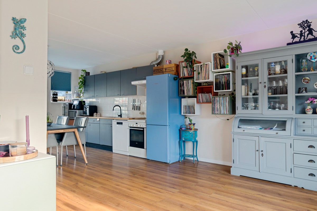 The living room flows seamlessly into the open kitchen, equipped with freestanding appliances. This gives you full freedom to customize the kitchen to your taste. You could, for instance, install a new kitchen in the color, layout, and with the appliances of your choice, so the space perfectly matches your personal style and living needs.