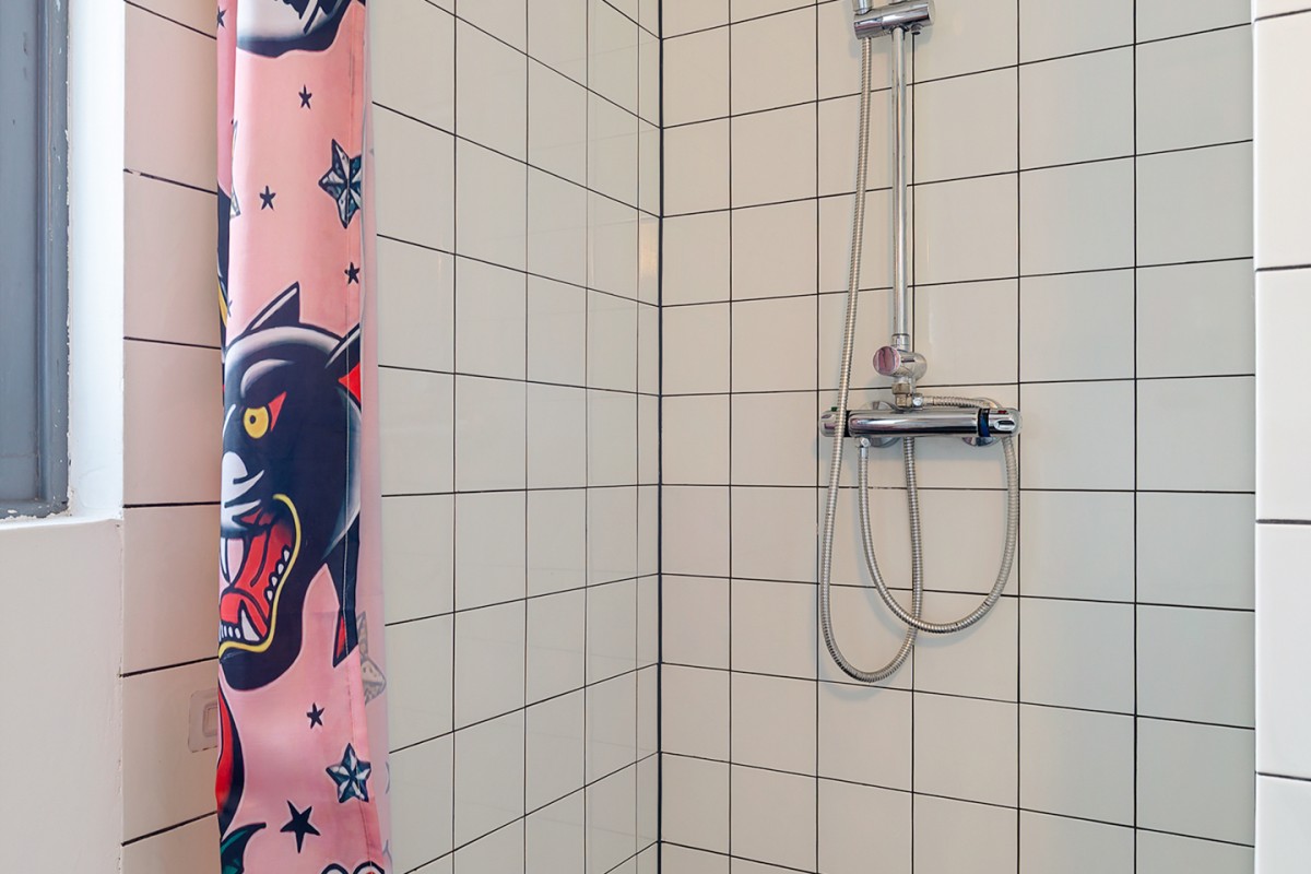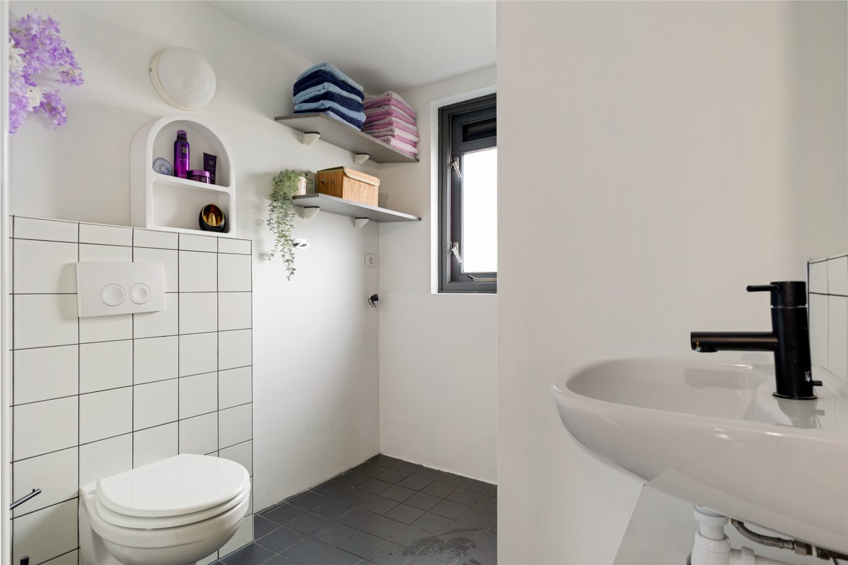The bathroom is equipped with a second toilet, a shower, and a vanity unit. Connections for a washing machine and dryer are also available. A window that can be opened ensures natural ventilation, keeping the space fresh and bright.