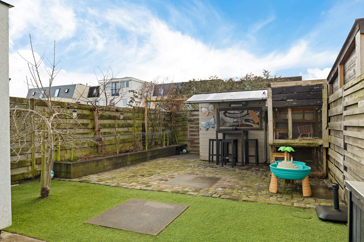 The southeast-facing rear garden is a delightful spot for relaxation. The garden features a terrace, fencing all around, and a variety of plants and shrubs, offering something beautiful to see throughout the year. At the back of the garden stands a spacious wooden shed, perfect for storing tools and bicycles. Additionally, there is a convenient back entrance, making garden use extra practical.