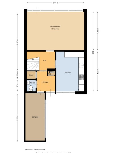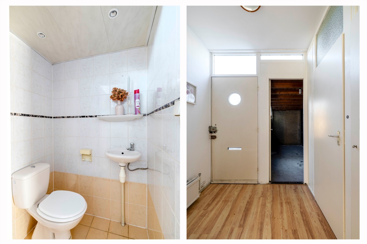 Entrance/hall with access to the meter cupboard (with fiber optic connection), a toilet with a sink, a door to the attached storage room, a storage closet, the staircase to the first floor, and the door to the living room.