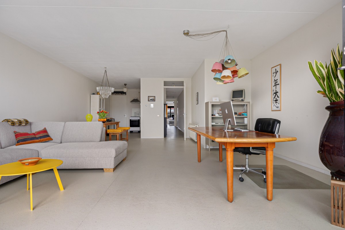 The living room flows seamlessly into the open-plan kitchen, which is equipped with freestanding appliances. This allows you to fully customize the kitchen to your liking. You can have a new kitchen installed in the color, layout, and with the appliances of your choice.