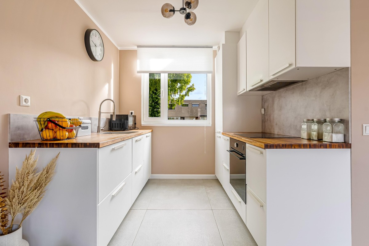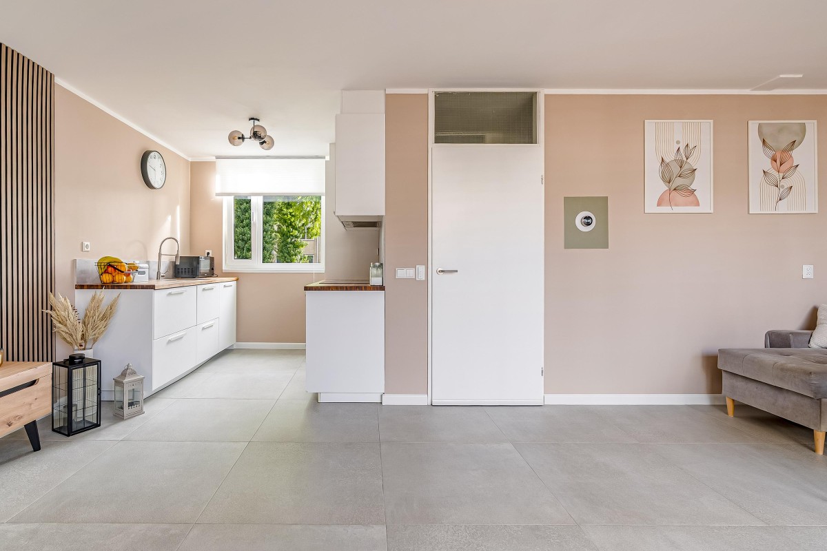 At the front of the house, you will find the open built-in kitchen (2019). The kitchen is equipped with a ceramic cooktop, dishwasher, and oven. There is plenty of storage space in the drawers and cabinets.