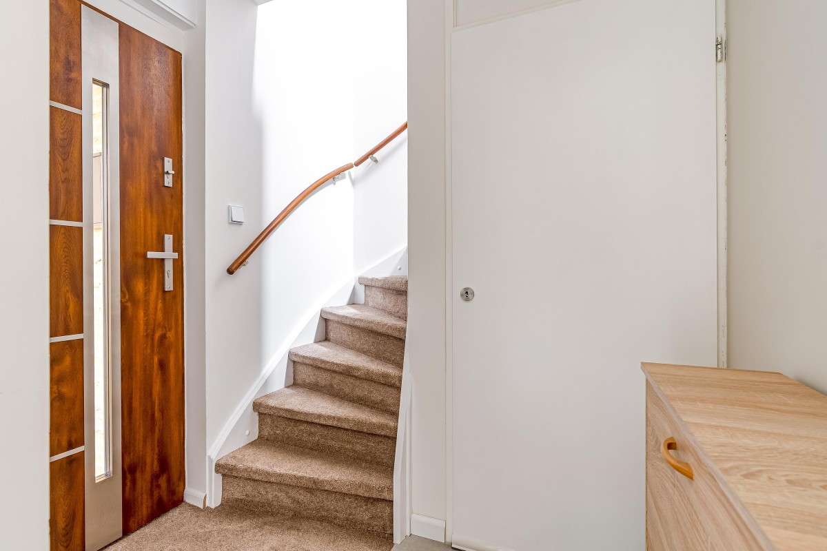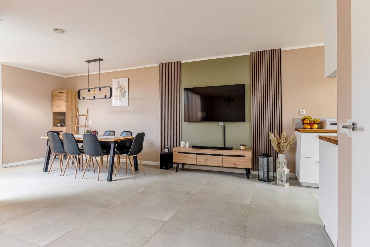 Through the front garden, you reach the entrance, where you enter a spacious hallway. The hallway provides access to the meter cupboard with fiber optic connection, the suspended toilet with a washbasin, the stairs to the upper floor (under the stairs is a wardrobe), and the door to the living room, which leads to the other rooms on the ground floor.