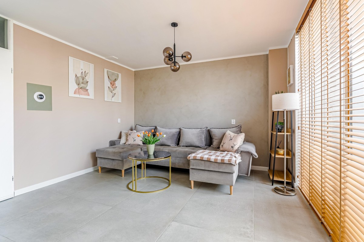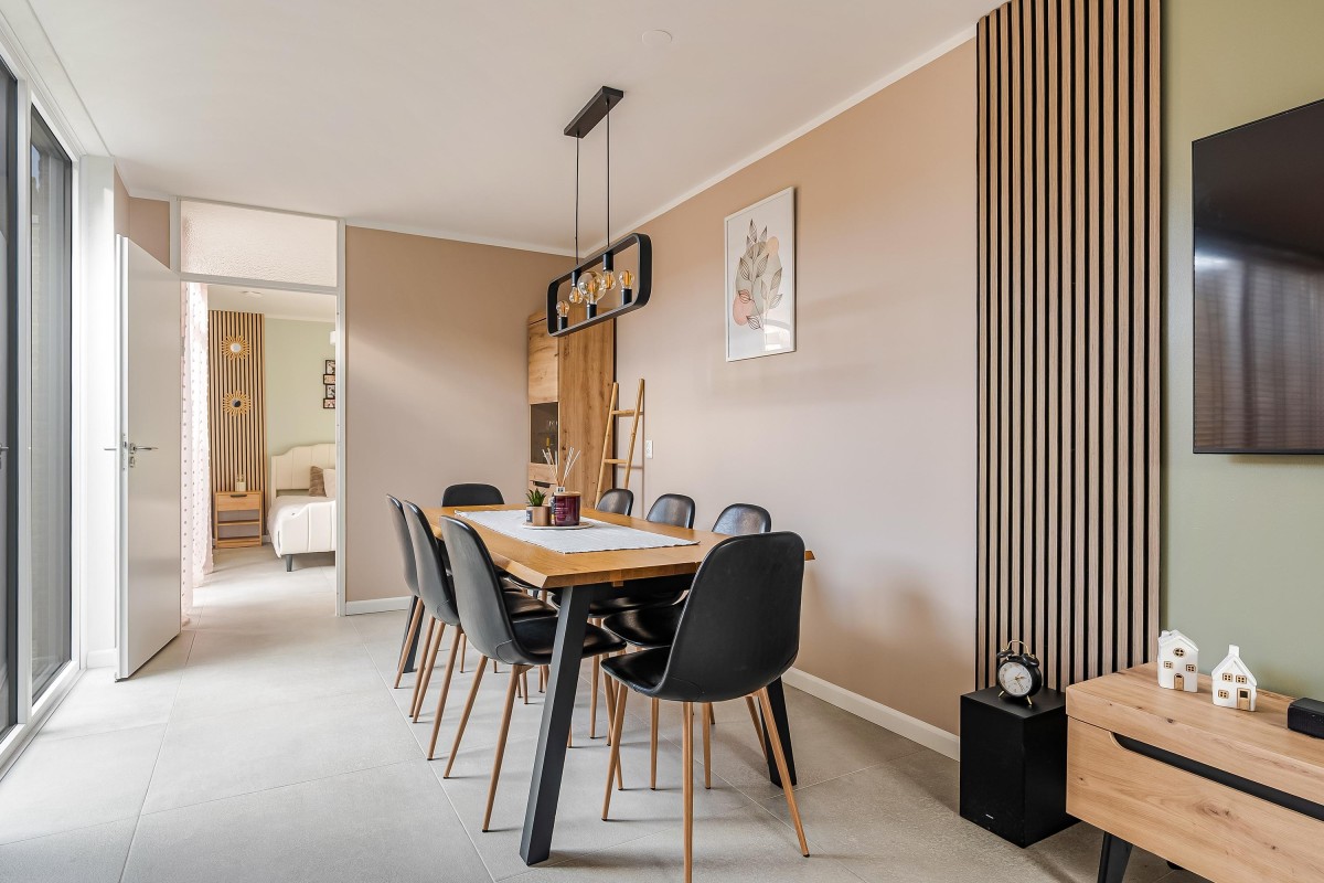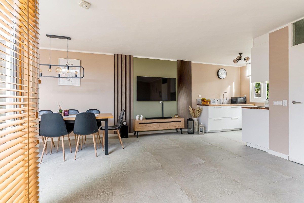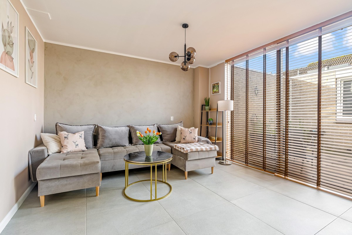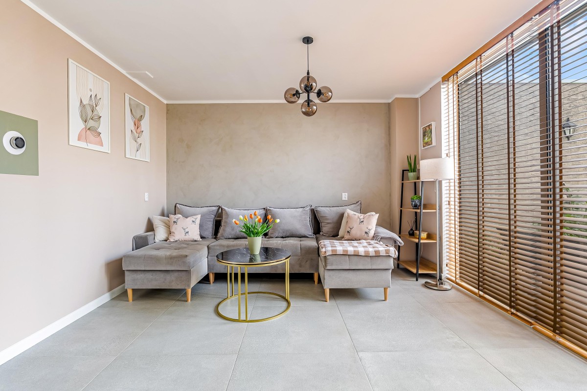The living room is wonderfully light due to the large windows. From the living room, you can access the secluded patio through the sliding doors, where you can enjoy the sun in complete privacy.