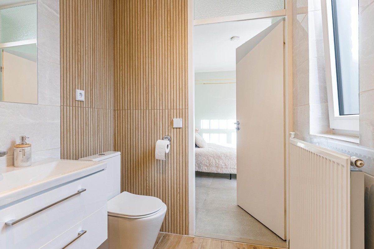 The bathroom was completely renovated in 2025 and is equipped with a shower, vanity unit, and a second toilet.