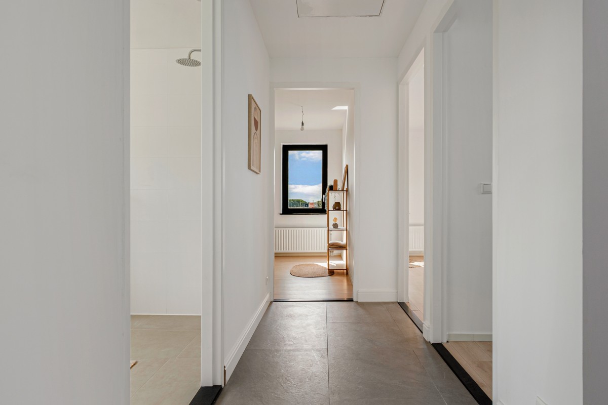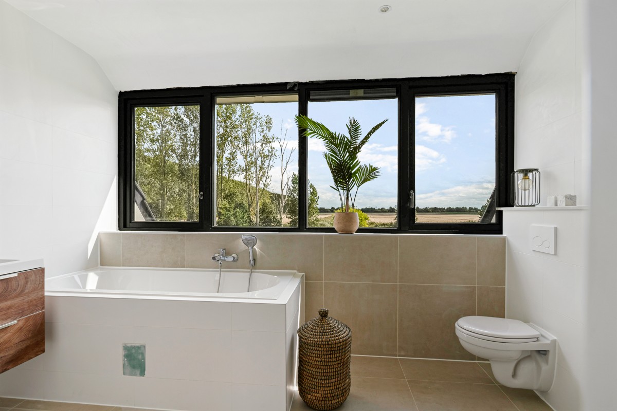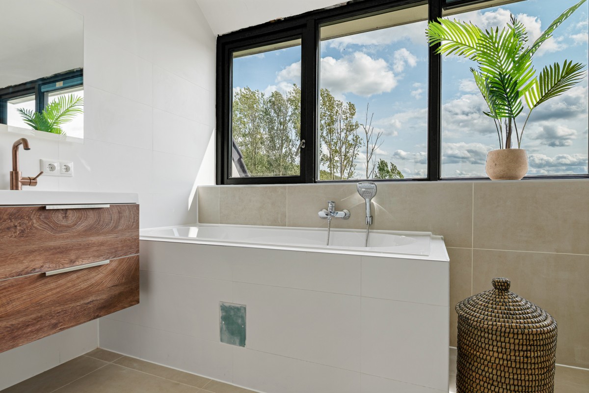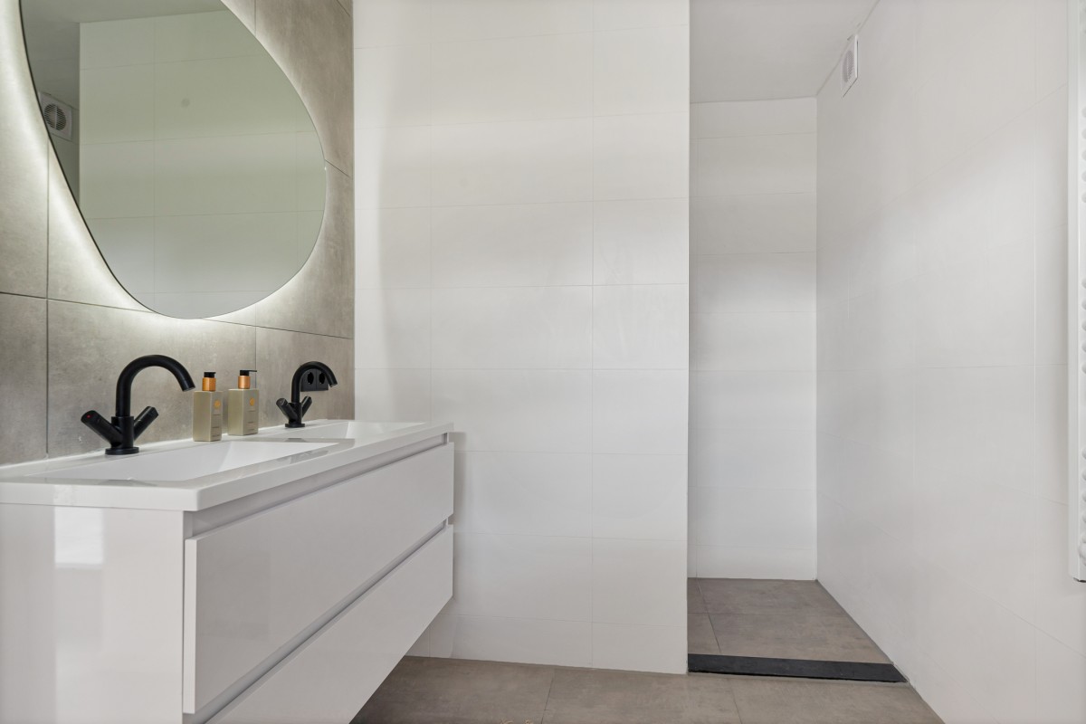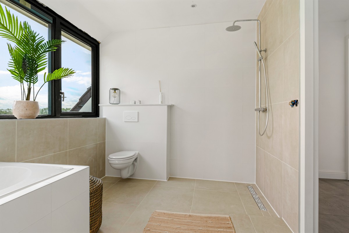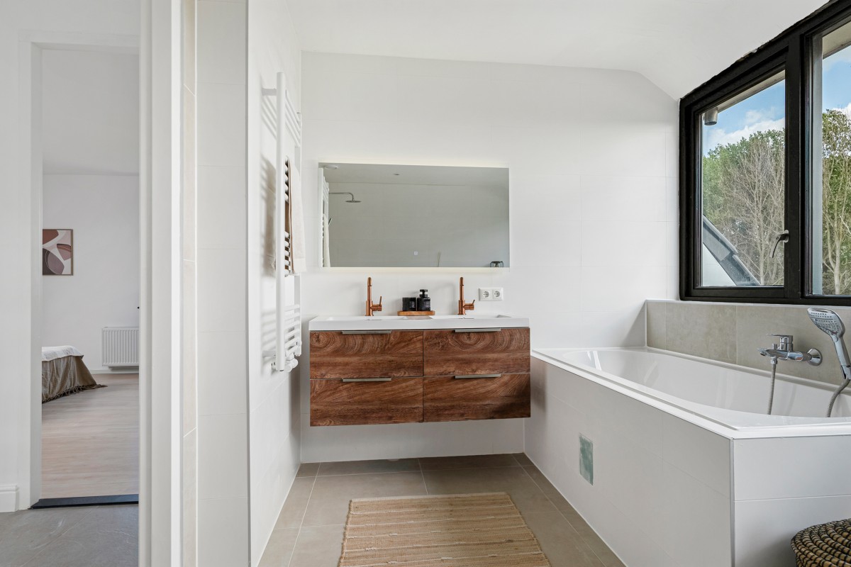 The luxury bathroom is equipped with a bathtub, vanity unit with double washbasin, walk-in rain shower, toilet, and designer radiator. For extra ventilation, there is an opening window. The floor is fitted with electric underfloor heating.
