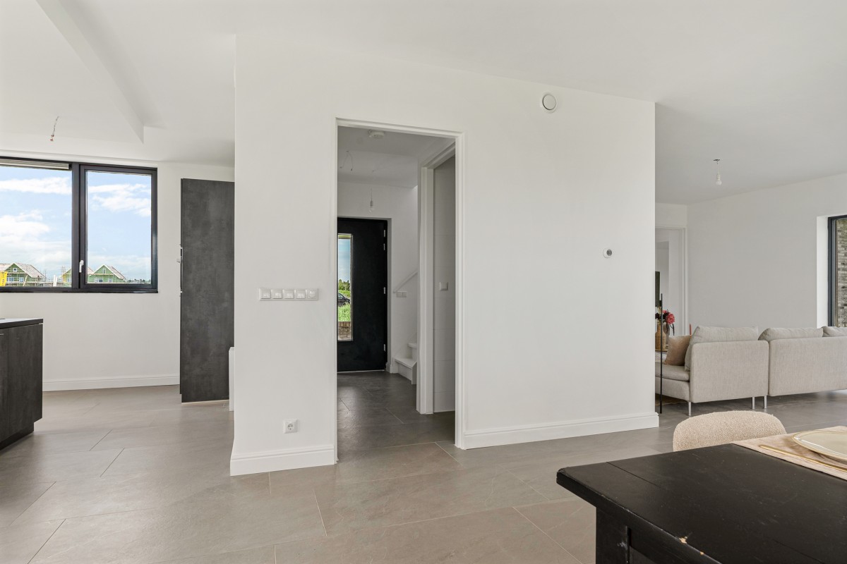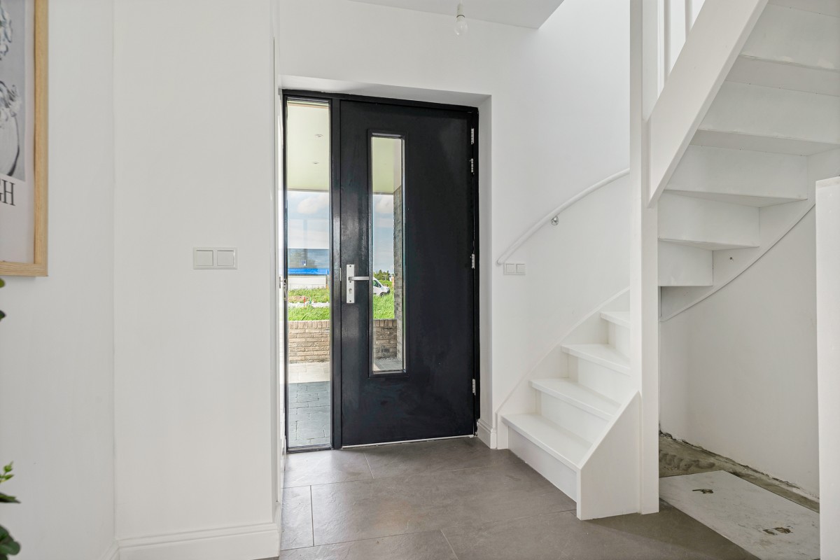 Entrance/hallway with access to the wall-hung toilet with wash basin, meter cupboard with fiber-optic connection, staircase to the first floor, and the living room.