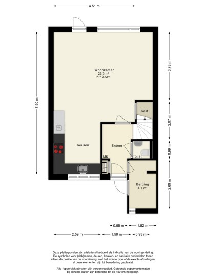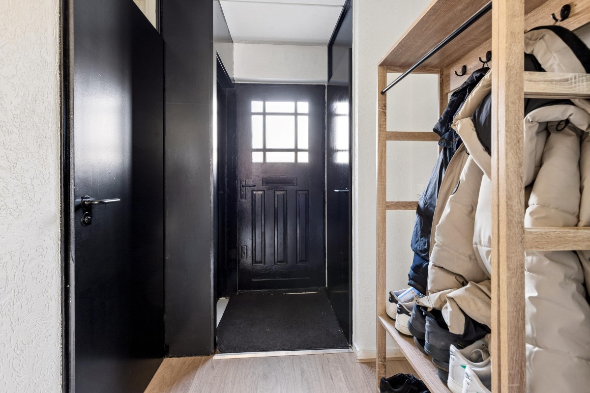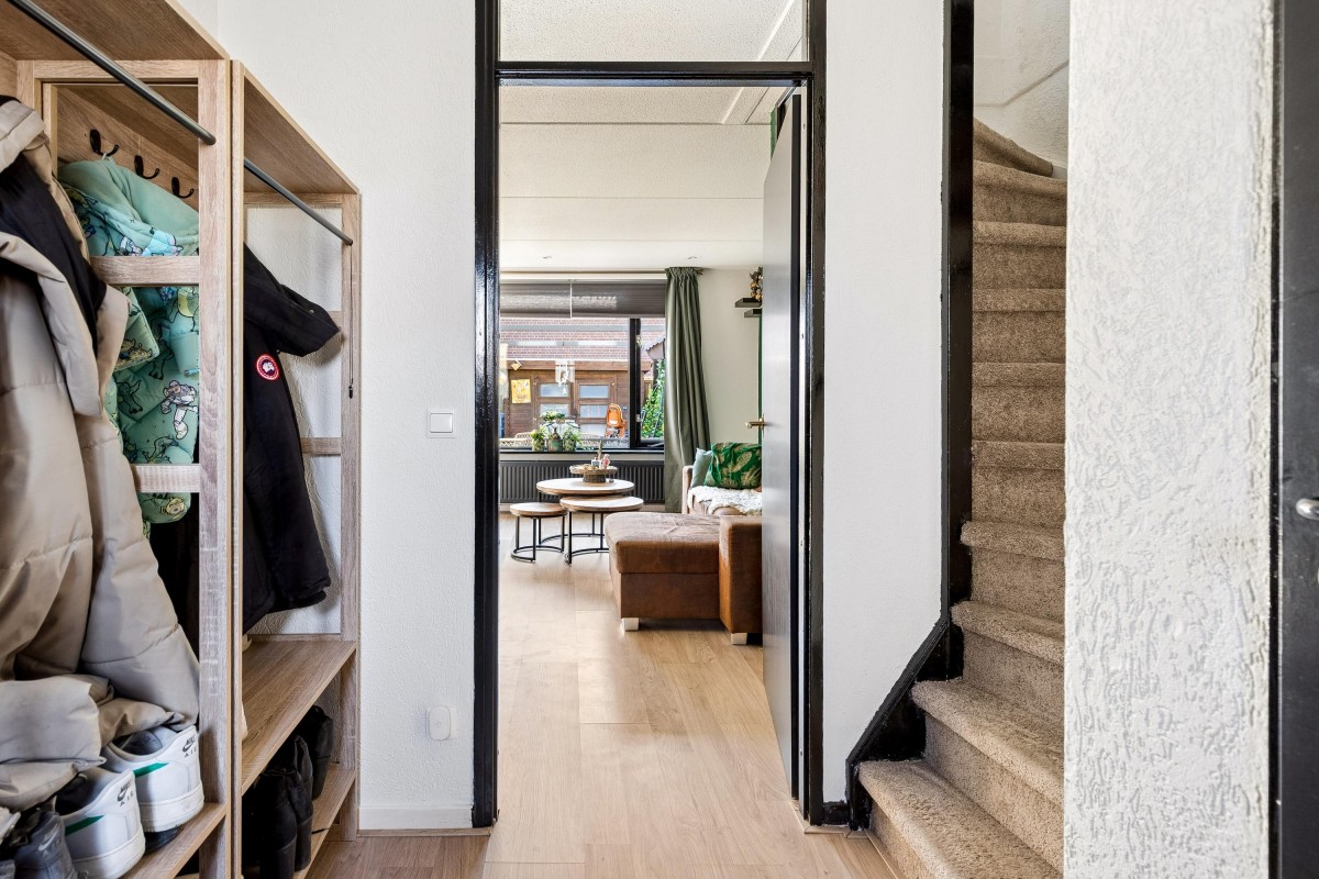 Through the entrance you reach the hallway with access to the storage room, toilet, staircase to the upper floor, and the living room.