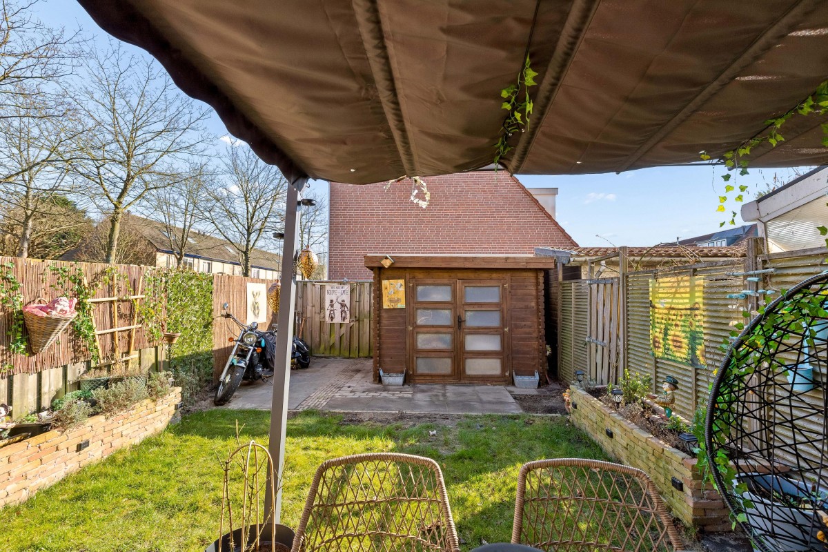 The backyard faces southeast, allowing you to enjoy the sun early in the day. The garden features a terrace, lawn, and a wooden storage shed. There is also a convenient back entrance (rear access).