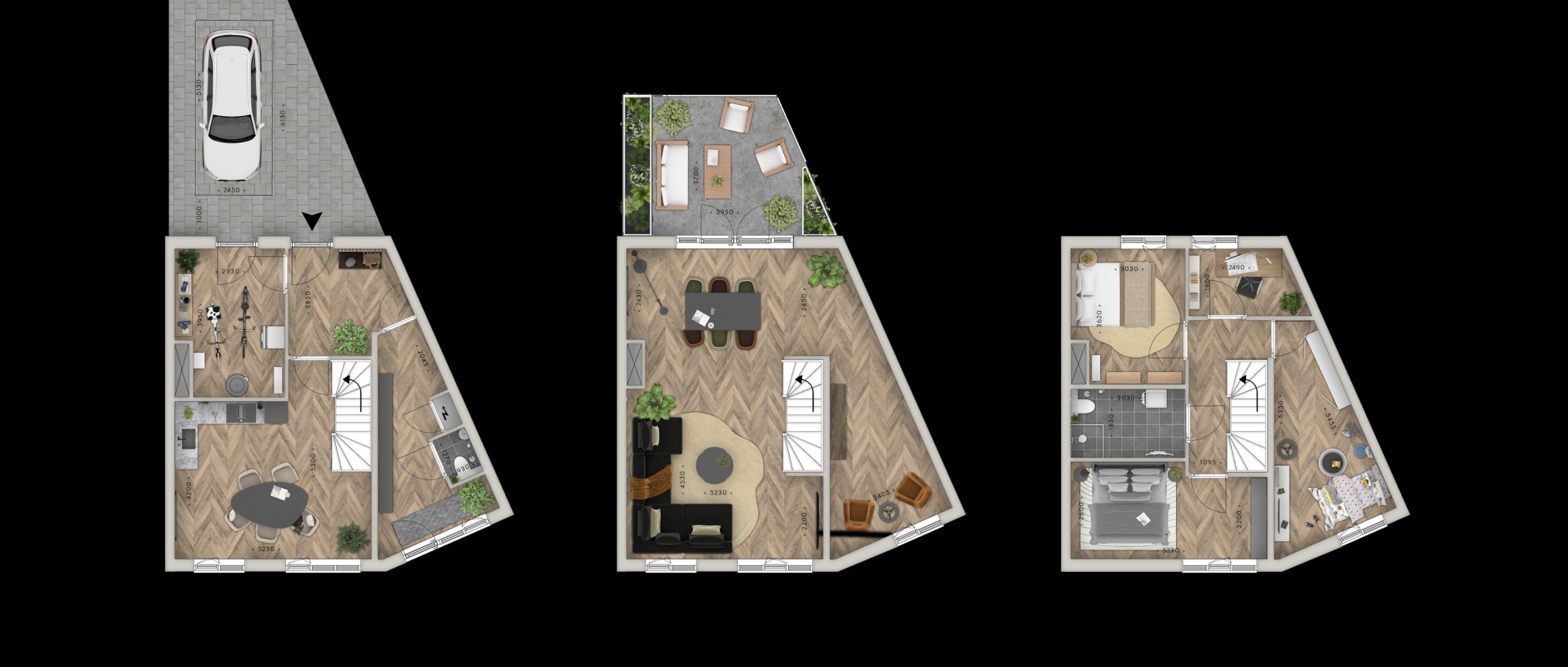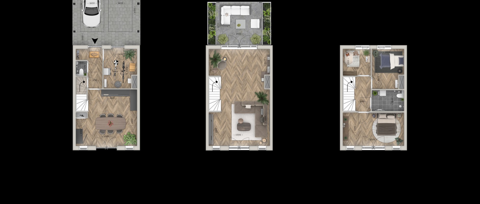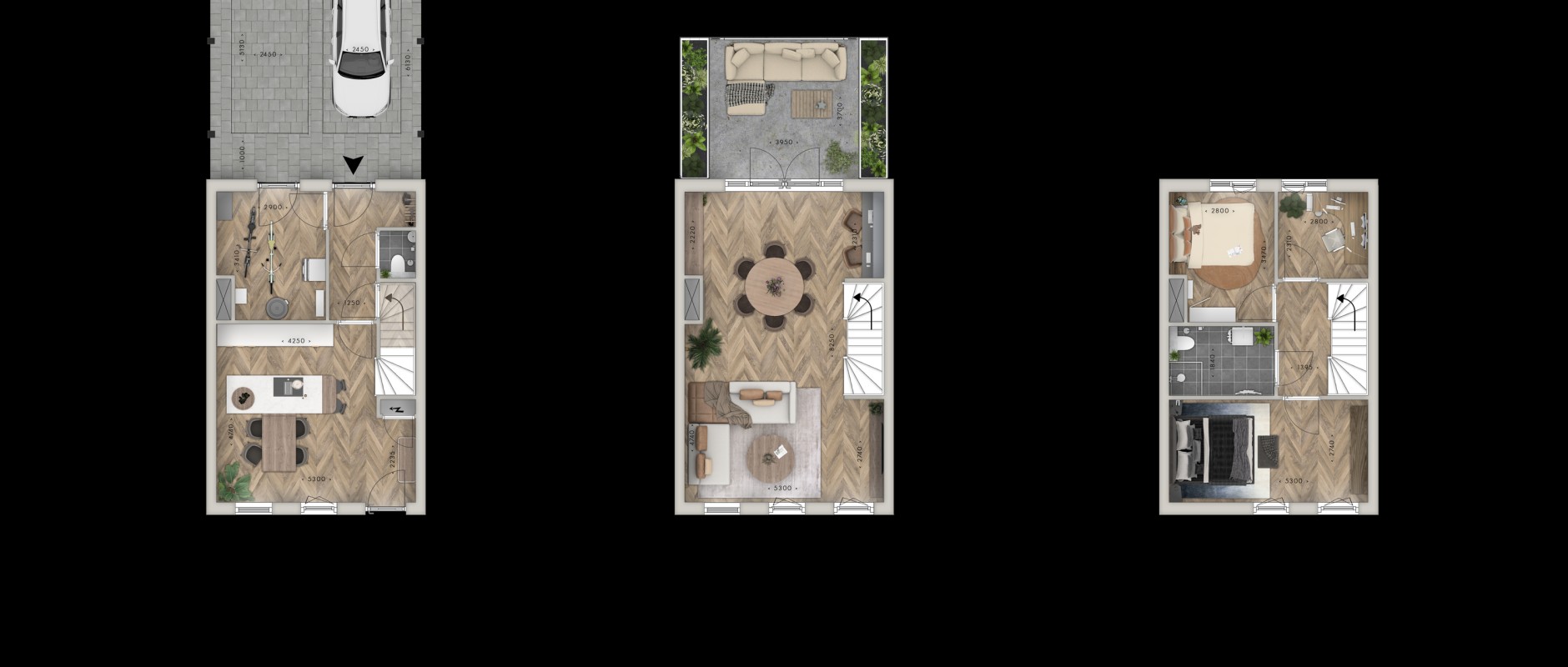 De 2 herenhuizen - special zijn uitgevoerd in een uniek gevelontwerp, waardoor ze een eigen karakter hebben. Elke woning telt drie woonlagen, met een grote woonkeuken op de begane grond, een living op de eerste verdieping en vier slaapkamers op de tweede verdieping. Vanuit de woonkamer boven het maaiveld loop je zo het vlonderterras op.