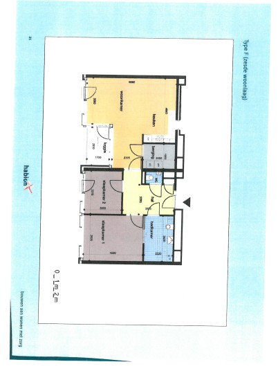 Via de brede hal kunnen zowel de 2 slaapkamers (+/- 15 m2 en 9 m2), de badkamer (+/- 7 m2) als de ruime woonkamer worden betreden (+/- 23 m2).