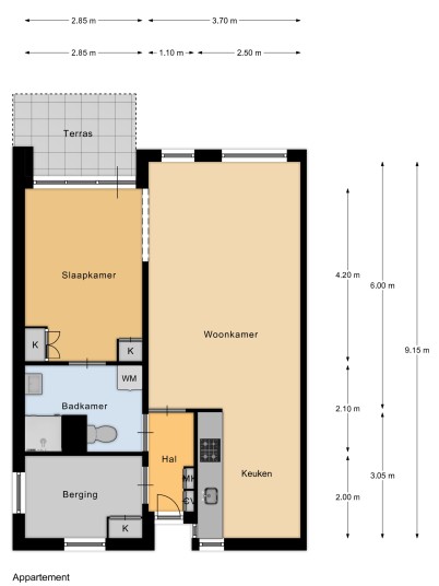 Wanneer u het appartement binnenkomt via de hal heeft u toegang tot de inpandige berging, badkamer en woonkamer. Vanuit de woonkamer komt u in de slaapkamer. De slaapkamer geeft toegang tot het terras en ook de badkamer is van daaruit bereikbaar.
