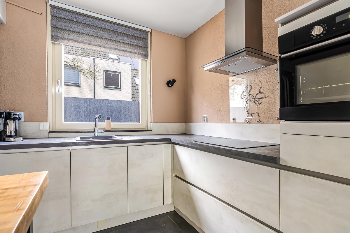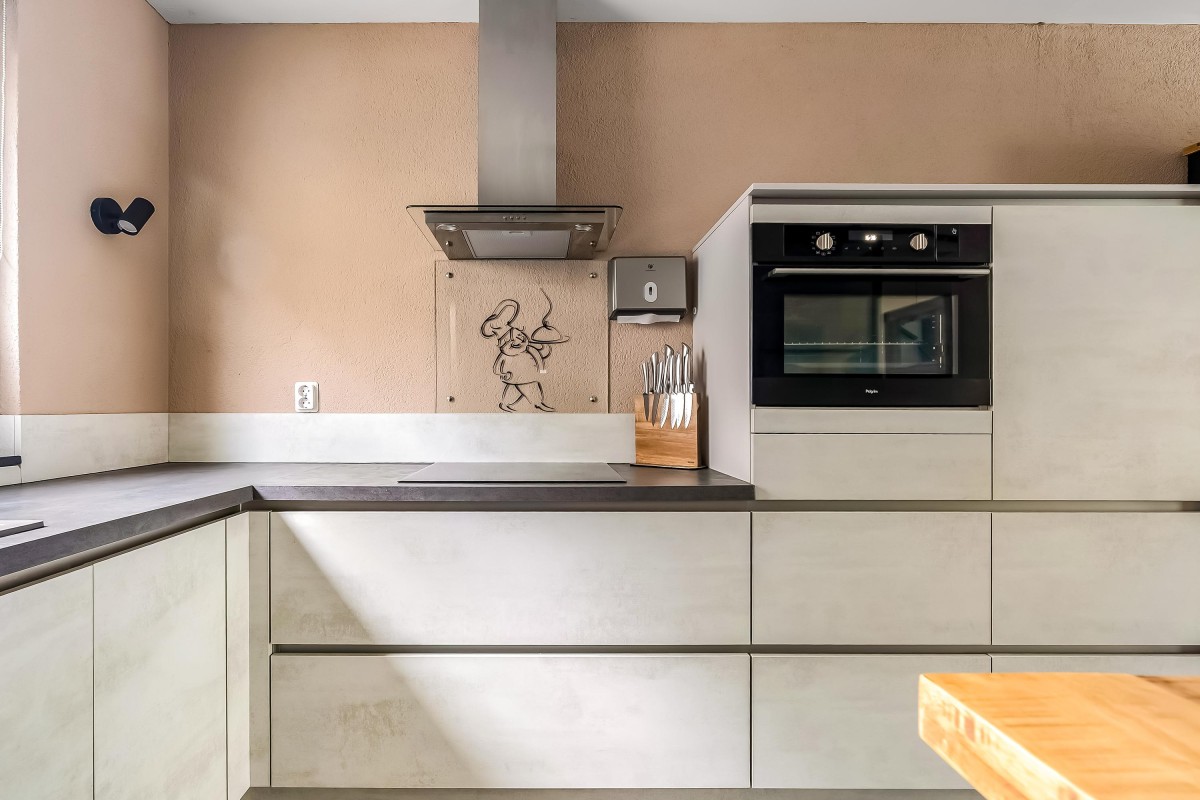 - L-vormige inbouwkeuken voorzien van inbouwapparatuur;