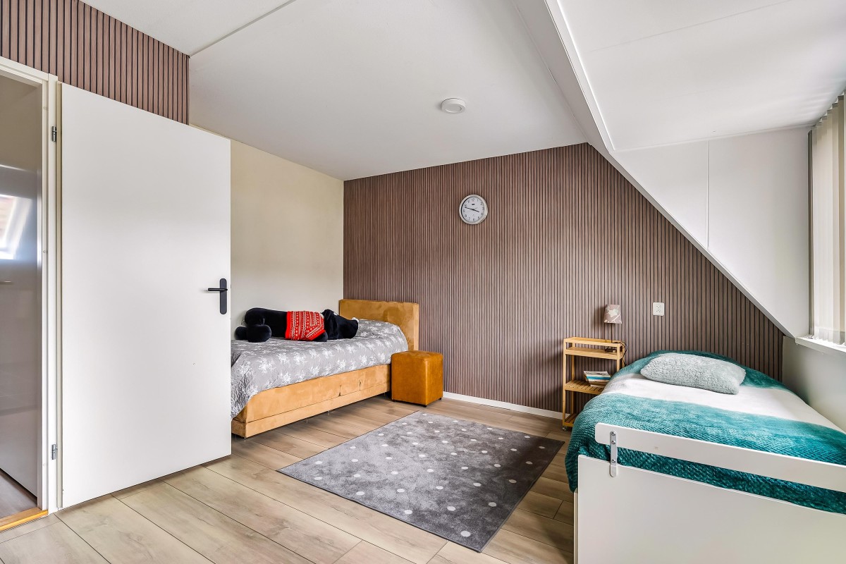 Overloop met toegang tot 2 ruime slaapkamers (ca. 18 en 12 m2) en de badkamer. De woning brede slaapkamer aan de achterzijde is voorzien van een dakkapel en rolluiken. Het is zeer eenvoudig om de oorspronkelijke 33 slaapkamer terug te plaatsen. De badkamer is volledig betegeld en uitgevoerd met een douchecabine, wastafelmeubel met twee wasbakken, 2e toilet, mechanische ventilatie en een raam voor extra ventilatie. De gehele verdieping is voorzien van een nette laminaatvloer.