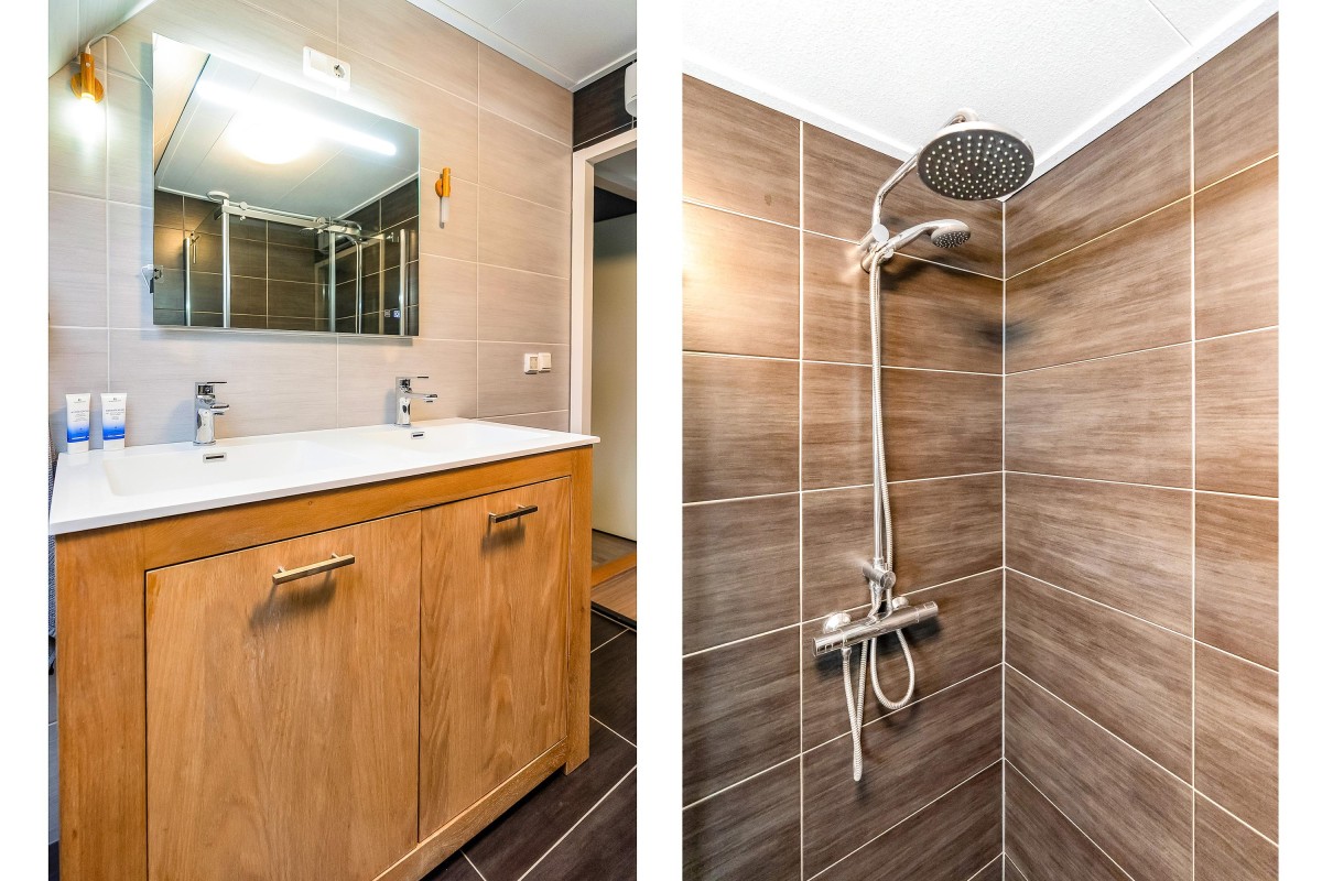 - Badkamer met douchehoek, wastafel met dubbele waskom en kraan en toilet;
