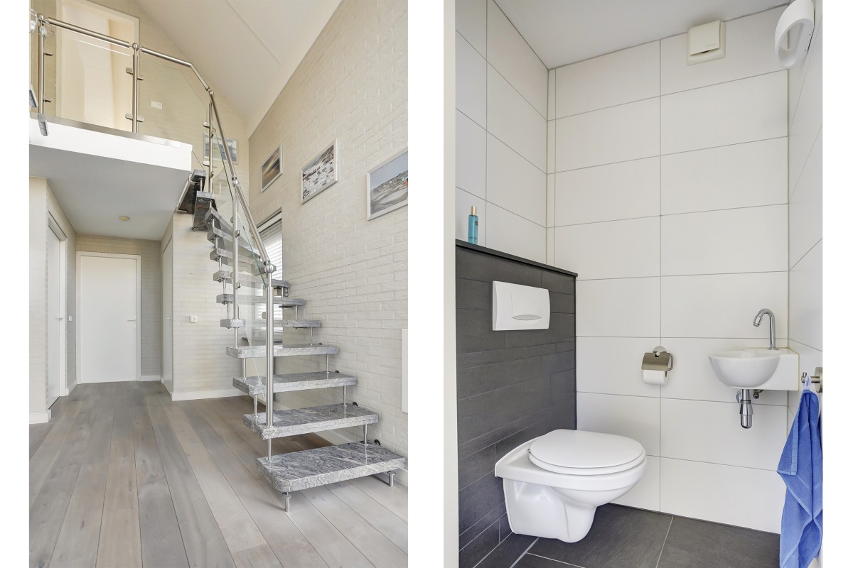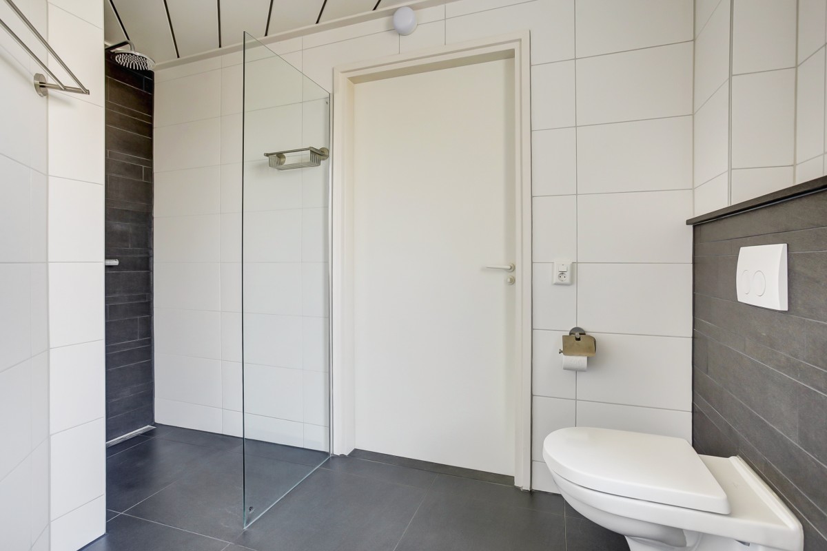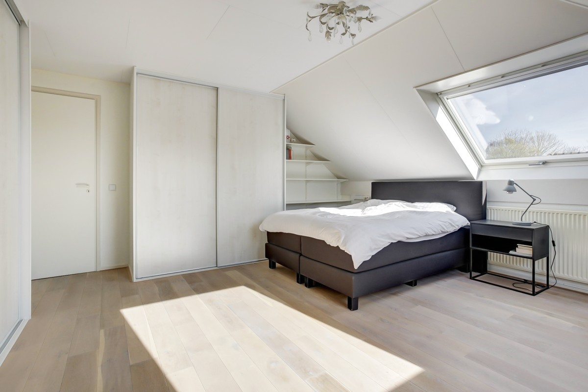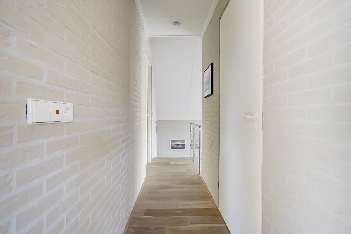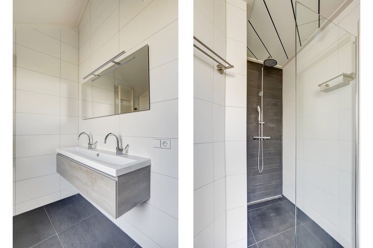 Eerste verdieping: design trap met natuurstenen treden naar de vide/overloop met aansluitend 3 royale slaapkamers voorzien van houten vloer, berging en de luxe tweede badkamer. 2 slaapkamers beschikken over een dakkapel. De tweede moderne badkamer is voorzien van een douche, wastafel, hangcloset en Velux dakraam. Aan de overloop is tevens een diepe berging aanwezig waar de c.v.-ketel (Intergas HR) opgesteld staat.