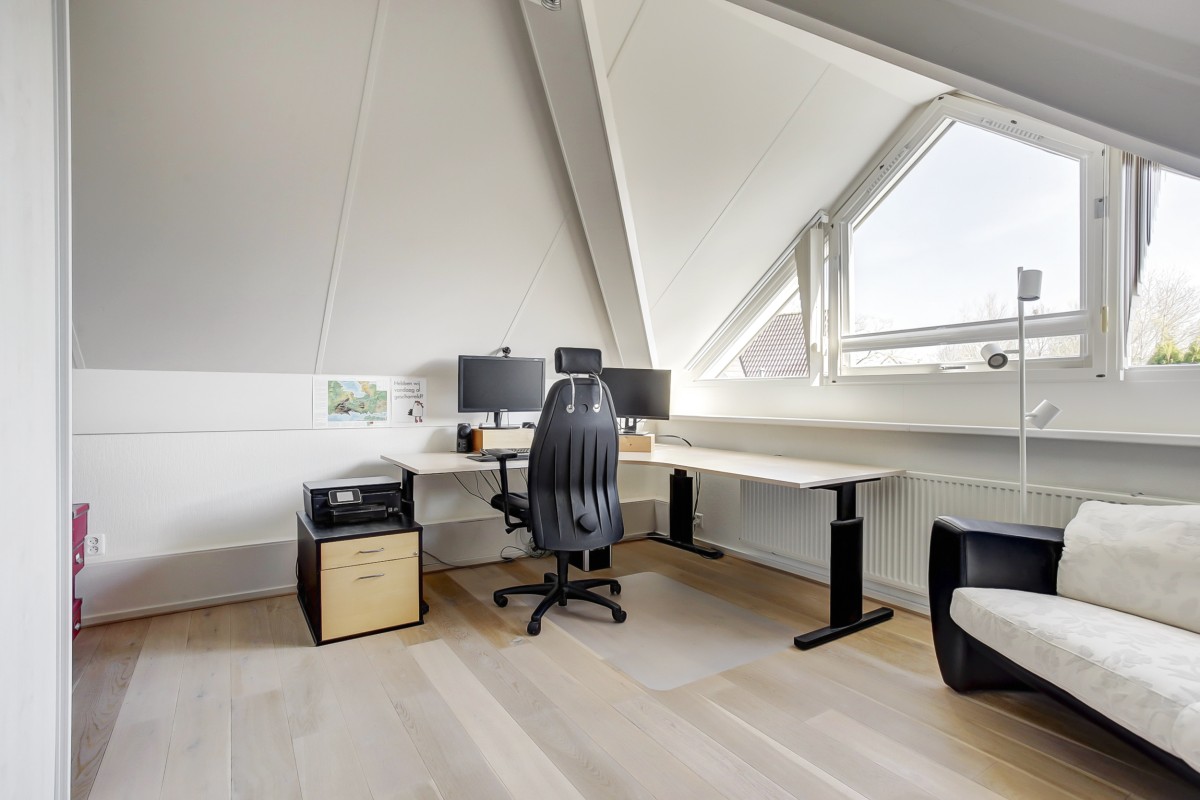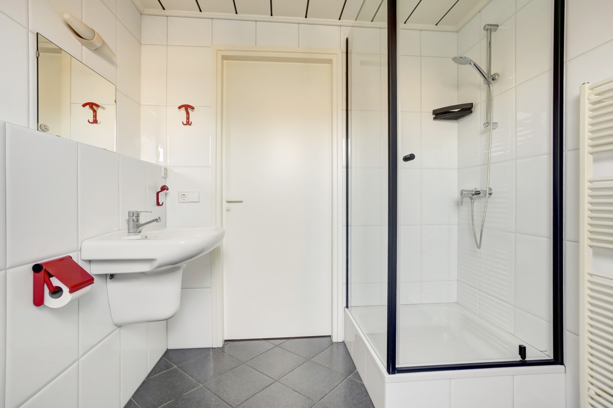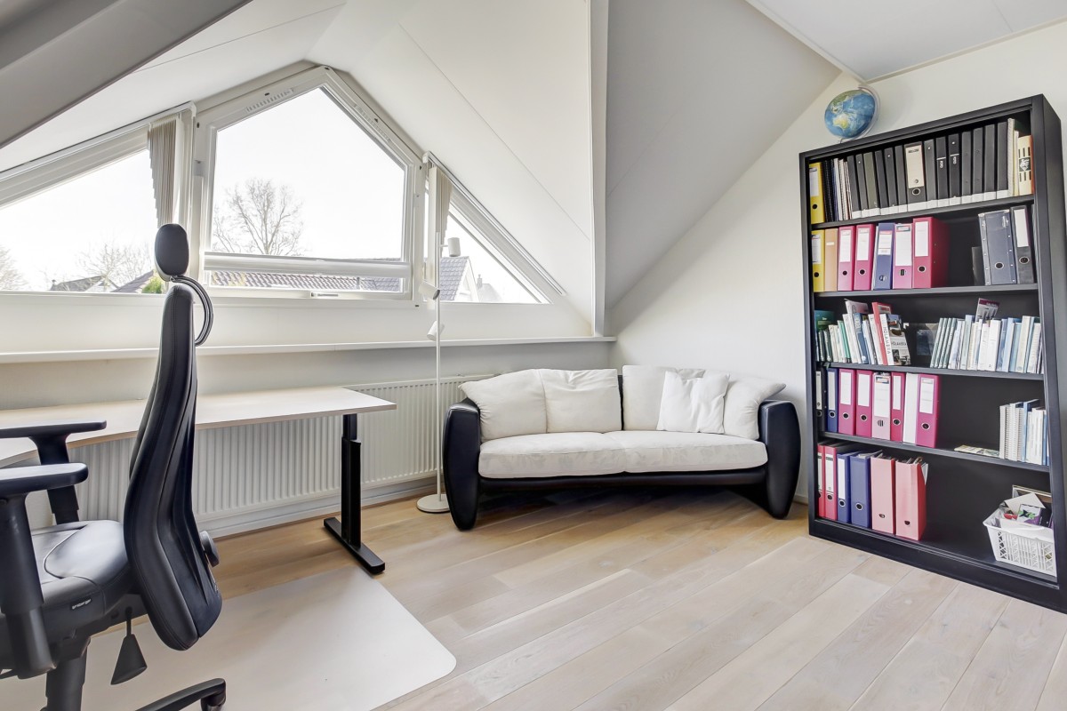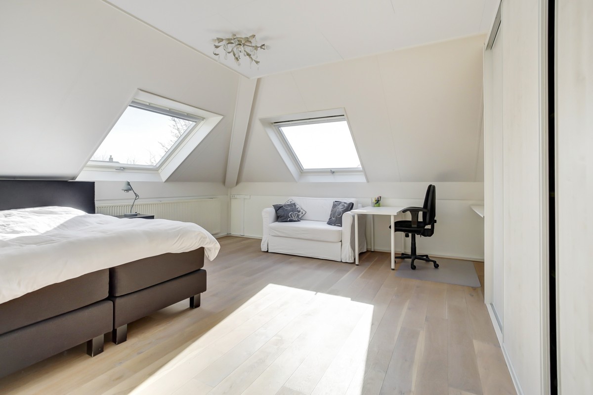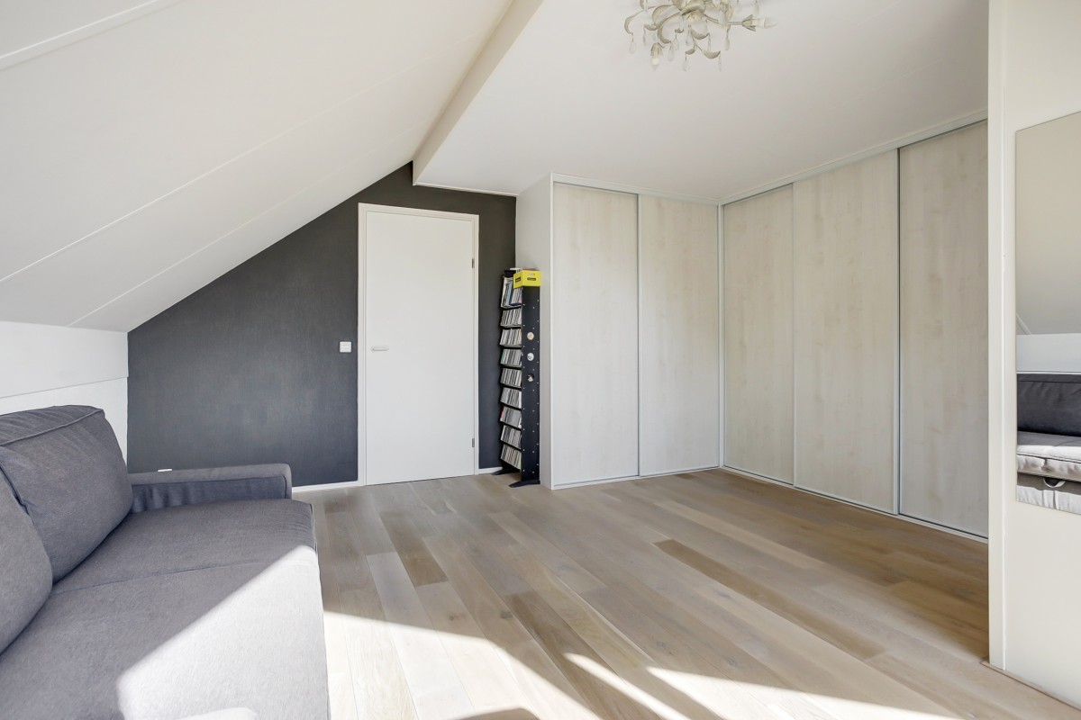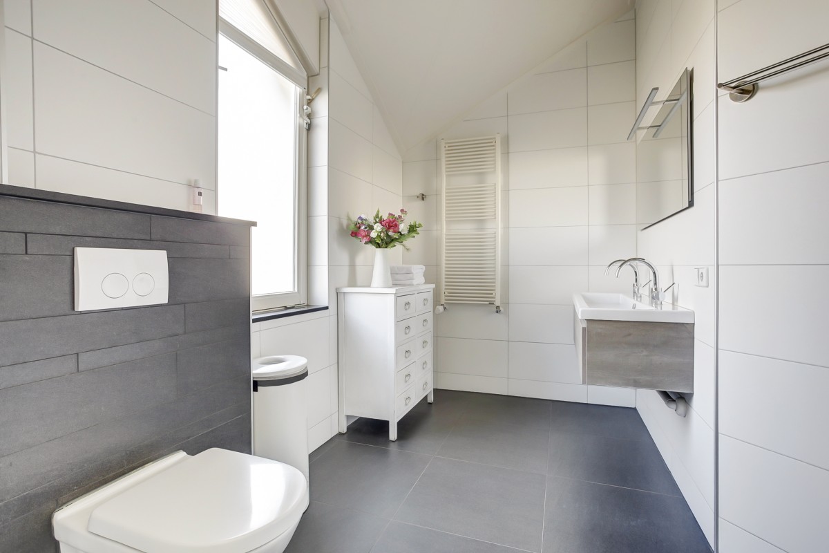 Eerste verdieping: design trap met natuurstenen treden naar de vide/overloop met aansluitend 3 royale slaapkamers voorzien van houten vloer, berging en de luxe tweede badkamer. 2 slaapkamers beschikken over een dakkapel. De tweede moderne badkamer is voorzien van een douche, wastafel, hangcloset en Velux dakraam. Aan de overloop is tevens een diepe berging aanwezig waar de c.v.-ketel (Intergas HR) opgesteld staat.