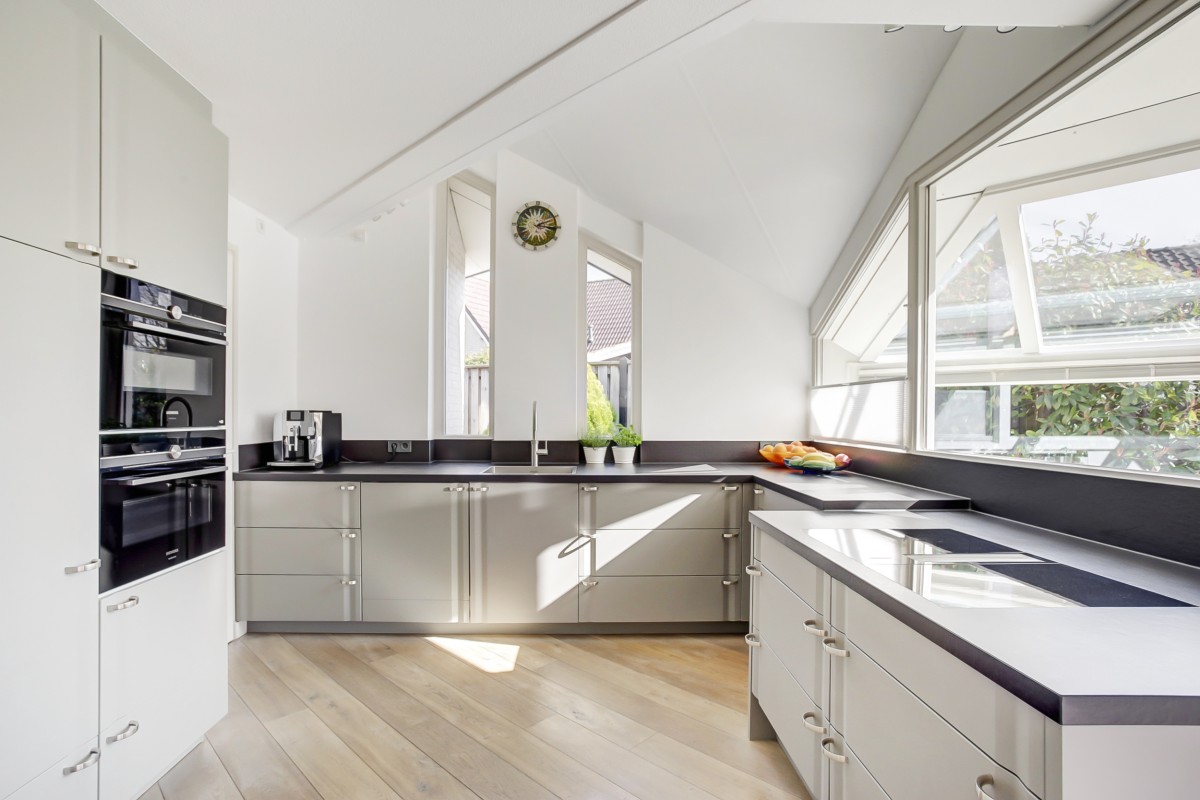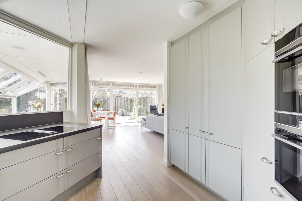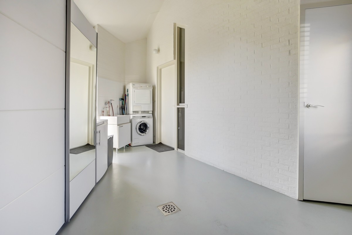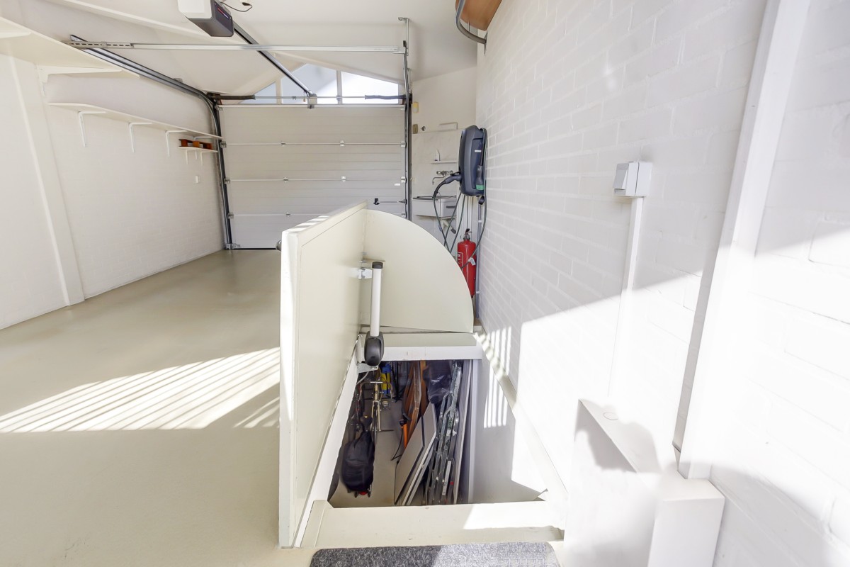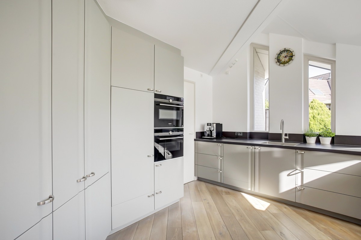 Begane grond: lichte entree met prachtige glaspartij en hoogtewerking. De hal beschikt over een garderobe, uitgebreide meterkast, luxe toiletruimte en design trap naar de vide. Aan de voorzijde van de woning is een ruime slaapkamer gesitueerd met aansluitend een luxe badkamer met vloerverwarming, 2e hangcloset, wastafelmeubel met dubbel wastafel en een inloopdouche. Een loopdeur vanuit de hal geeft toegang tot de inpandige geïsoleerde verwarmde garage. Deze garage heeft een elektrische sectionaaldeur naar de oprit en een loopdeur naar het overdekte terras. Een elektrisch bedienbaar luik geeft toegang tot de kelder welke onder deze garage gelegen is. De lichte living is centraal in de villa gelegen, wat een mooi uitzicht op de achtertuin geeft. De schuifpui biedt tevens toegang tot het overdekte terras. Middels een tweede schuifpui is de prachtige serre van maar liefst 10 meter breedte bereikbaar. Ook deze serre biedt toegang tot het terras. Aansluitend is de luxe Poggenpohl keuken gelegen welke beschikt over een groot Dekton (Sirius Solid) werkblad, veel kastruimte en een ingebouwde koelkast, combi-oven, oven, Quooker, vaatwasser, Bora Classic 2.0 inductiekookplaat met afzuiging. Vanuit de keuken is toegang tot de betegelde bijkeuken en tweede inpandige geïsoleerde en verwarmde garage met vrije hoogte, elektrische sectionaaldeur, loopdeur en spoelbak met warm en koud water. Een washoek beschikt over een wasmachine- en drogeraansluiting.