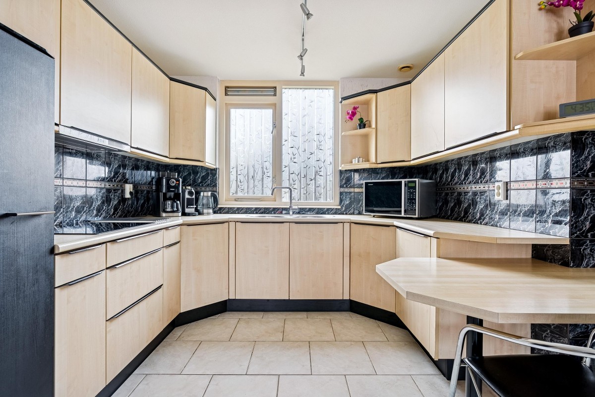 De open keuken in U-vorm is perfect voor gezelligheid! Er is genoeg ruimte voor een flinke eettafel, waar je kunt borrelen, eten en genieten van elkaar. De keuken is van alle gemakken voorzien: een vaatwasser, koelkast, inductiekookplaat en dubbele wastafel maken koken een waar plezier.