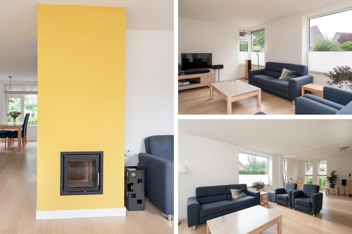 Entree, hal met modern hangend toilet, trapopgang en meterkast. Aan de voorzijde bevindt zich over de volle breedte van de woning de sfeervolle woonkamer met een accumulerende lemen houtkachel (2016) en veel lichtinval door de vele ramen.