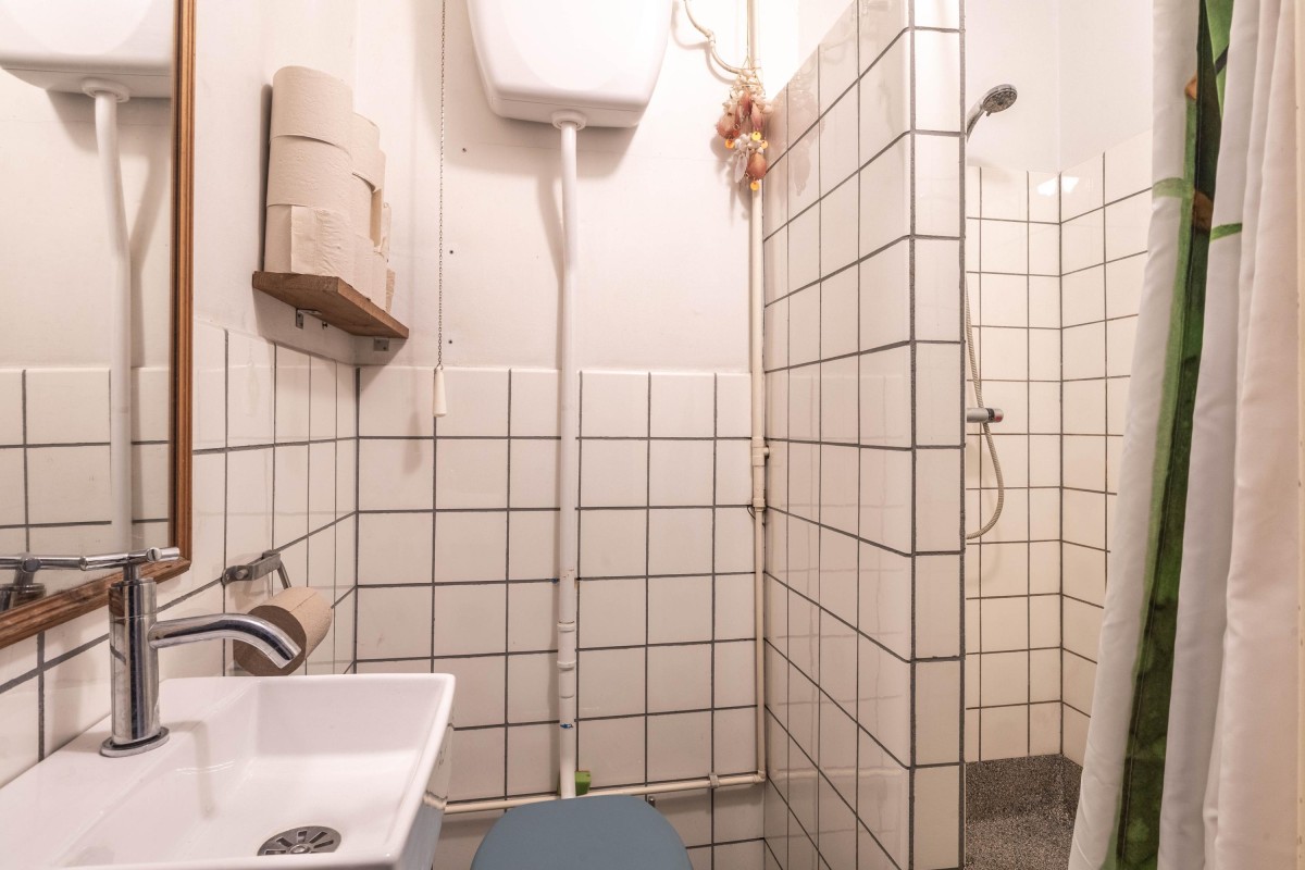 Finally, the apartment includes a study on the attic floor. This room is equipped with a sink, making it suitable for various uses. Additionally, there is a small storage room on this floor, which houses the washing machine connection. There is also a shared toilet on this floor, available for use by other residents of the building.
